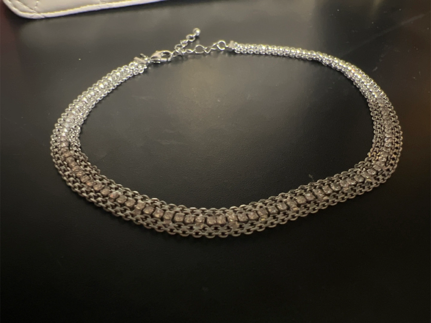 Silver tone multi-strand necklace. Features clear rhinestone accents. Elegant choker style.