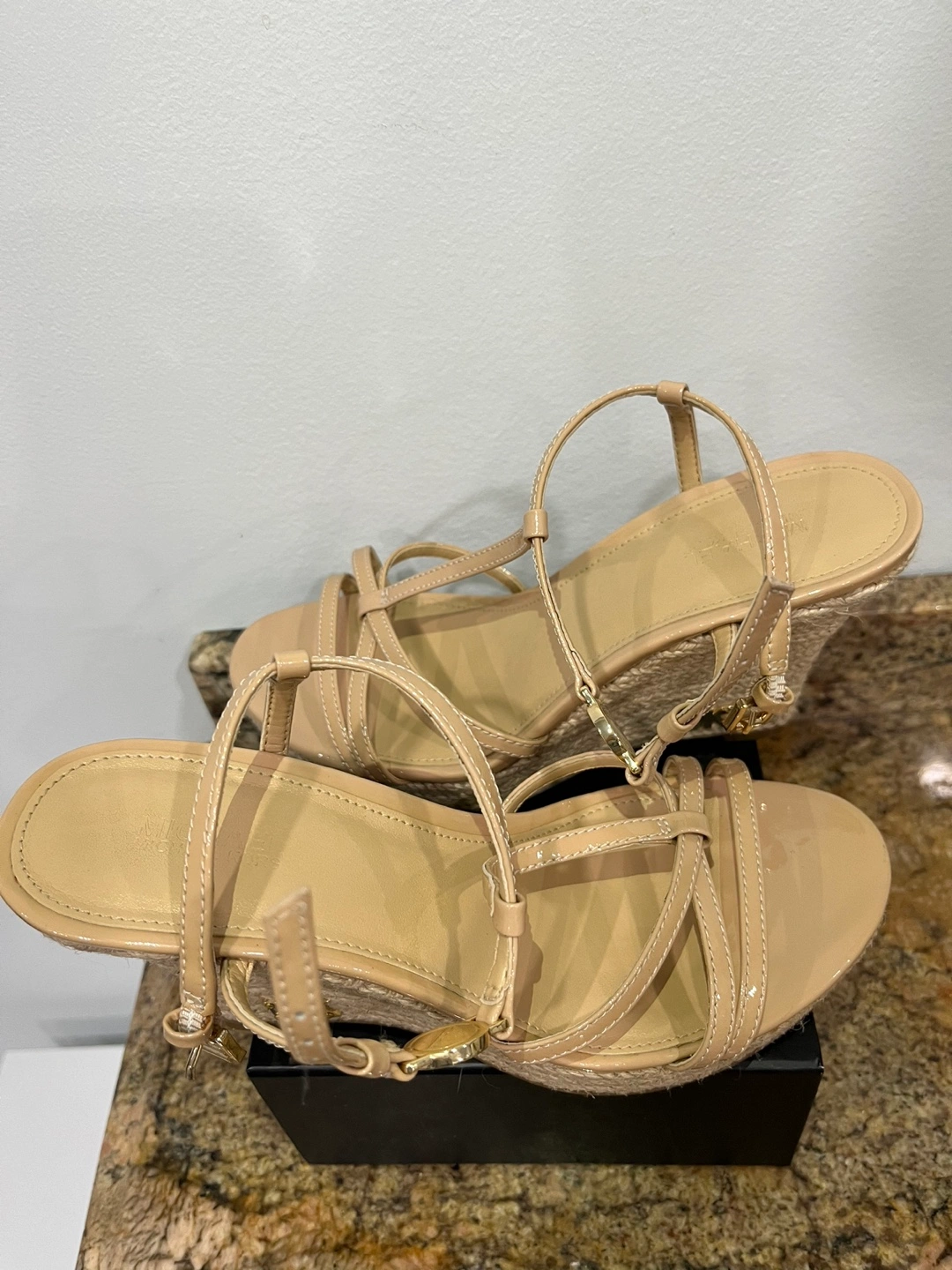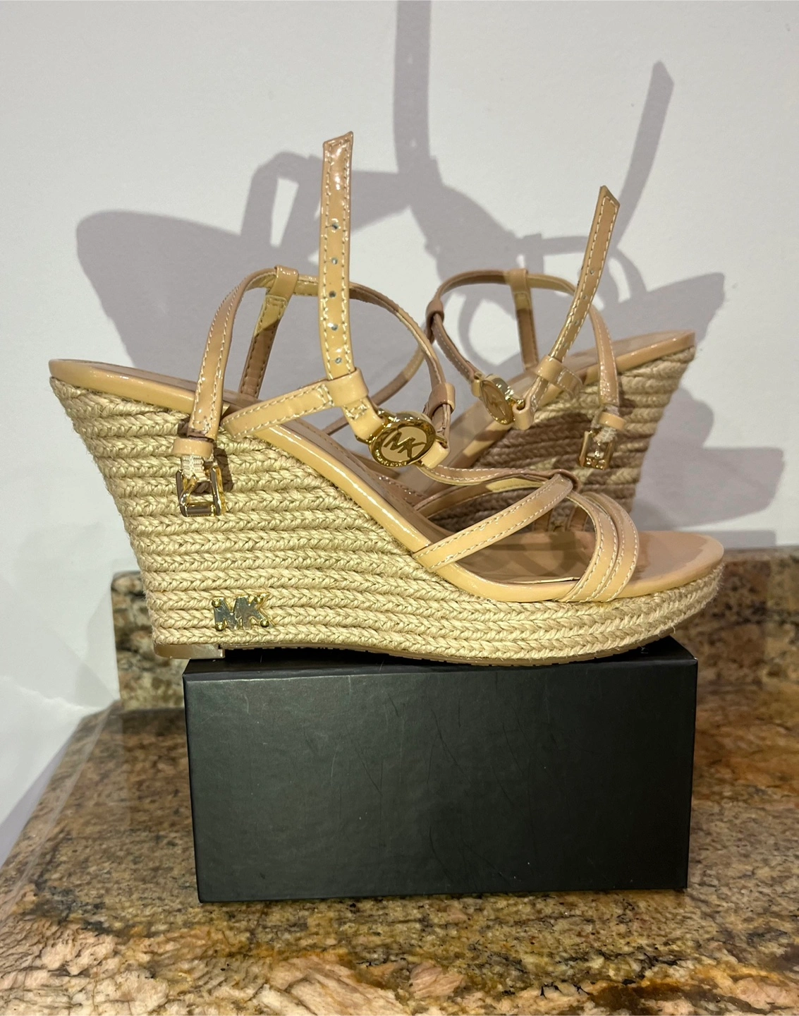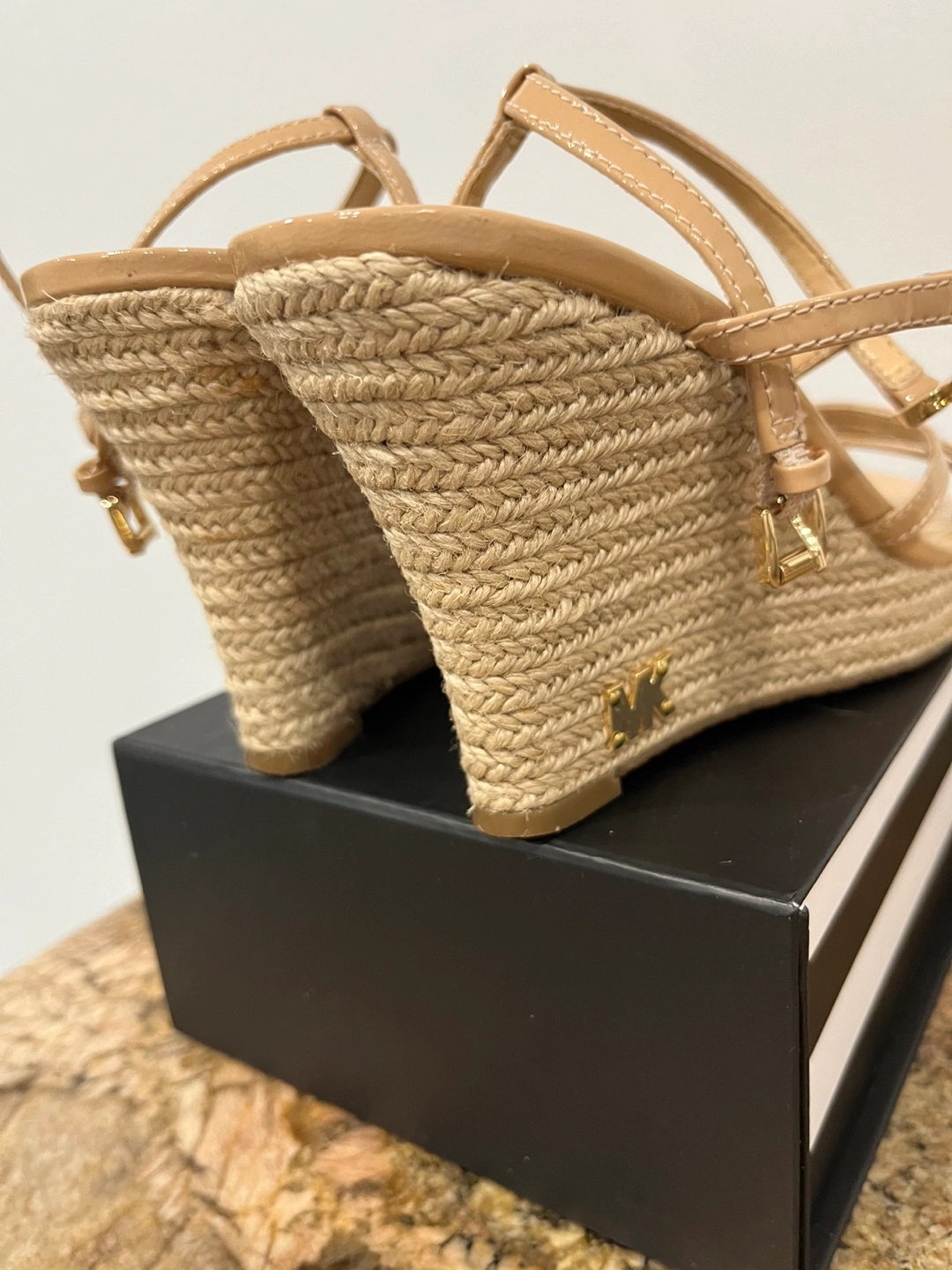 Beautiful nude patent leather Michael Kors wedge sandals. Features multiple straps and a woven jute wedge heel. Were worn once indoors. Like new condition.