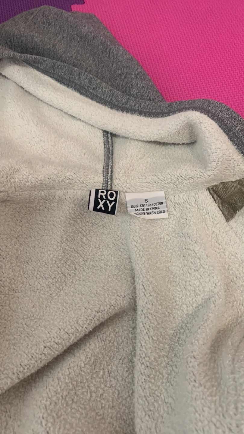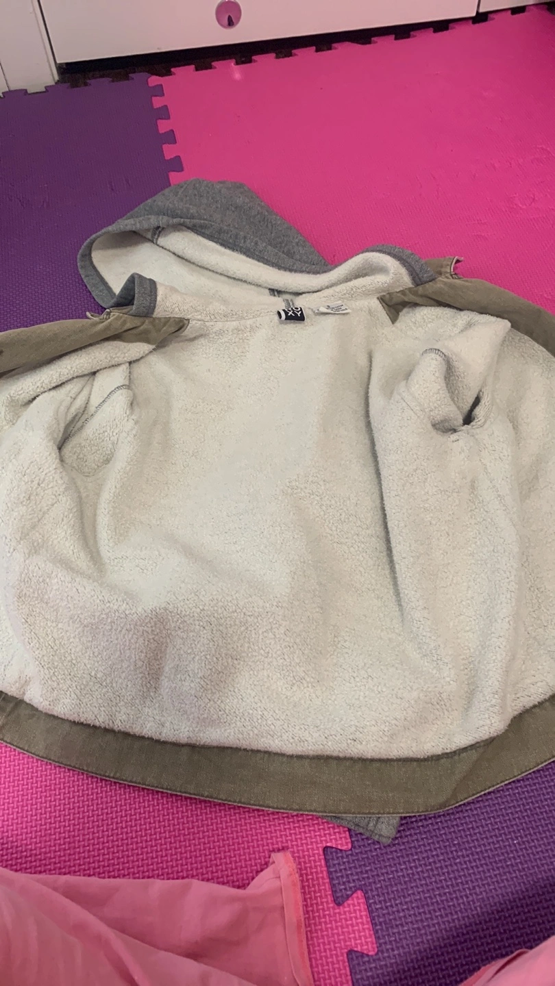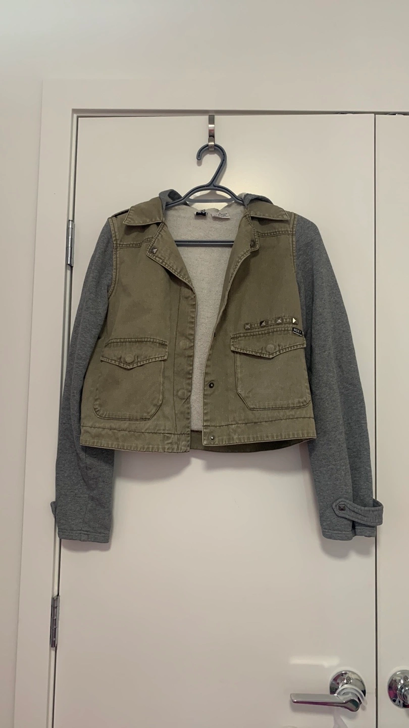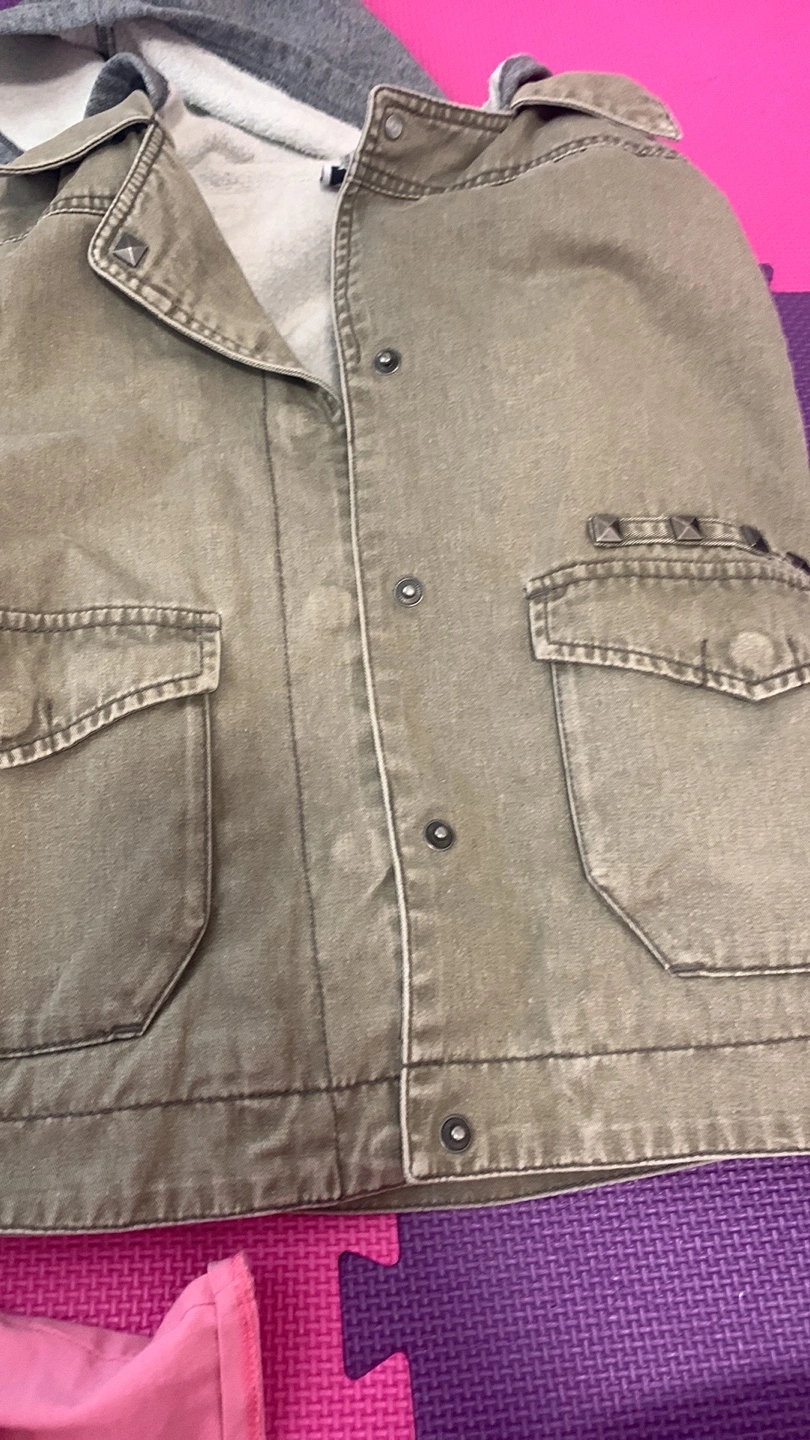 Olive green denim jacket. Grey hooded sleeves. Button closure. Two front pockets. Small metal studs on shoulders. Fleece interior lining. Size small. Machine wash cold.