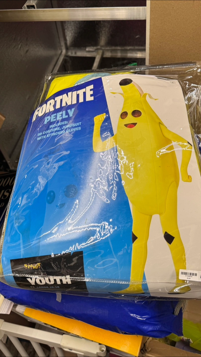 Spirit Halloween Fortnite Peely costume. Includes jumpsuit with attached gloves. Youth size large 12-14.