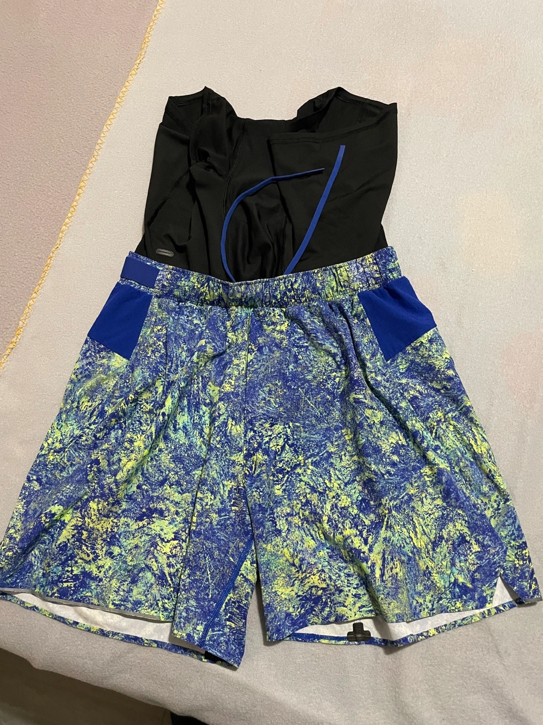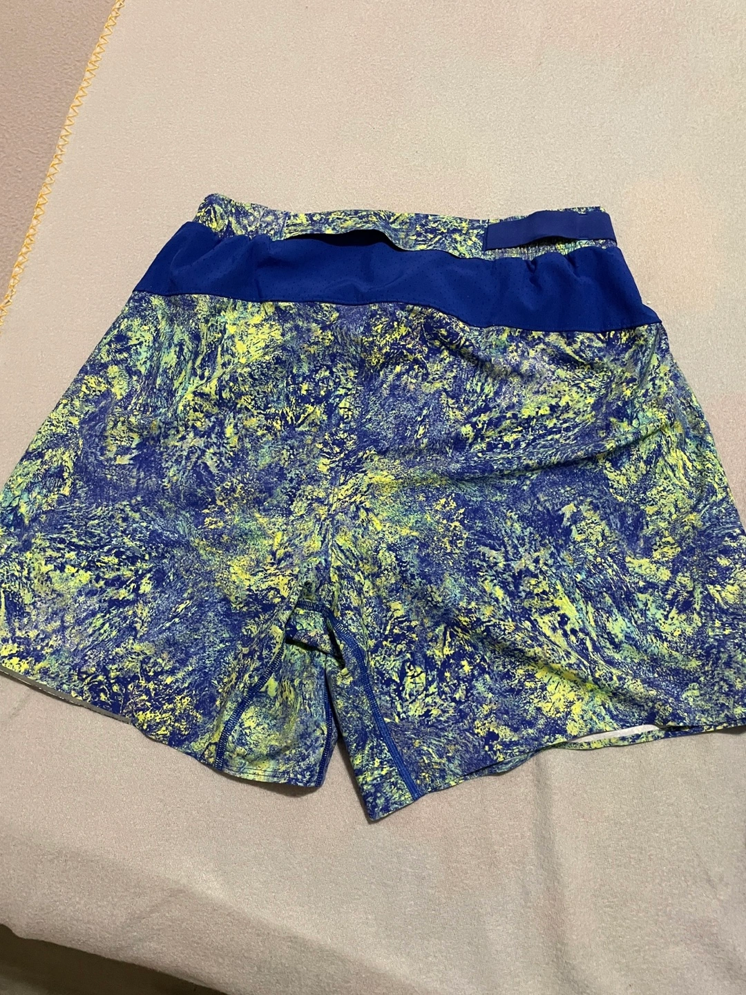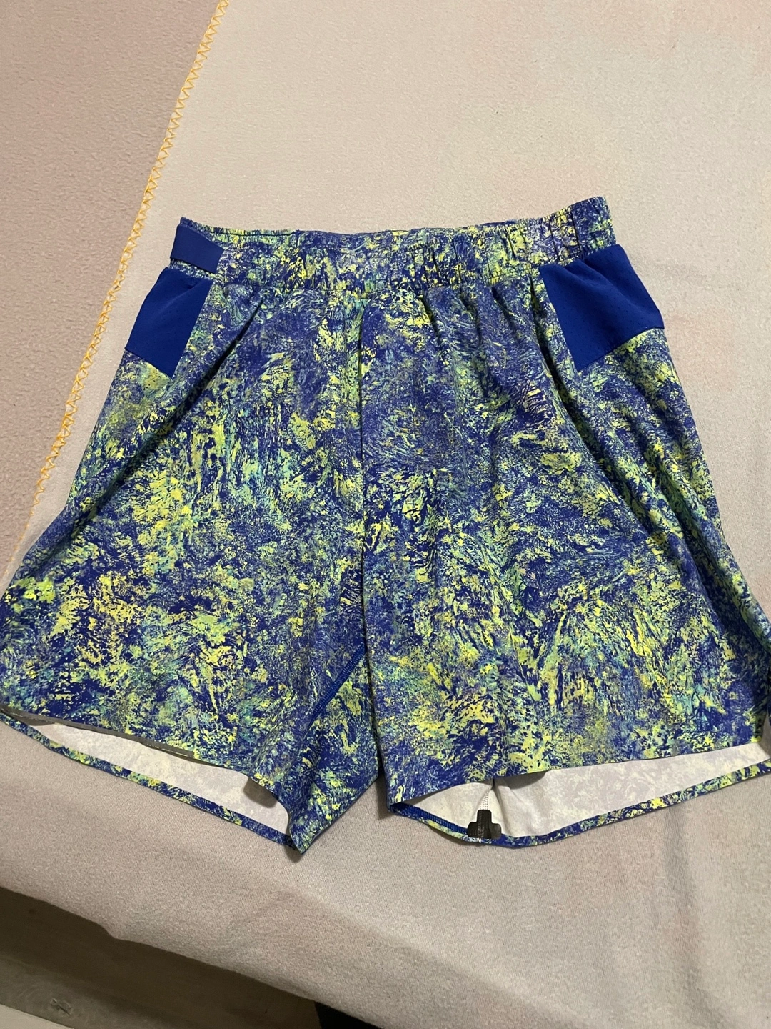 Men's athletic running shorts. Blue, yellow, and green abstract print shorts. Lightweight and breathable fabric. Perfect for workouts or casual wear. Medium size for mens.
