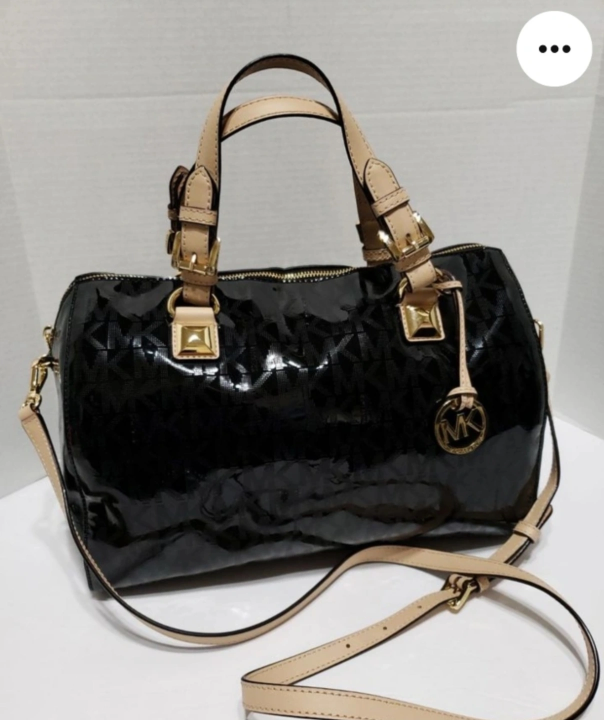 Stylish black patent satchel. Features an MK logo, beige accents, gold hardware, and a detachable strap (brand new) and long wallet