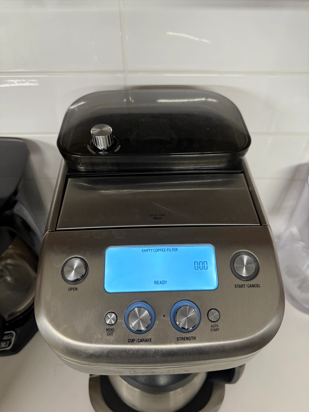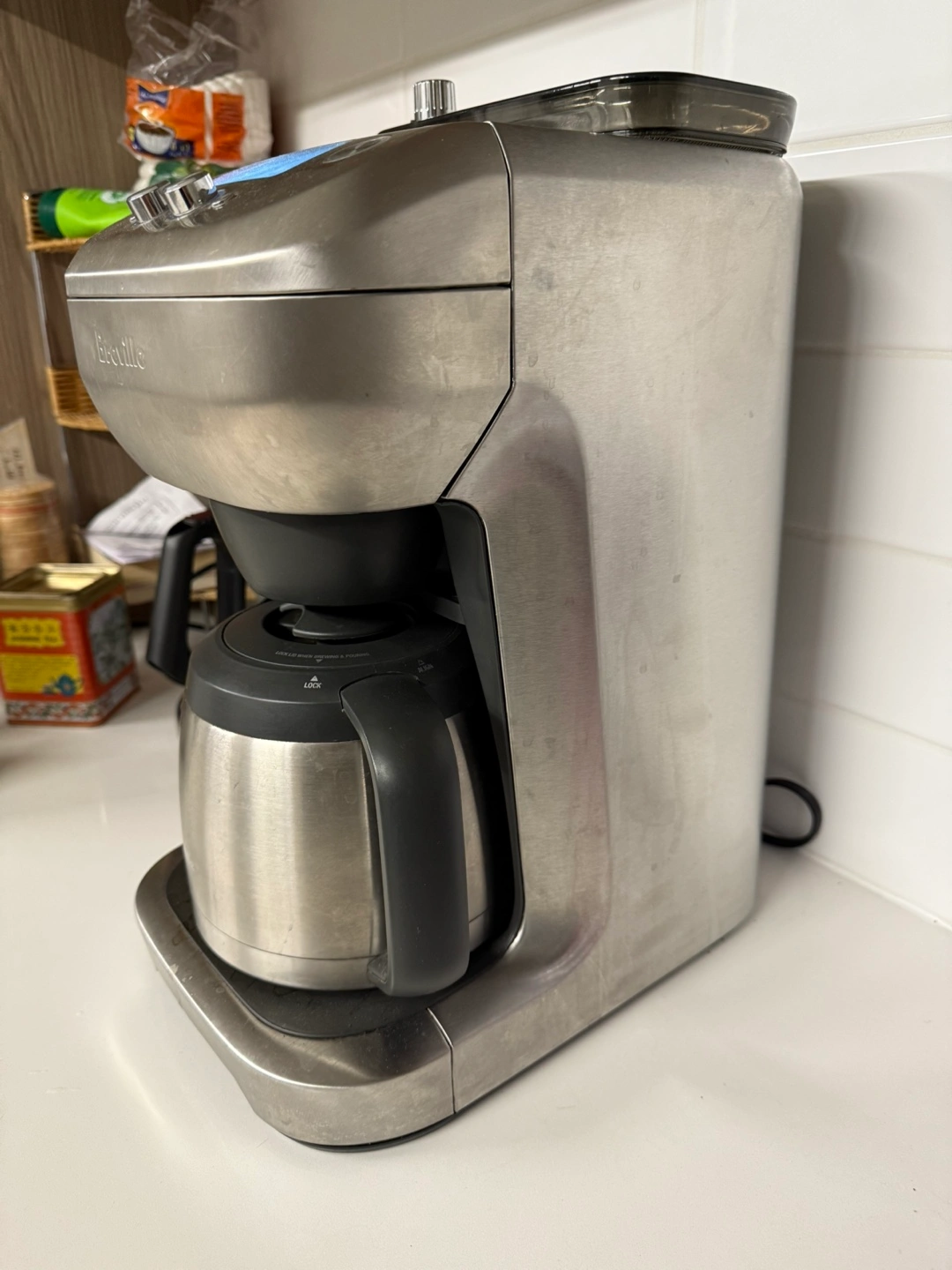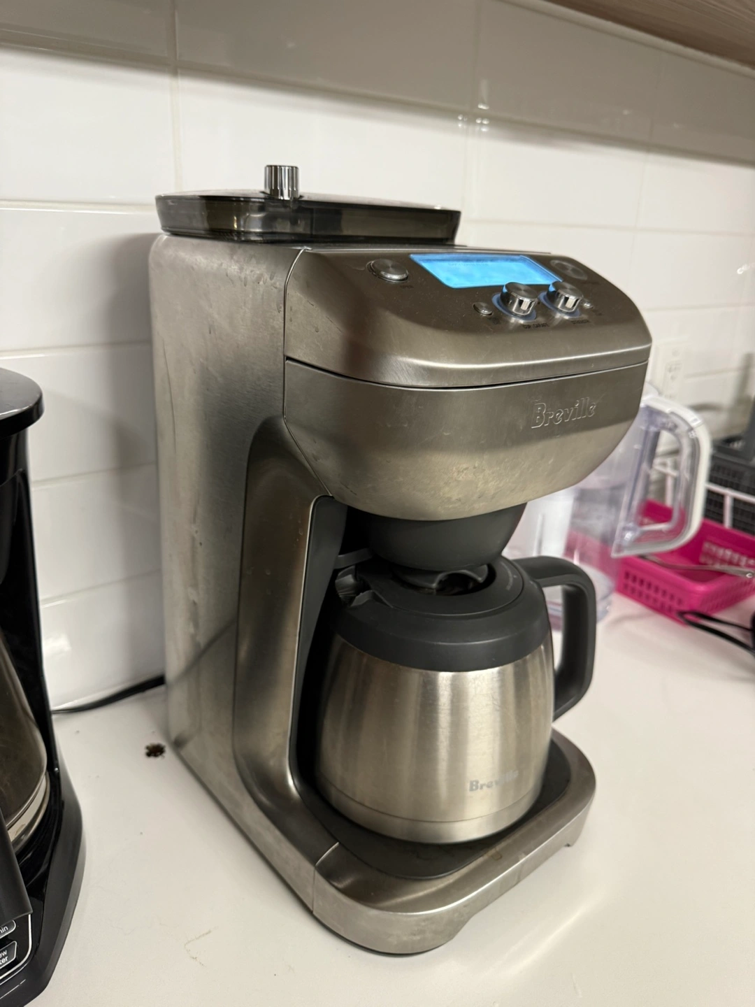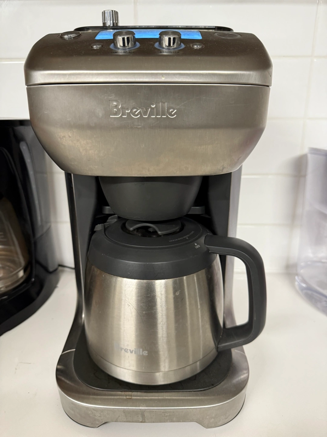Stainless steel coffee maker. Features digital controls, thermal carafe, and adjustable settings. Used condition.
