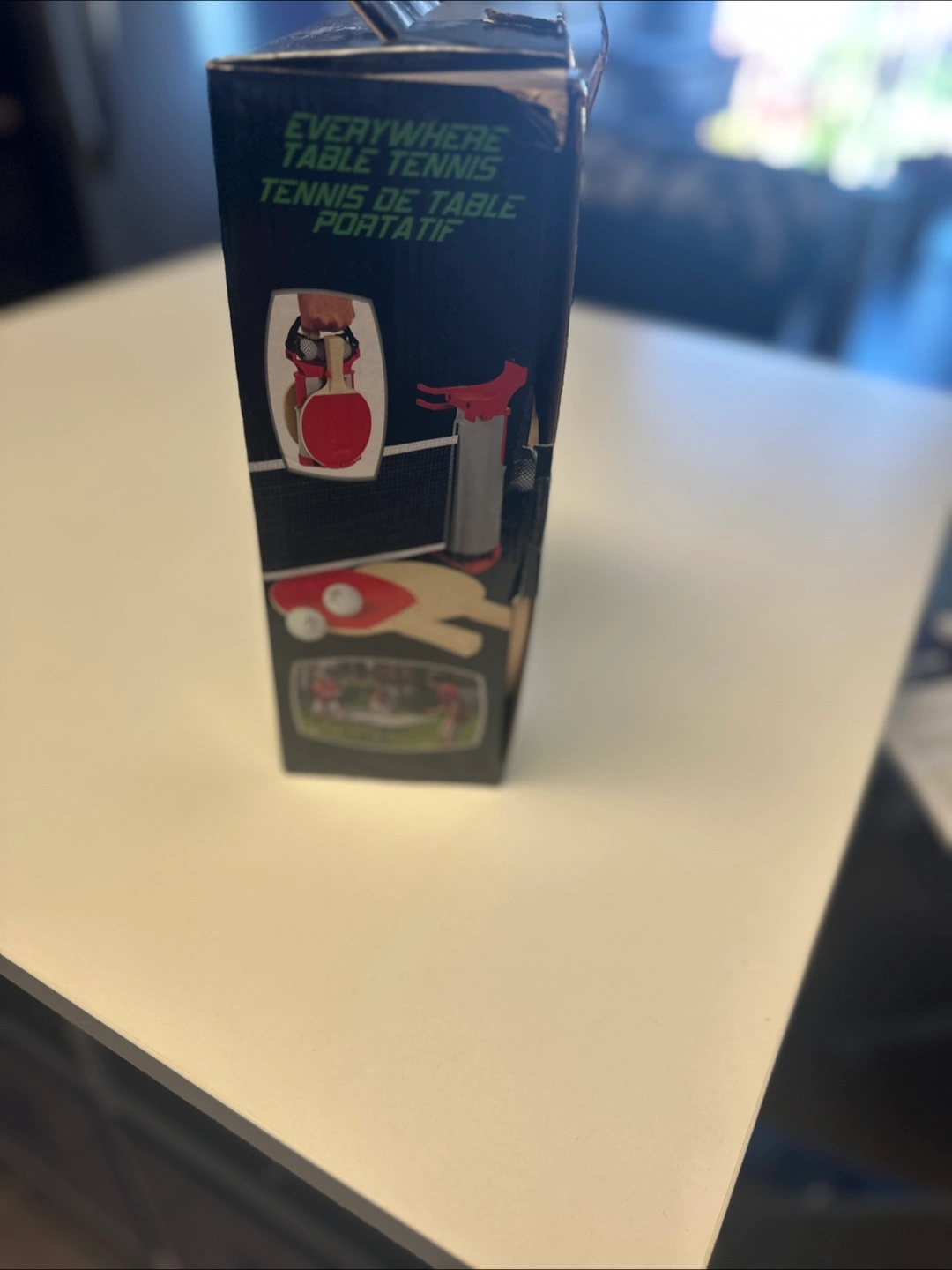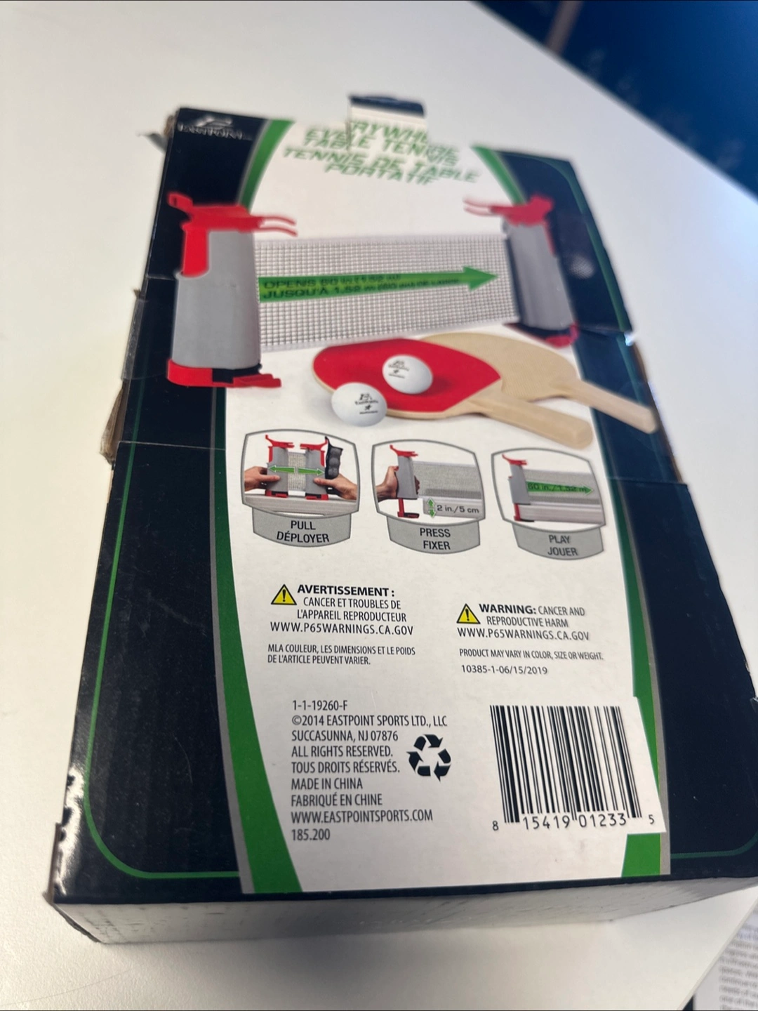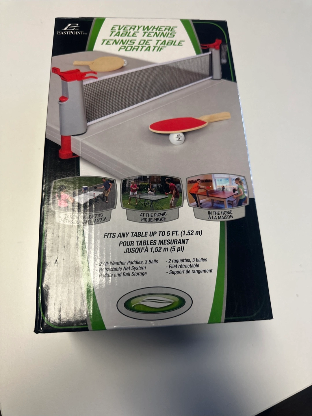 Portable table tennis set. Includes two paddles, three balls, and a retractable net. Fits tables up to 5 feet. Great for indoor or outdoor use. Easy to store.
