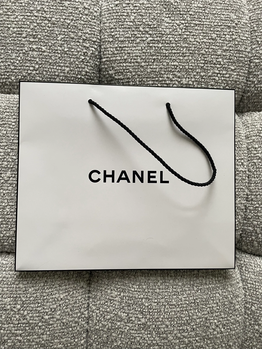 White paper shopping bag. Black logo and handles. Excellent condition.
