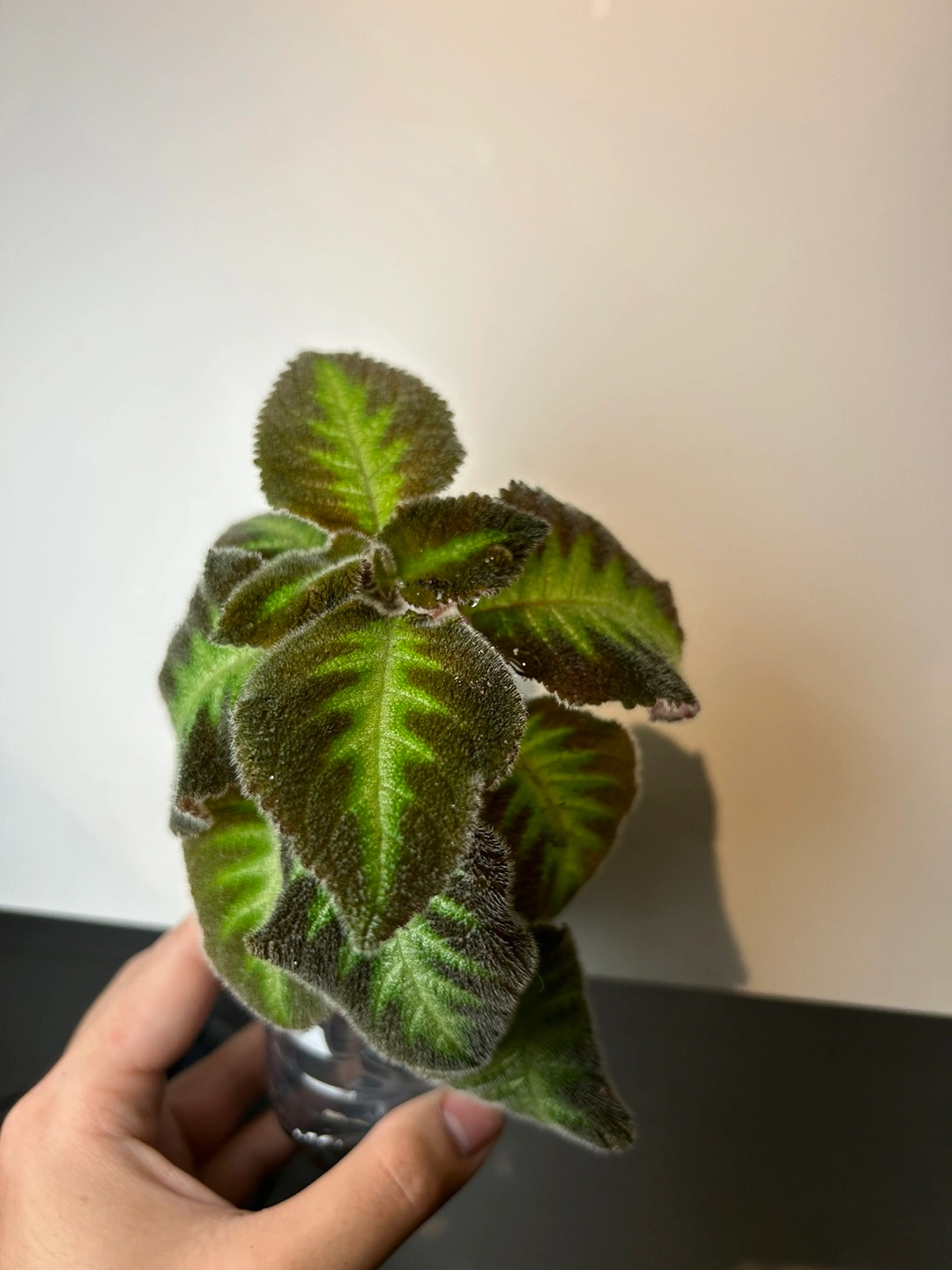 Velvety leaves, dark green and reddish-black. Perfect for a terrarium or small pot. Bigger one $10 Small one $5
