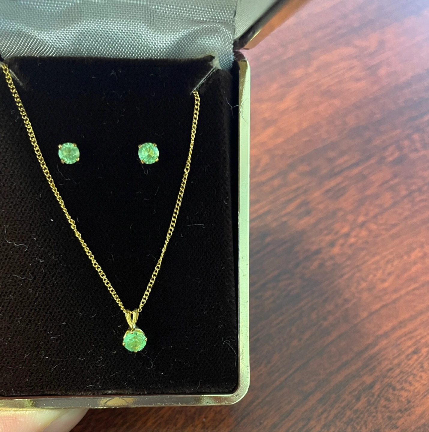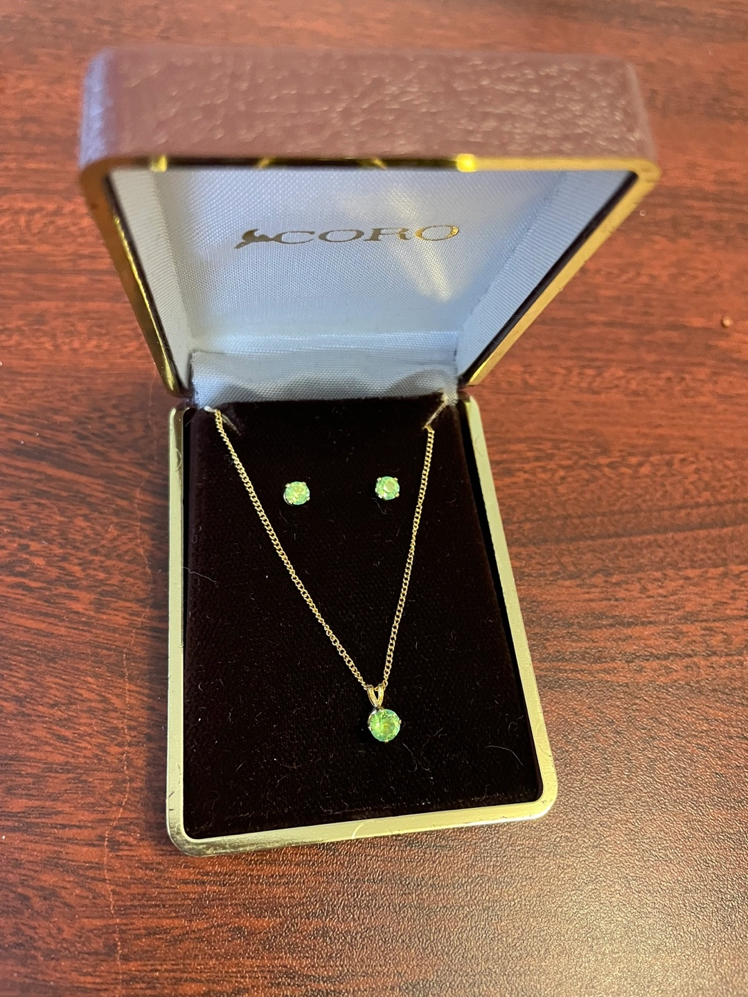 Beautiful Coro jewellery set. Features a delicate gold chain necklace and matching stud earrings. Light green stones. Presented in original box.