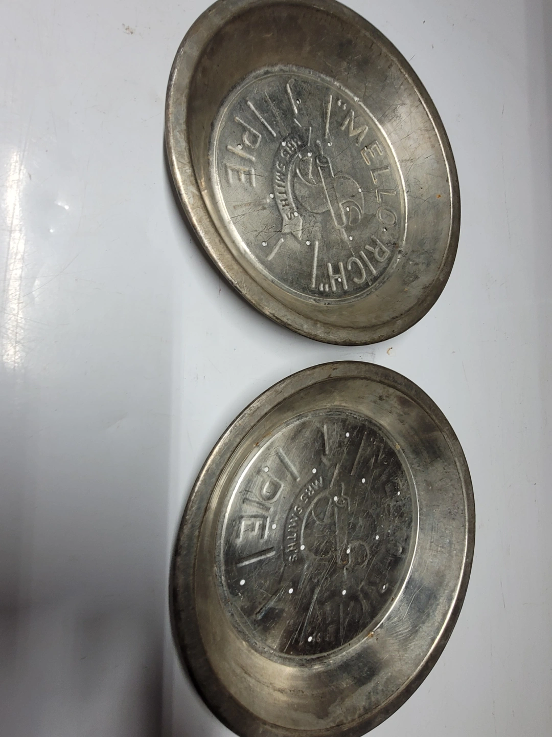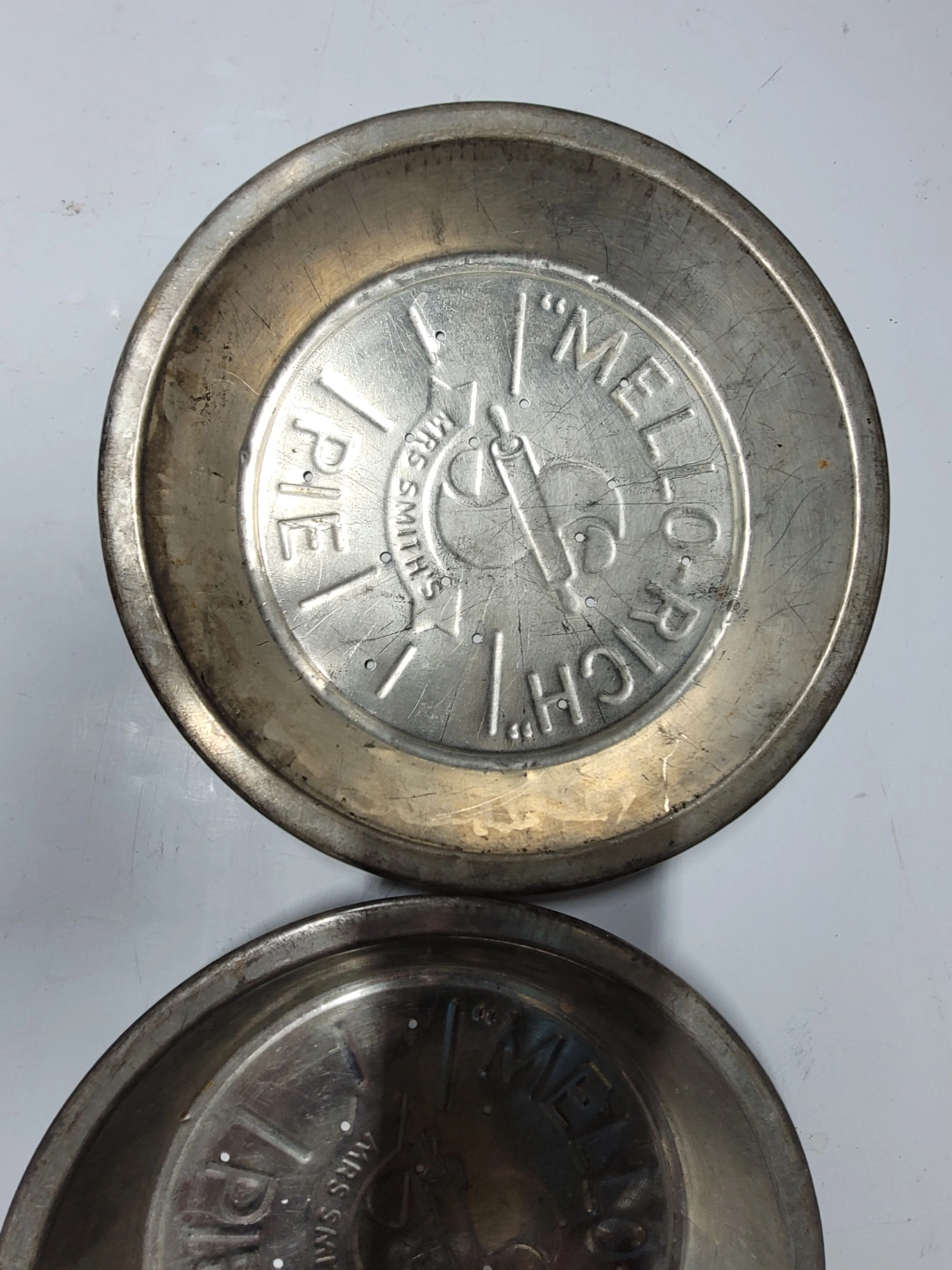 Two vintage Smith's Melrich pie plates. Metal construction. Shows signs of age and wear. Great for collectors or vintage bakers.