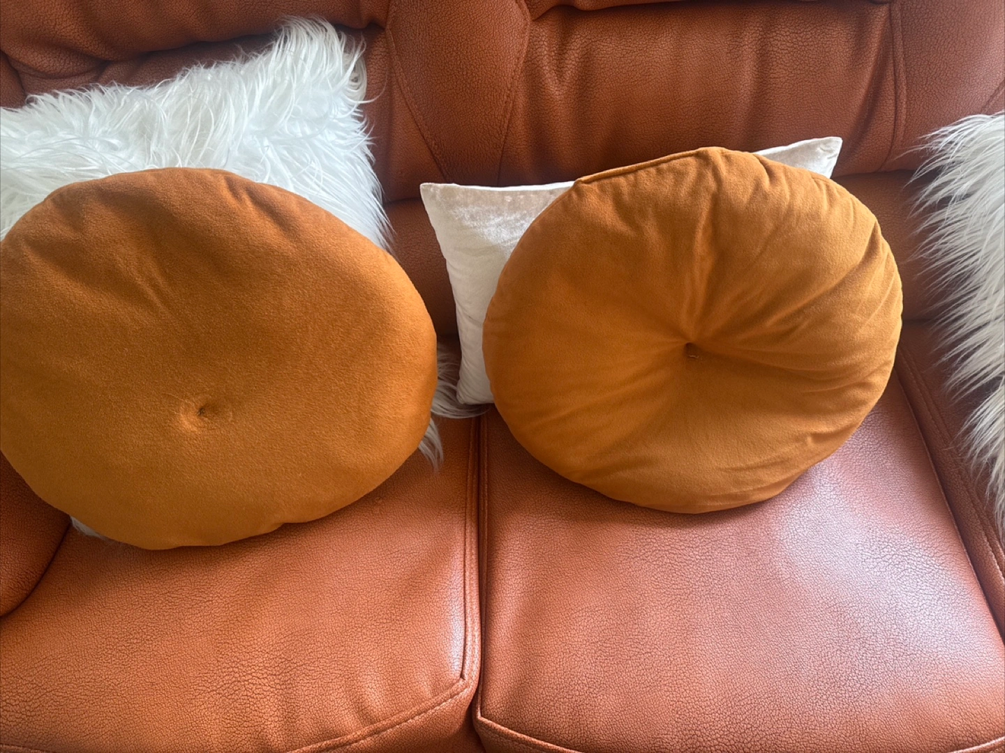 Set of five round throw pillows. Mustard yellow colour. Soft fabric. Perfect for adding a pop of colour to your living room.Button at the centre got ripped off so I took all of them off to make them Look uniform ,they look ok without centre buttons. I can give you bundle deal if you buy all four
