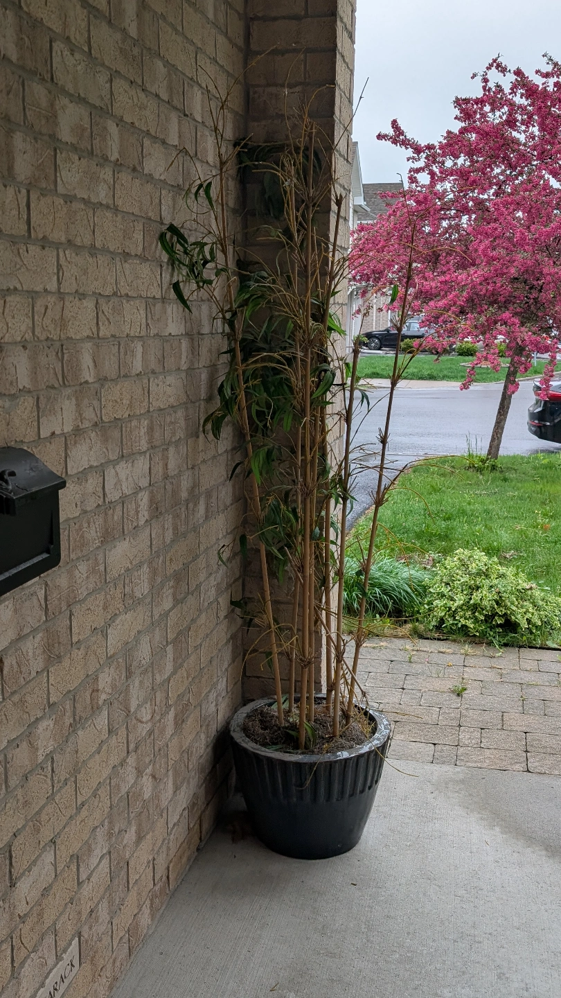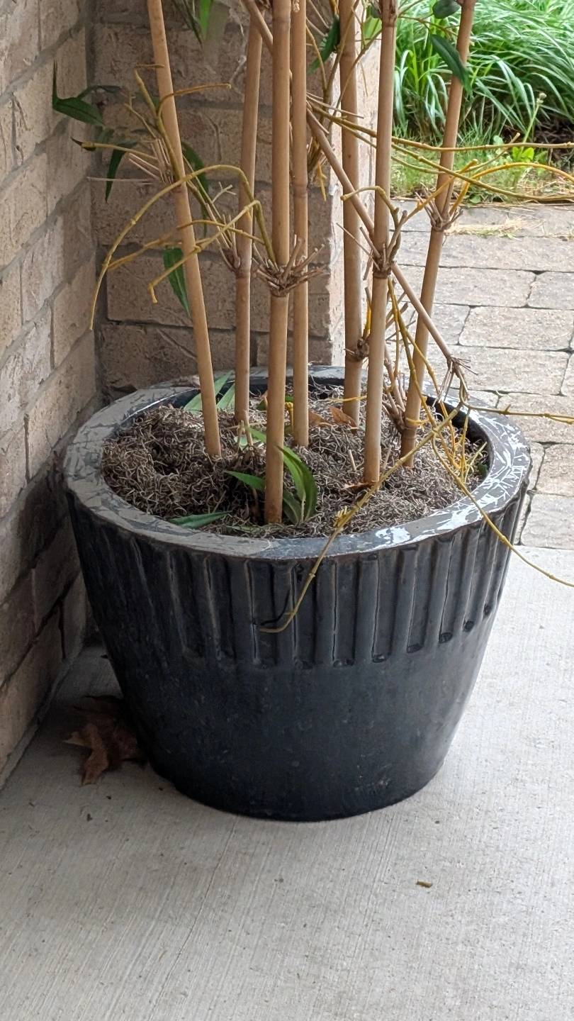 Large, dark grey/black ceramic planter. Vertical ribbed detailing. Houses a fake plant. most leaves have fallen due to a storm porch pick up