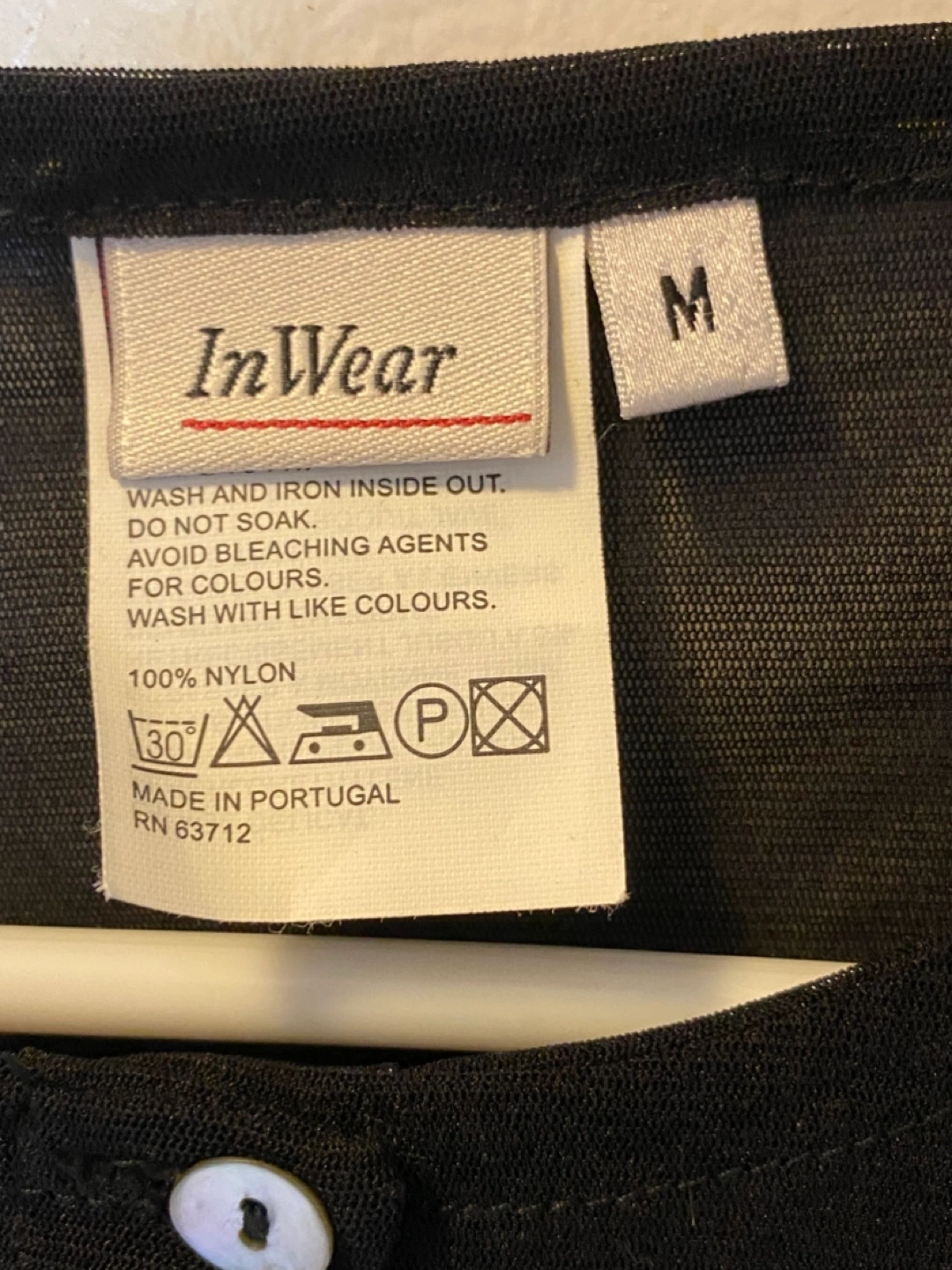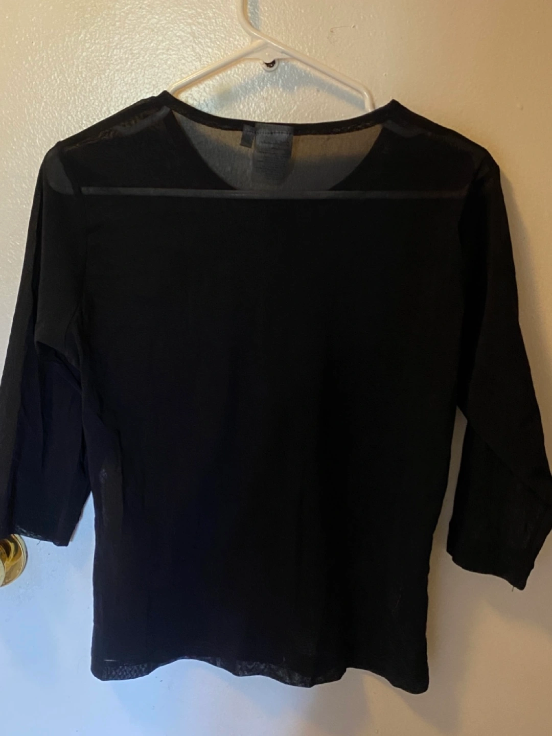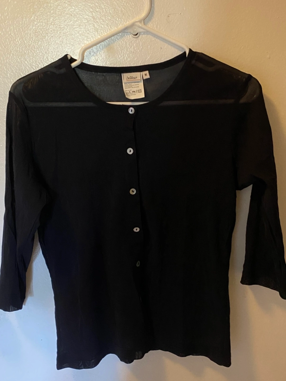 Black sheer button-up top. Three-quarter sleeves. Size medium.