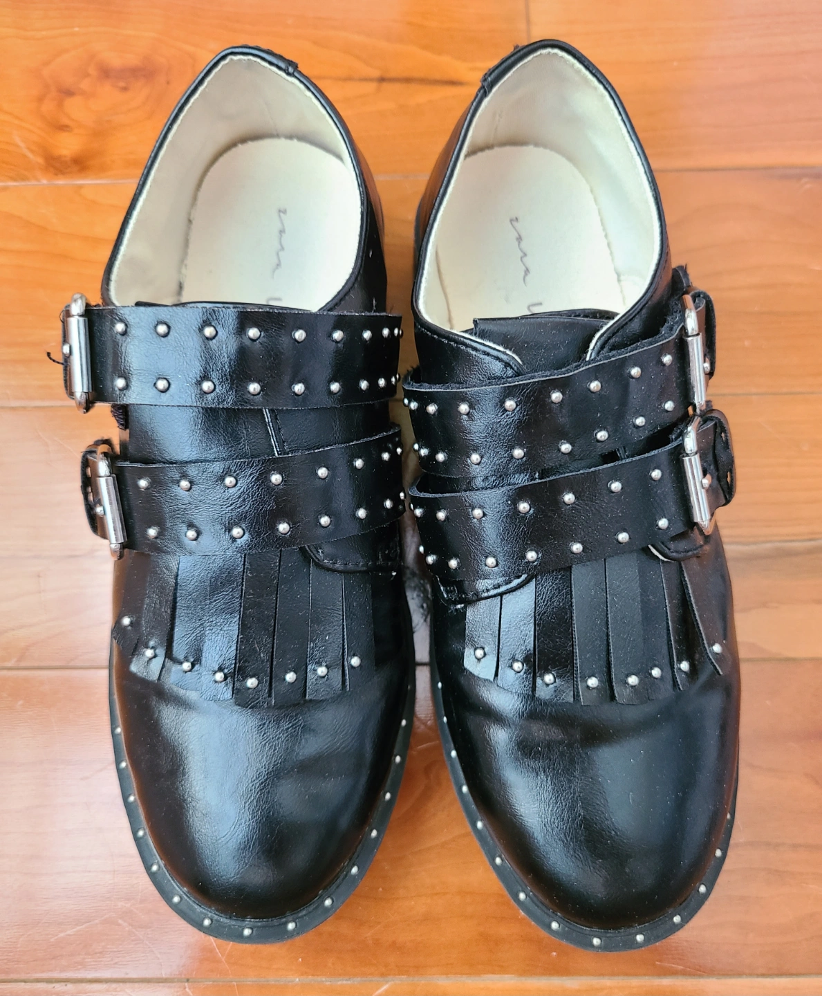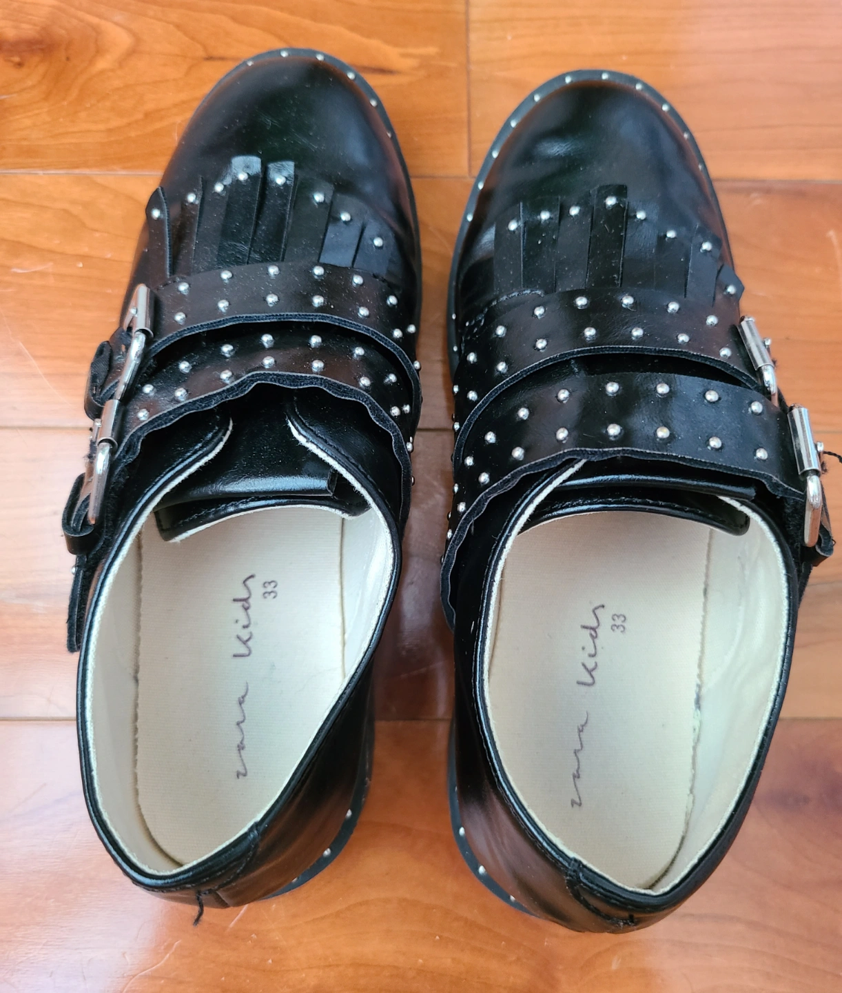Black leather-look shoes. Double buckle straps. Silver stud detailing. Size 33.