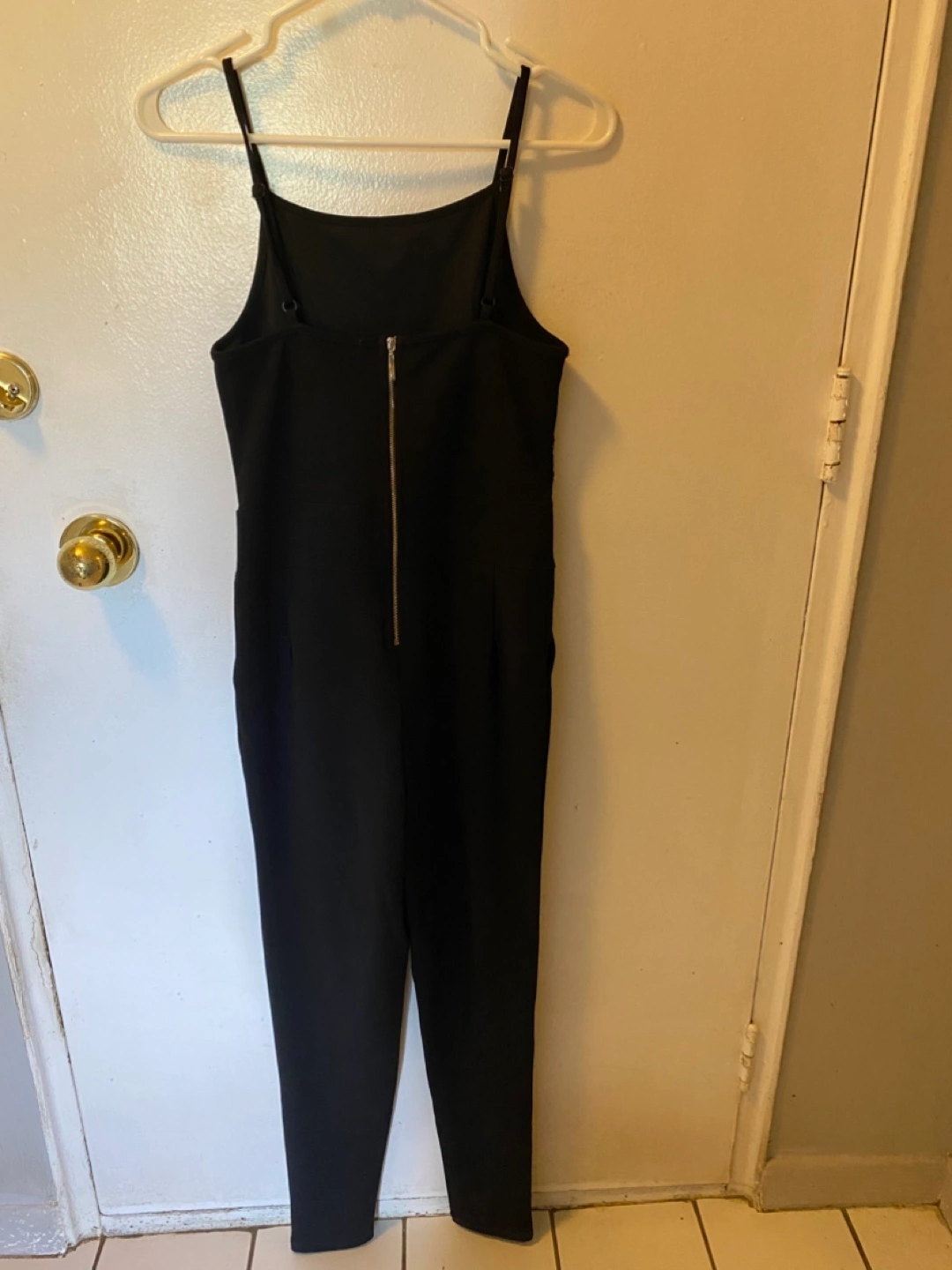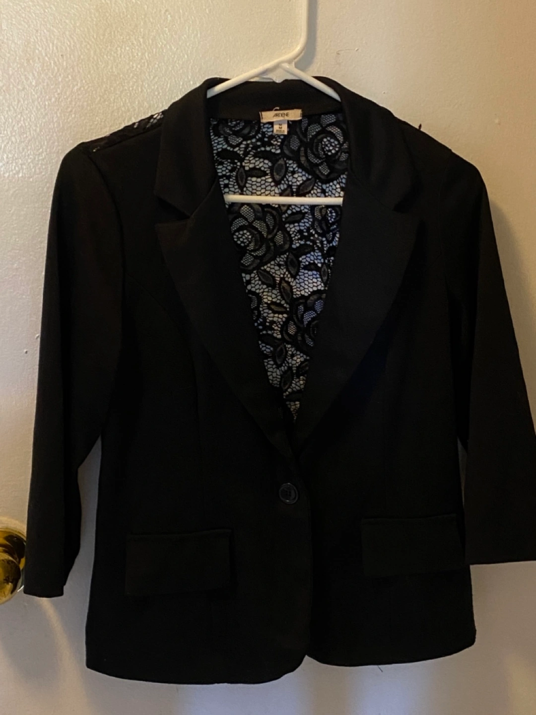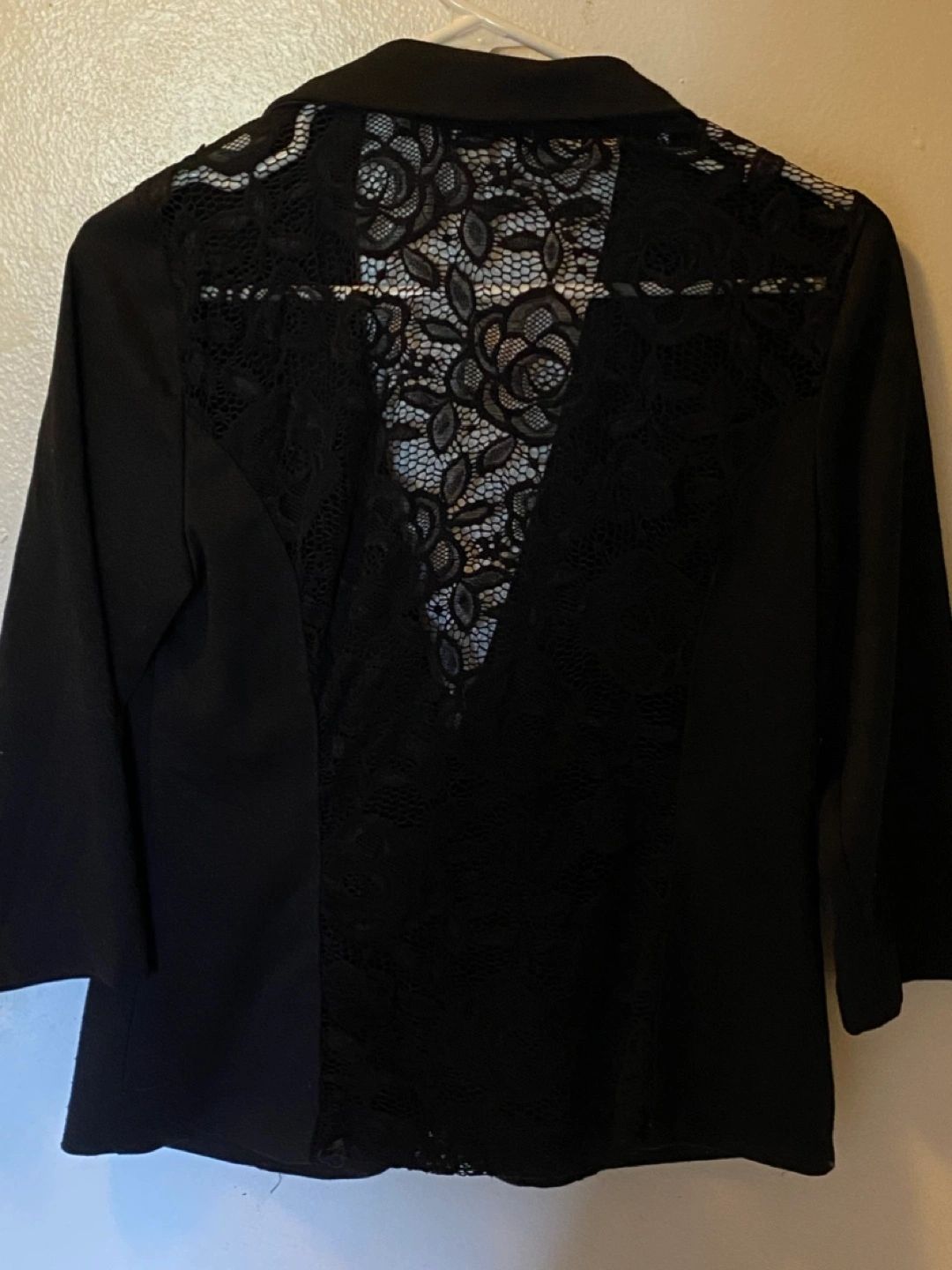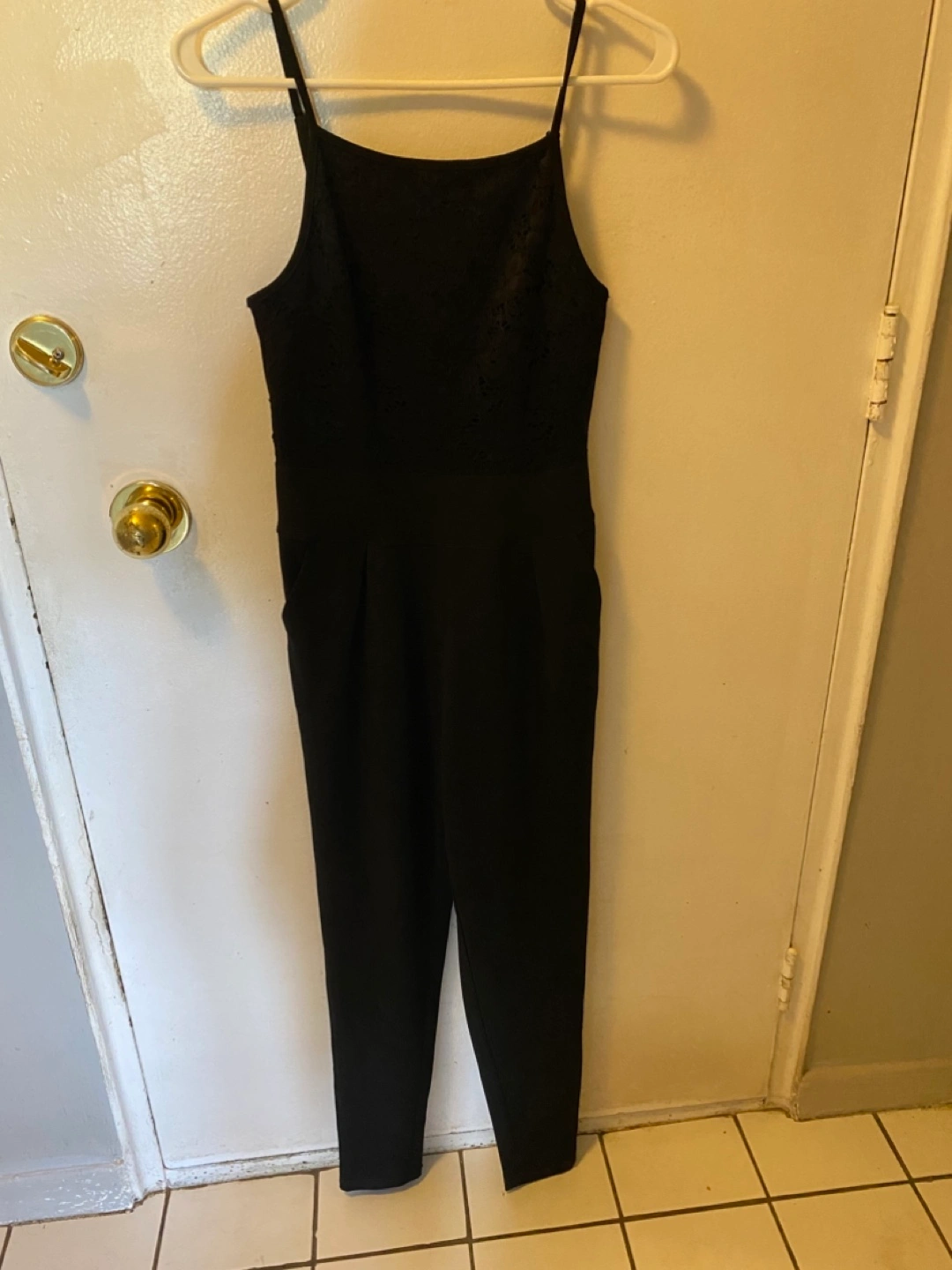 Black jumpsuit, size small. Features a lace overlay on the bodice. Back zipper closure. Two pockets. Matching blazer with a lace back size medium.
