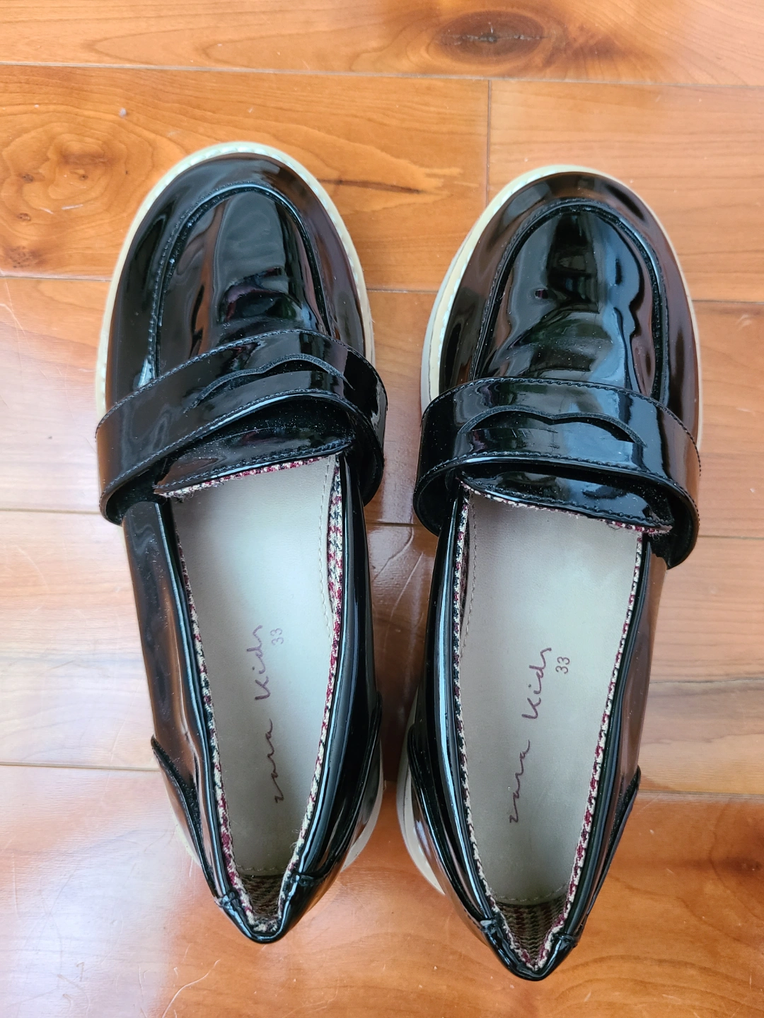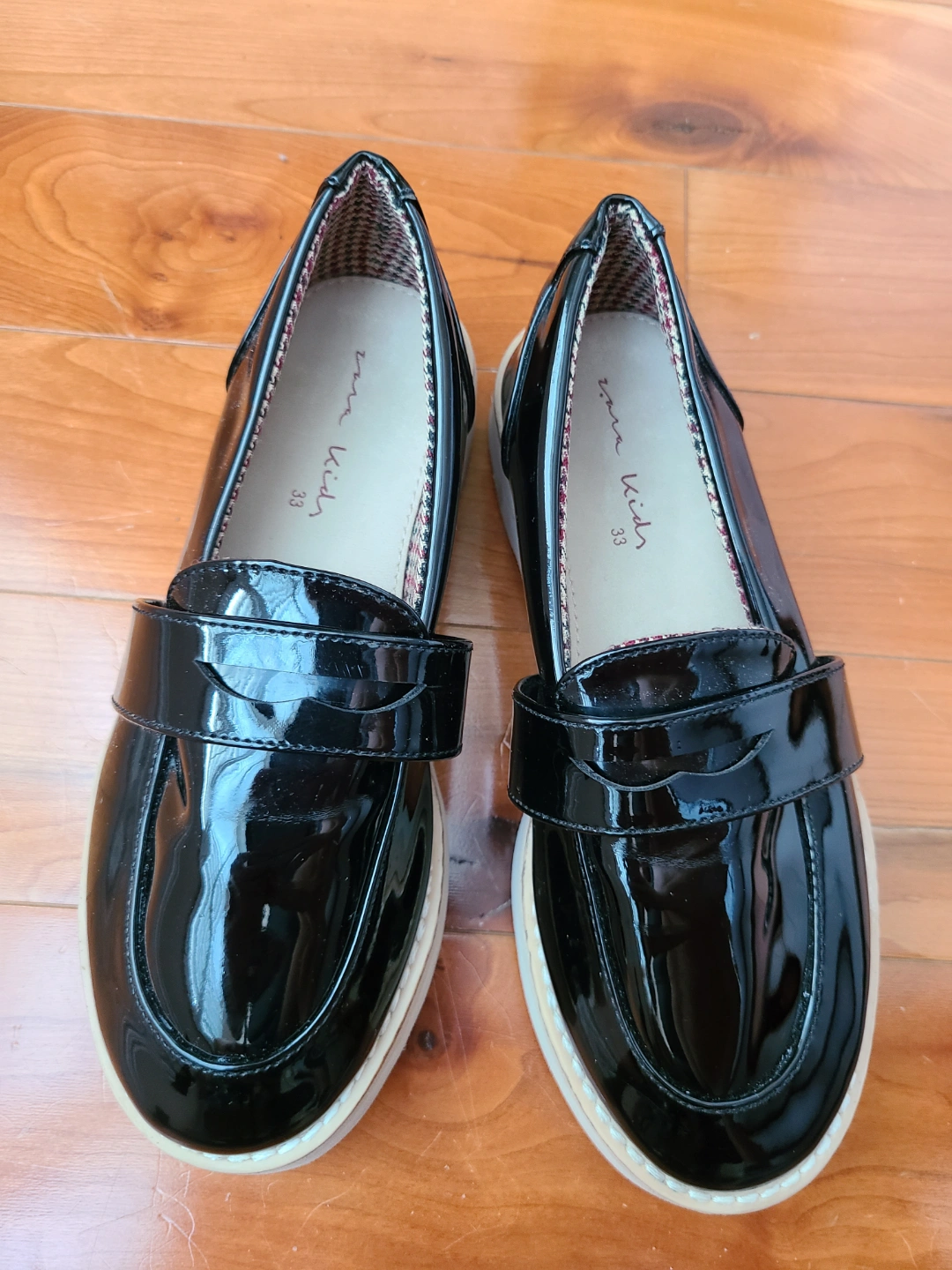 Pair of black patent leather loafers. Size 33. Slight platform sole. Good condition.