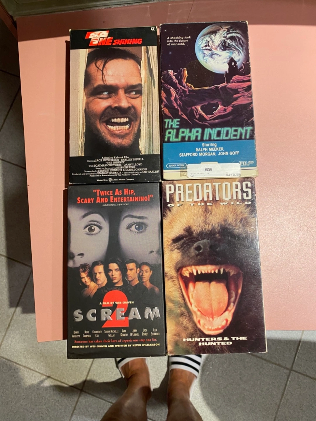 Collection of four VHS tapes. Includes The Shining, The Alpha Incident, Scream 2, and Predators of the Wild. Great for collectors.