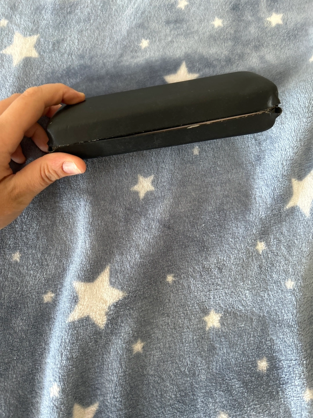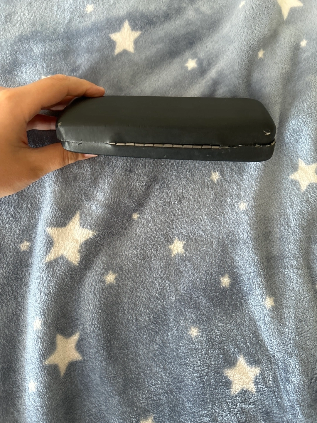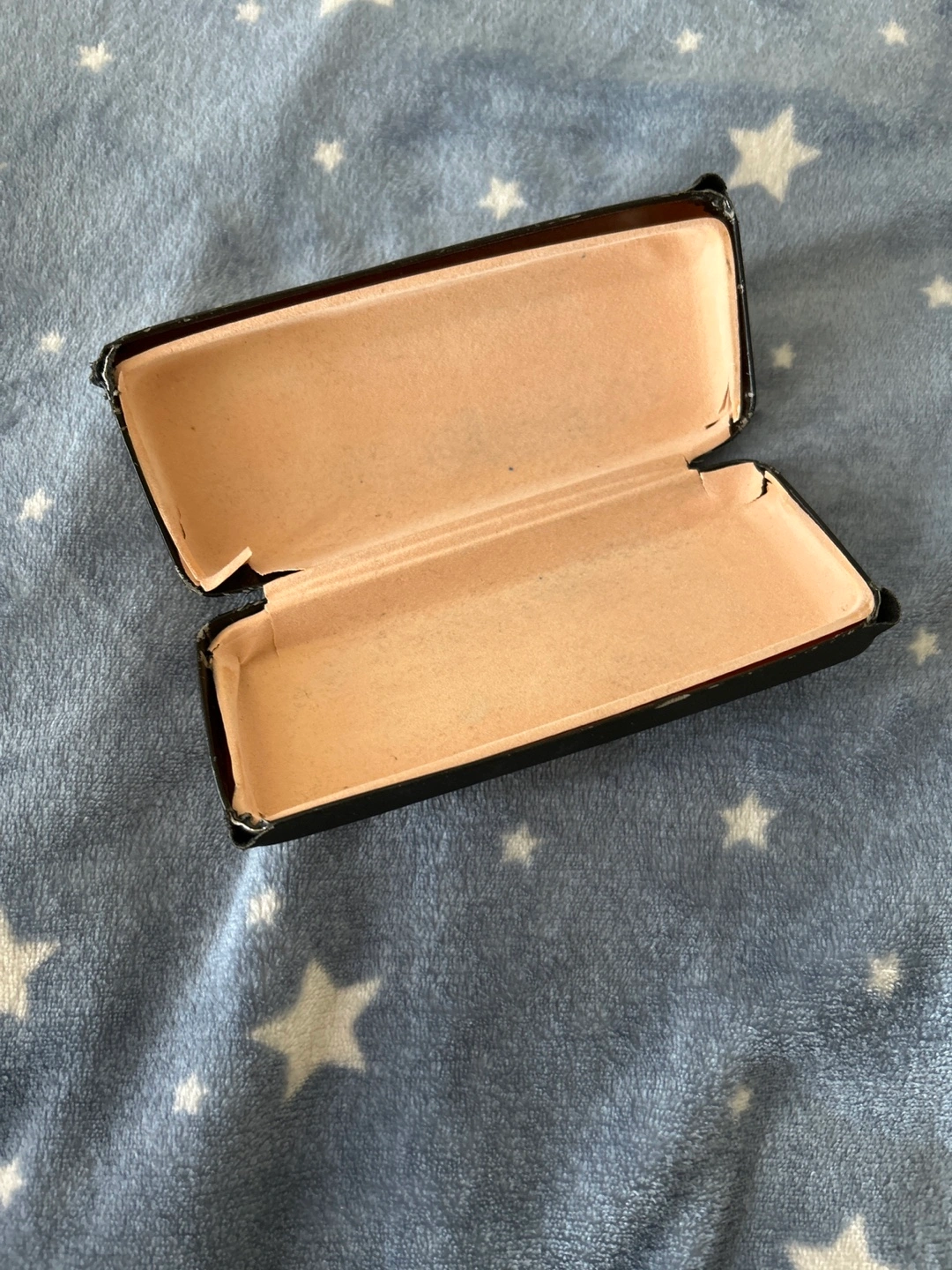 Empty black eyeglass case. Hard shell exterior. Light wear. Good for storing glasses or other small items.