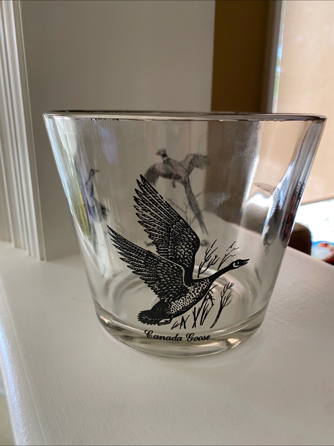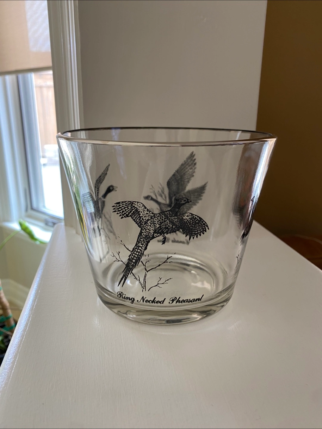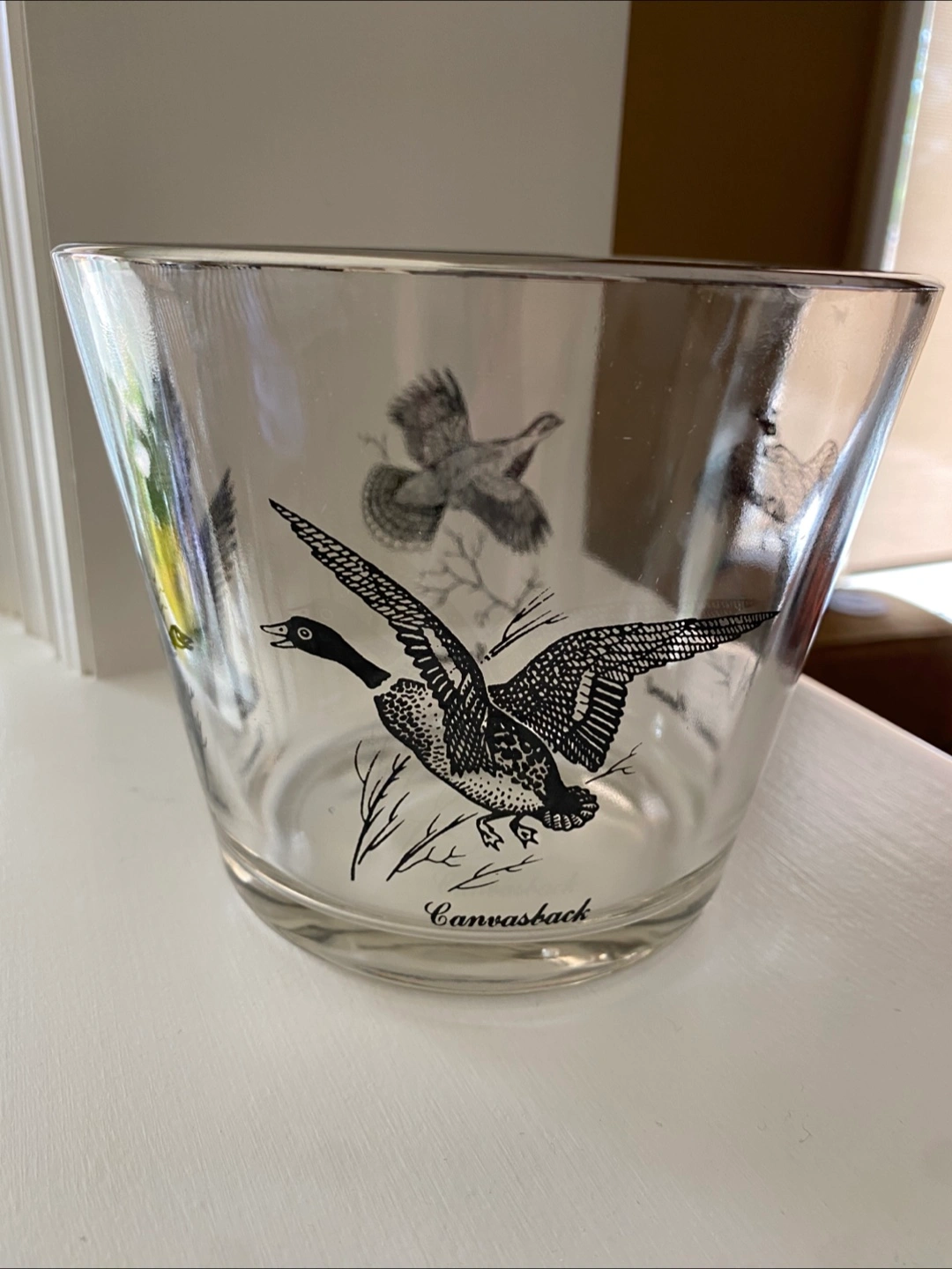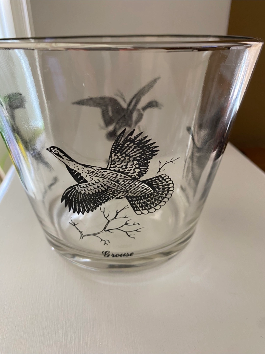 Vintage ice bucket. The ice bucket features a different birds in flight. Grouse, Ring-Necked Pheasant, Canada Goose, and Canvasback. Clear glass with black ink design. Great for serving drinks or as a decorative item.