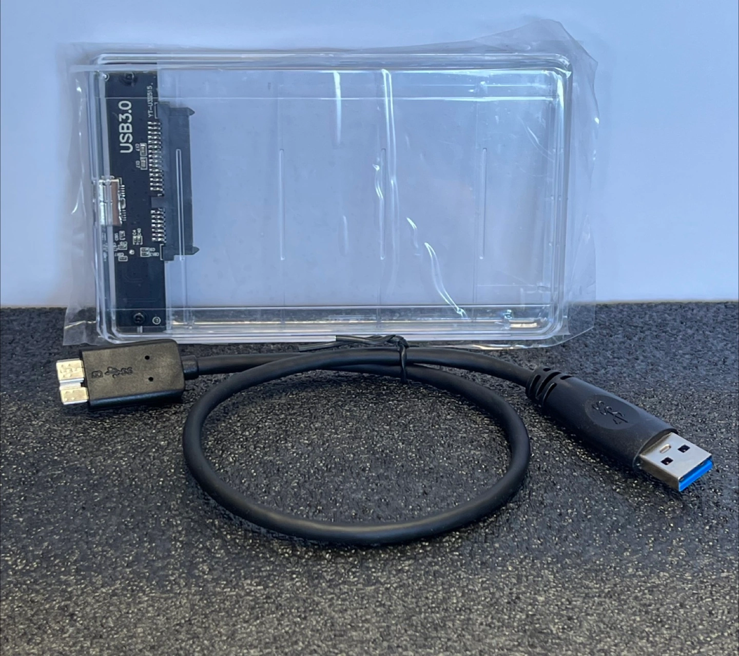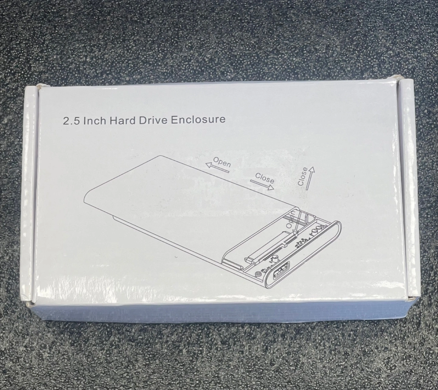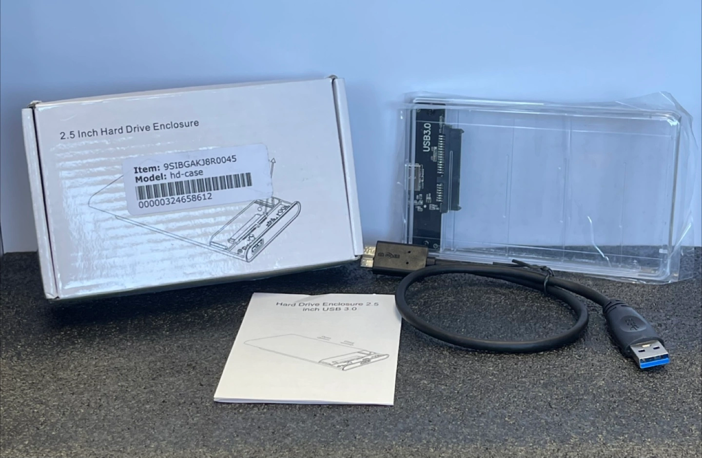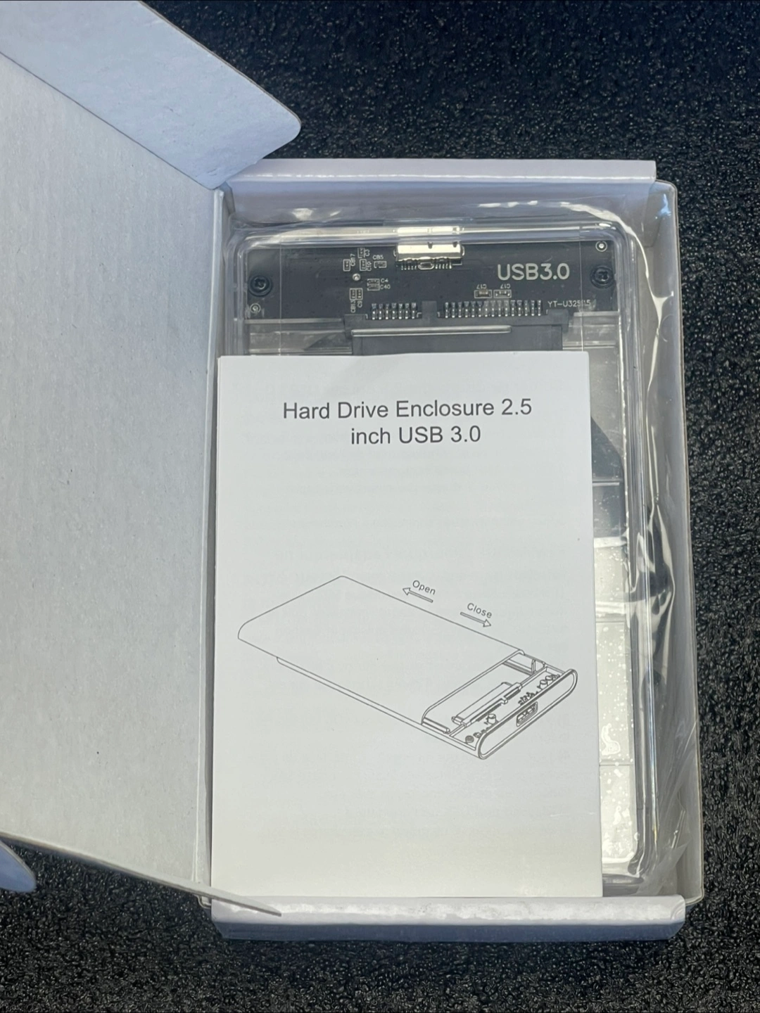 New 2.5 inch hard drive enclosure. Includes USB 3.0 cable. Easy to use. Clear plastic casing. Model: Hd-case. Item: 95IBGAK38R0045.
