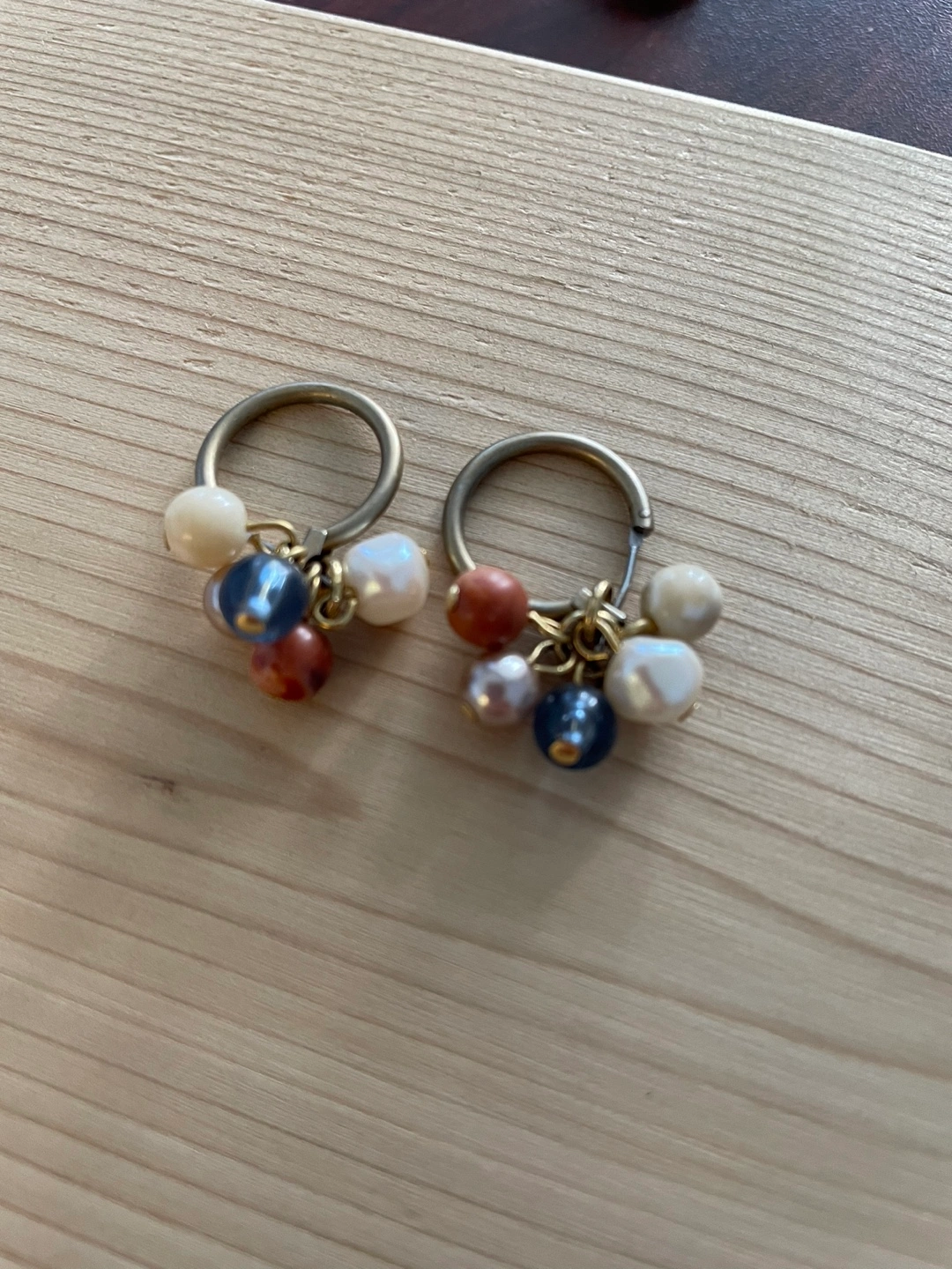 Unique handmade hoop earrings. Features various coloured beads and pearls. Gold toned metal hoops.