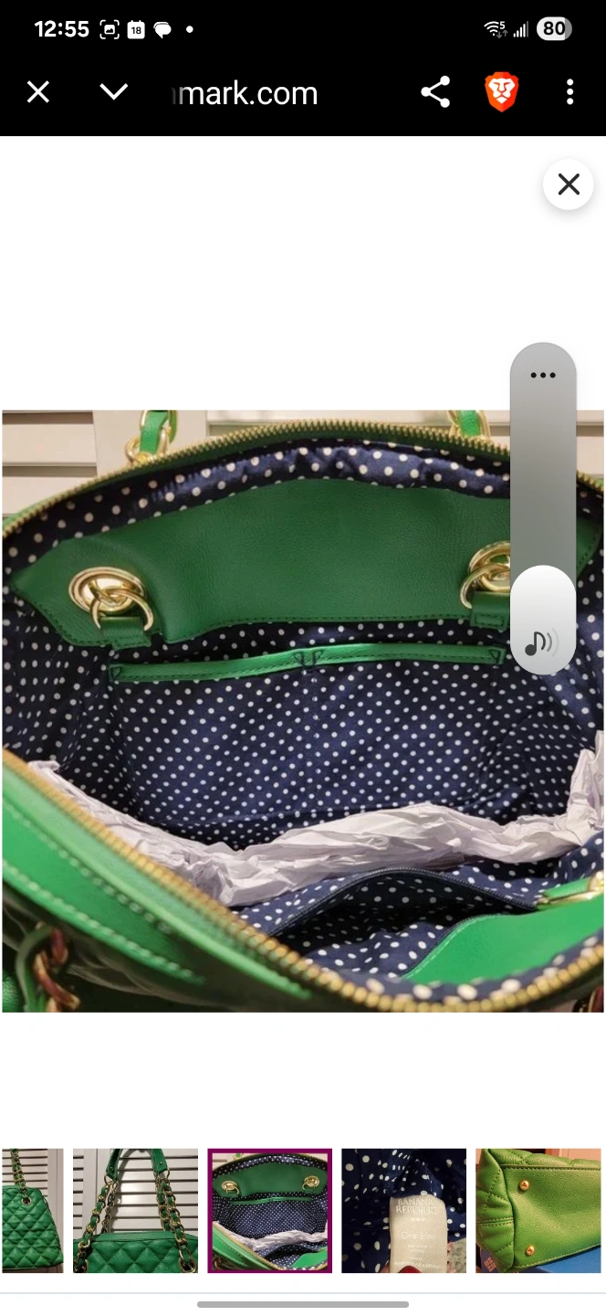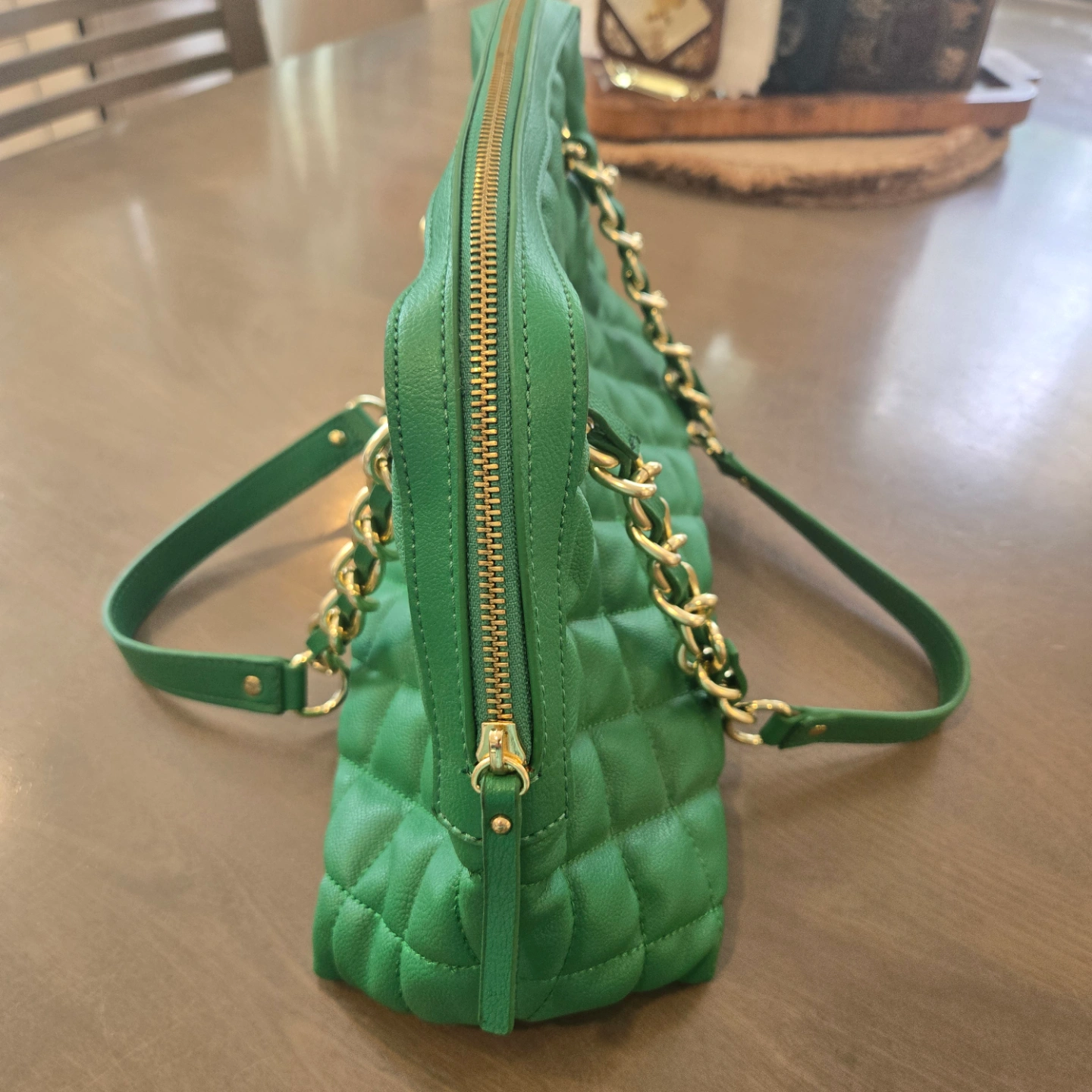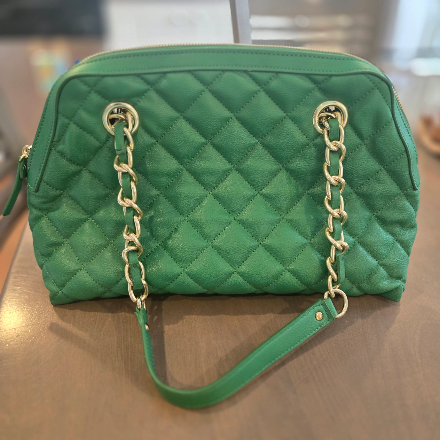 Beautiful emerald green quilted satchel. Features gold chain and leather strap. Interior is navy blue with white polka dots. Gold Metal Zip closure. Excellent condition.