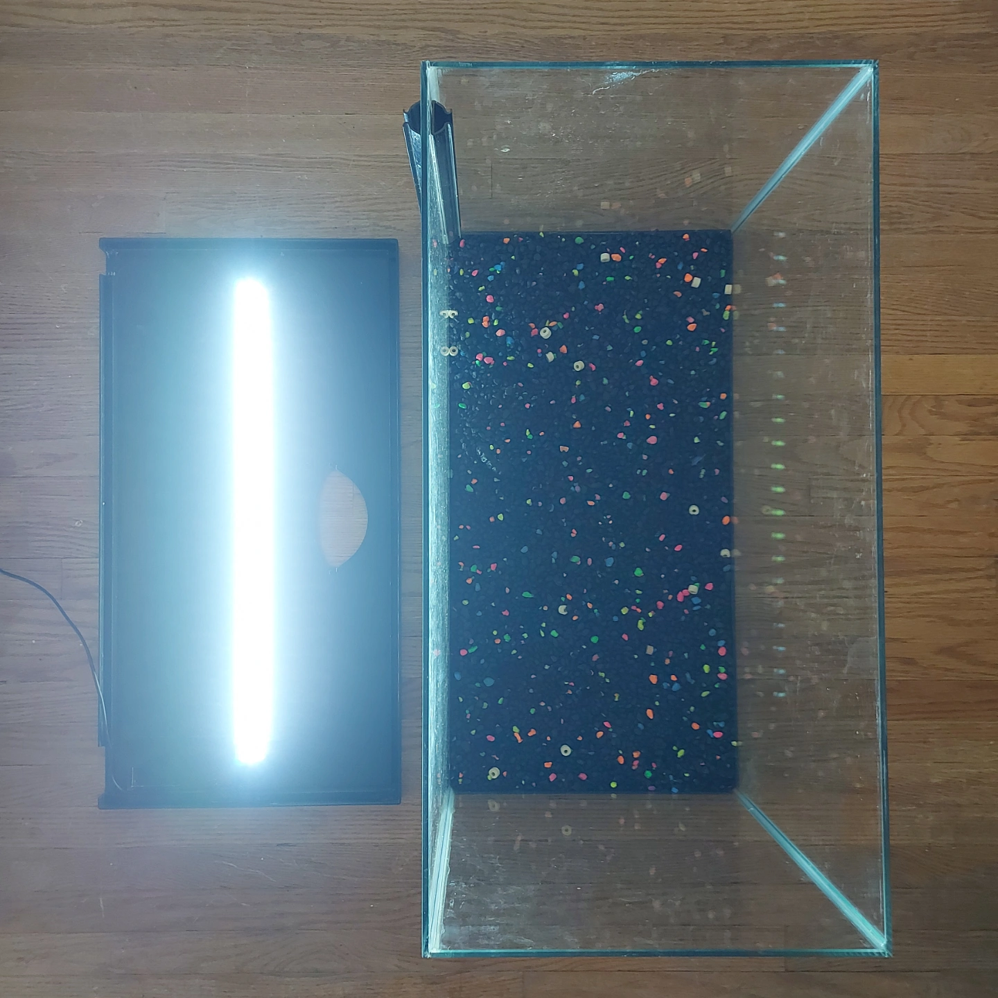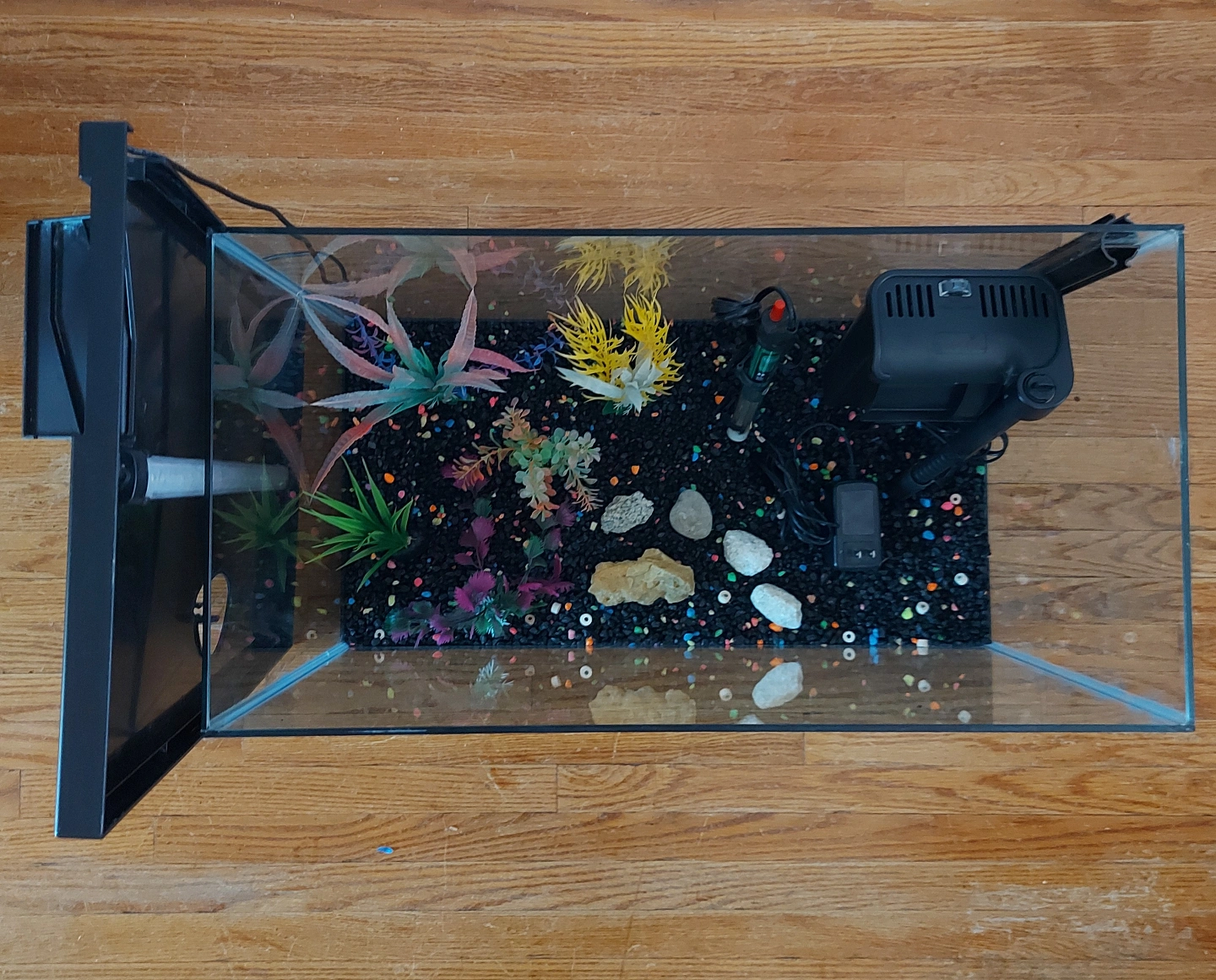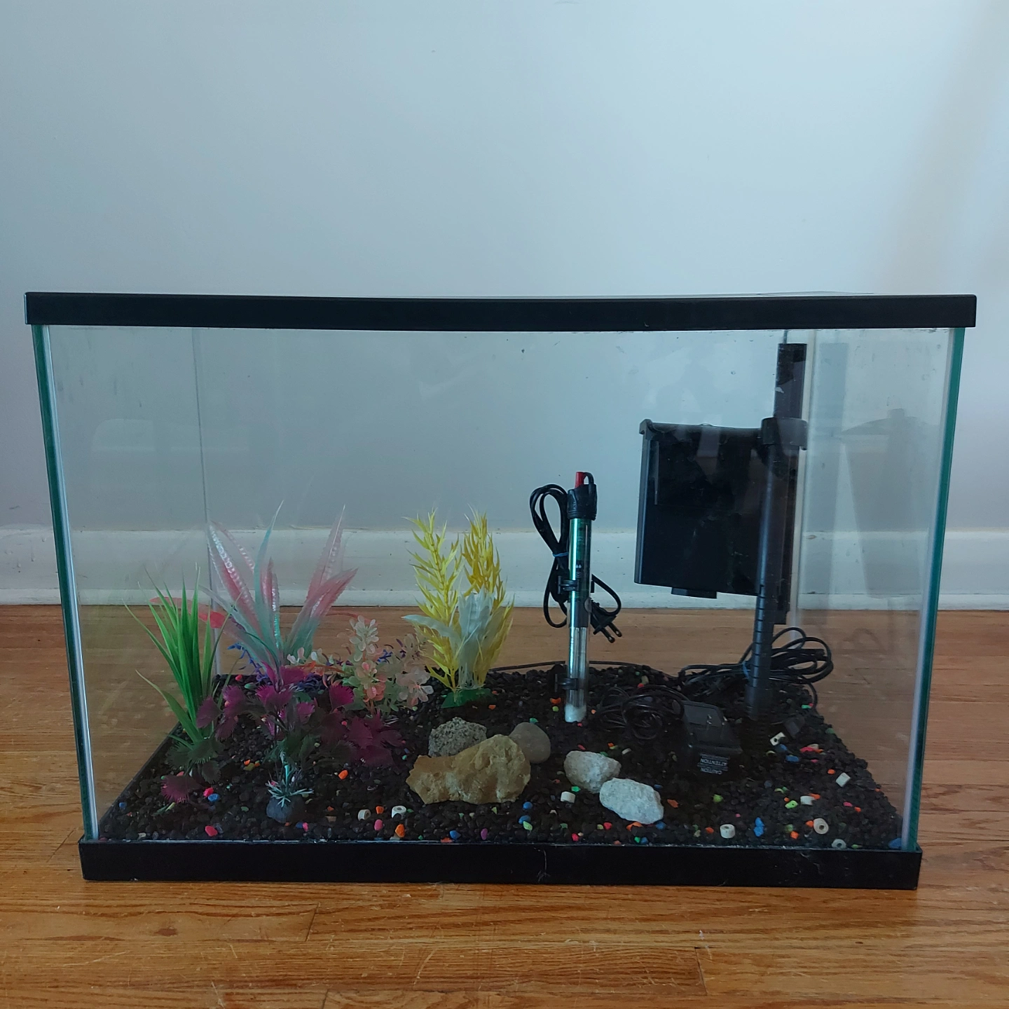 Check out my other listings for even more unique finds! I'm selling a 20 Gallon Aquarium Starter Kit, complete with everything you need to create a thriving underwater world! Great for beginners. This setup includes a 20-gallon tank, a filter to keep the water clean, a heater to maintain the perfect temperature, and decorative plants to make your fish feel at home. This kit has been used, but is in good condition. * 20 Gallon Glass Tank * TopFin PowerFilter 10 * 100W Heater - Adjustable Temperature * Gravel substrate * Assorted decorative plants and rocks Measurements: L: 61cm / 24in W: 32cm / 12.5in H: 42cm / 16.5in I offer a lamp and an airpump equipment, plants and fish separately if you are interested. --- Special Offer: Bundle this item with other items from my listings for amazing discounts! Pickup Only: Item is available as long as the listing is visible. Delivery is not possible.
