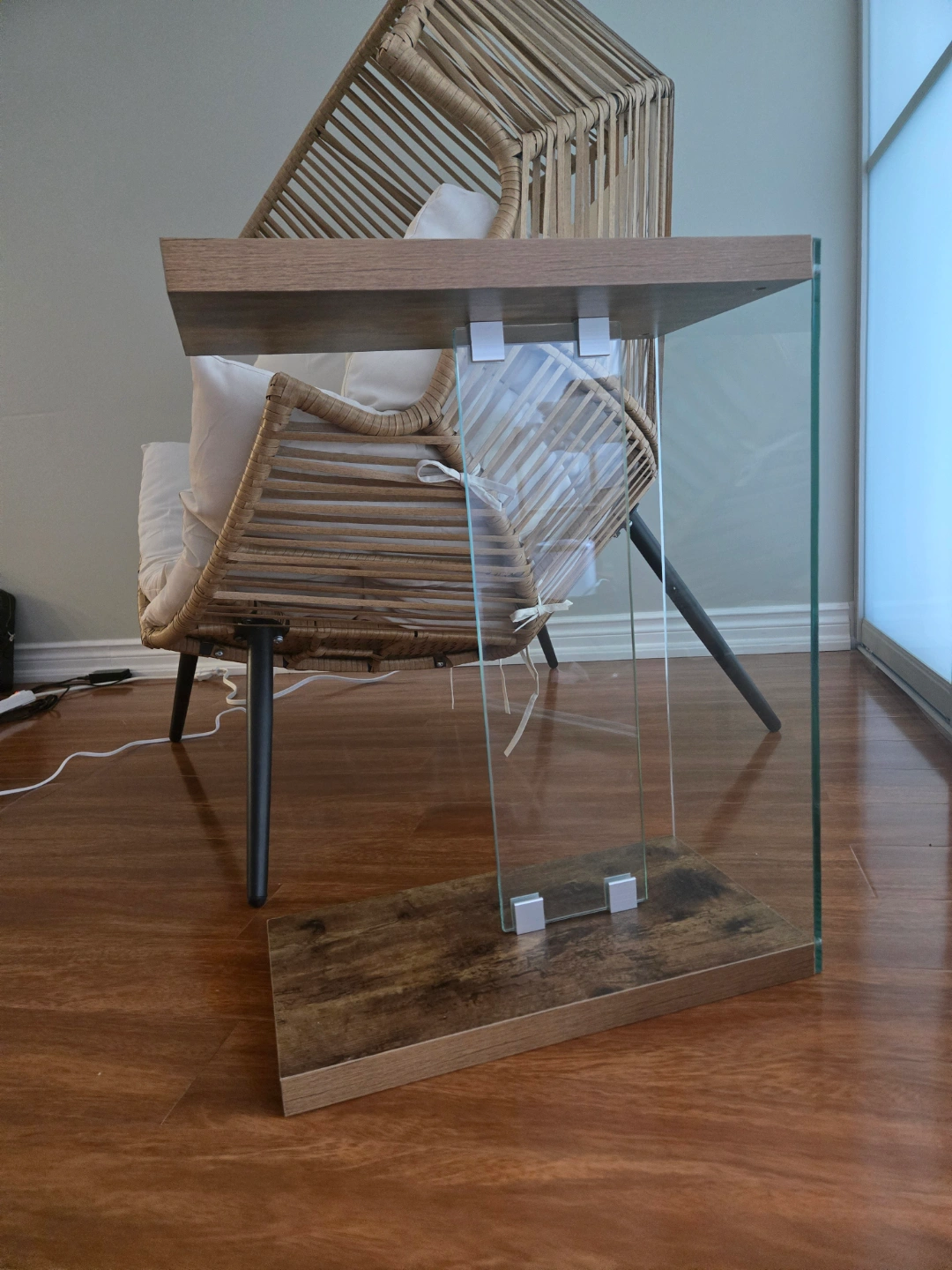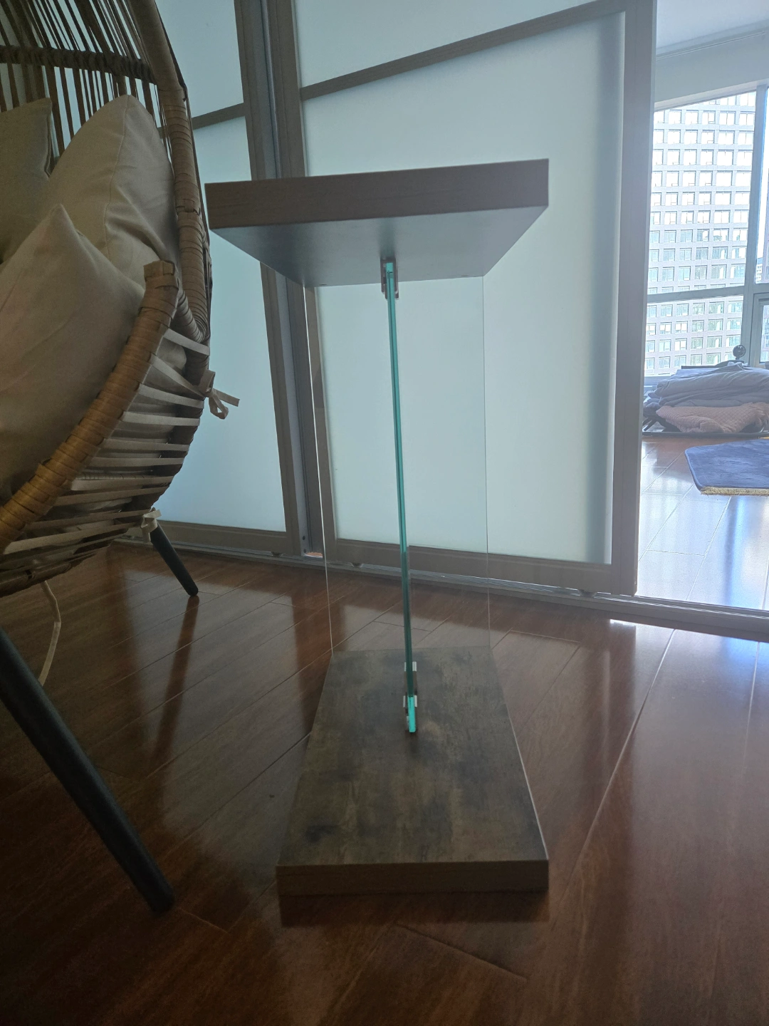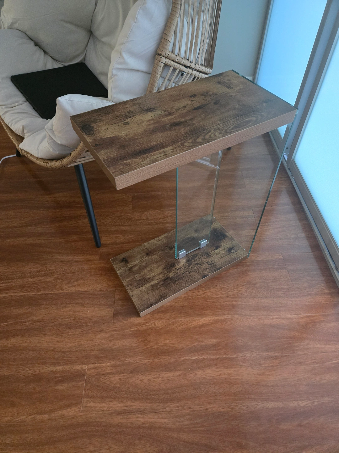 50 each - 100 for both. Two Unique side tables Features a wood top and base with a glass centre support to give a floating visual effect. Sleek design. Perfect for a modern living room or bedroom. No scratches, No breaks. bought from Wayfair. costs 140 each - asking 120 for both. link to item: https://www.wayfair.ca/furniture/pdp/wade-logan-allegonda-2425-tall-c-end-table-c001948130.html?piid=781005213