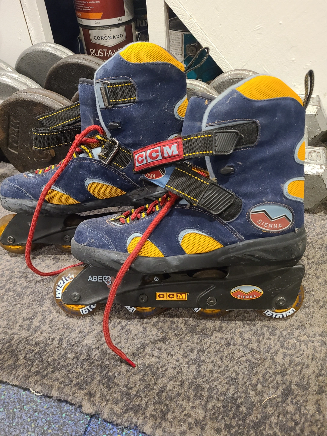 Pair of used CCM Sienna inline skates. Blue, yellow, and red colour scheme. ABEC 5 bearings. Show some wear. size 10
