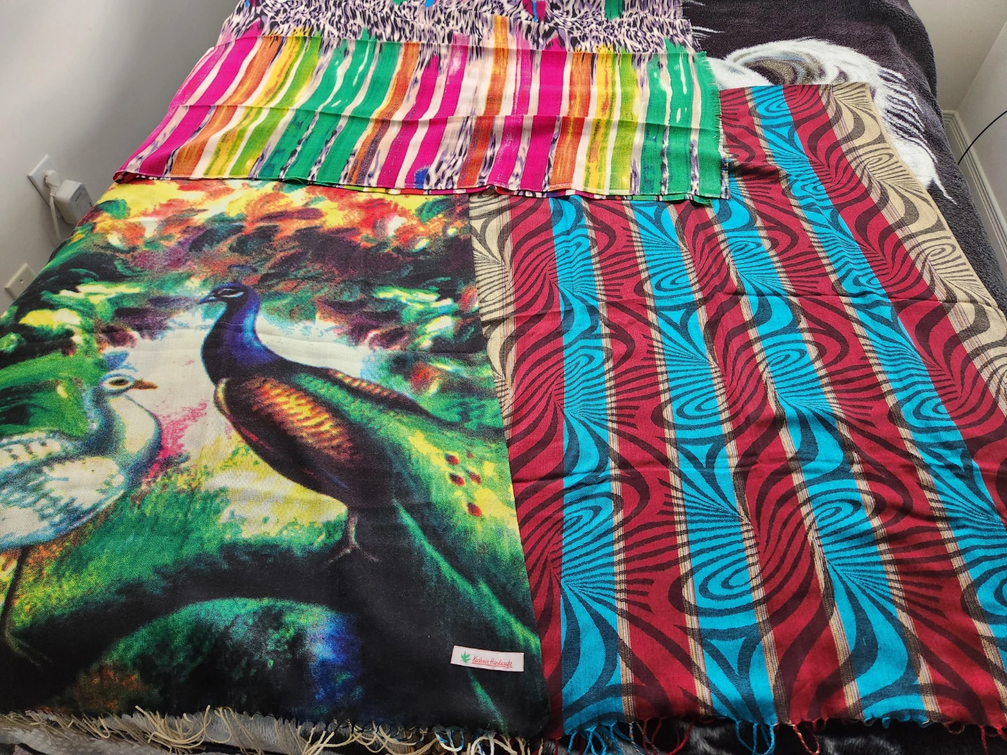 Collection of three beautiful shawls. Features colourful designs. One peacock print, one striped pattern, and one with abstract swirls. Soft material, suitable for layering. Great for adding a pop of colour to your outfit.