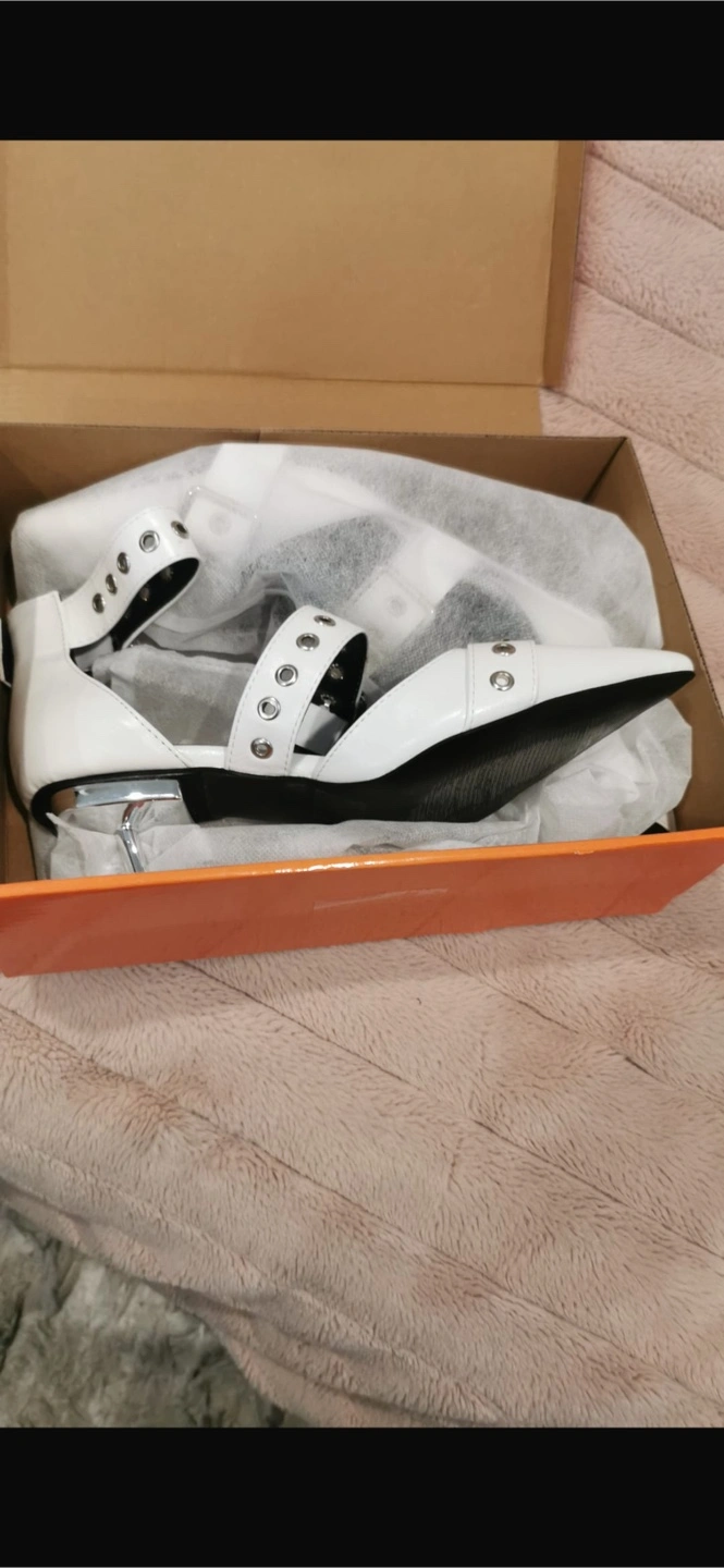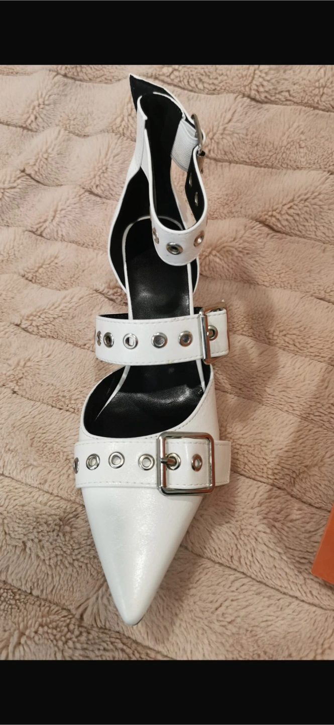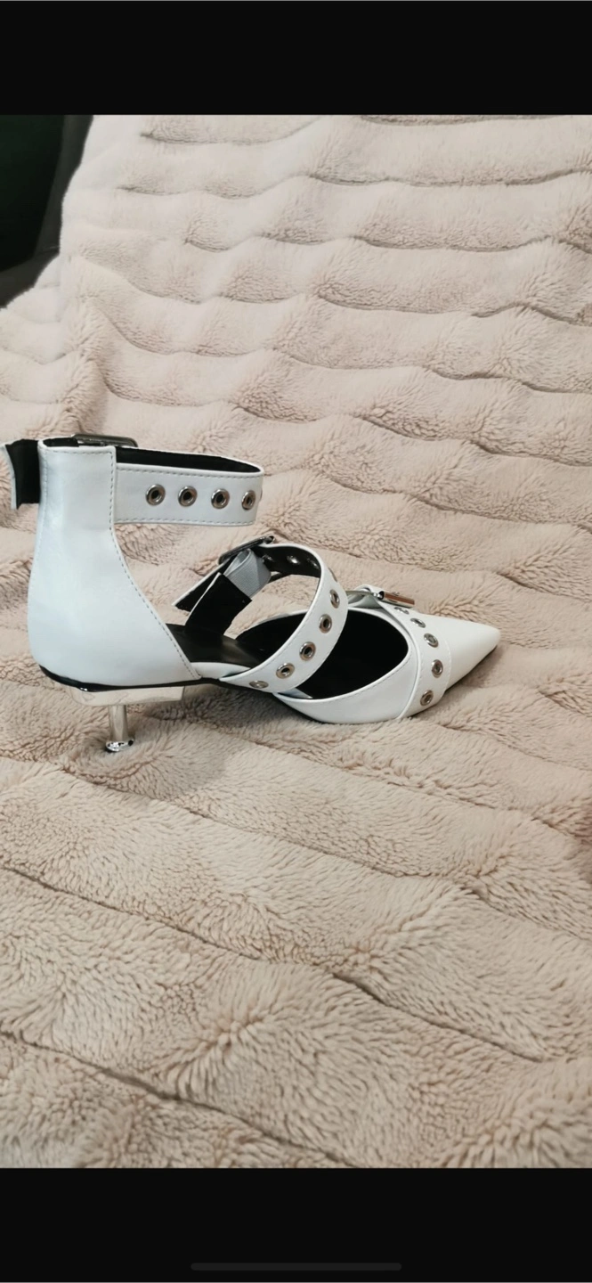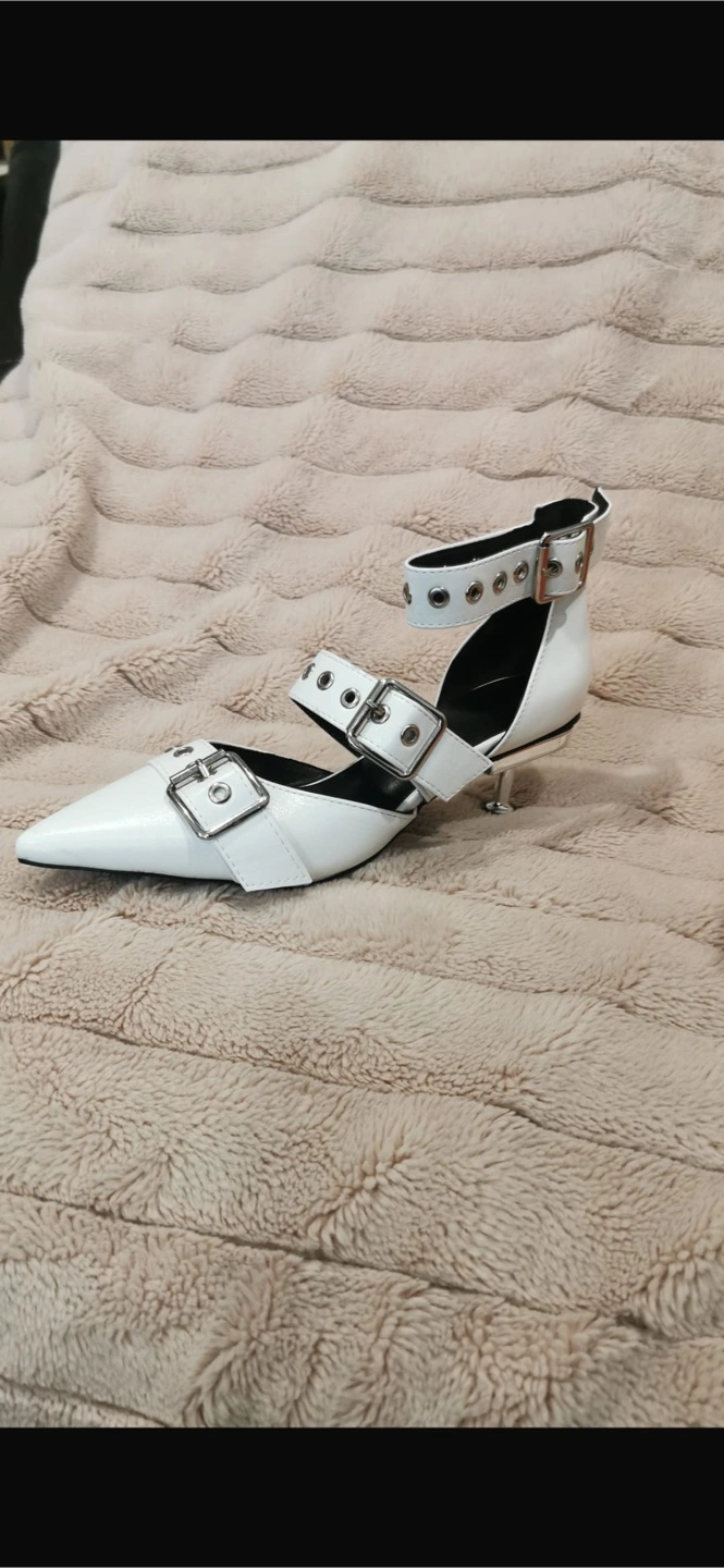 New! Women's white leather-look stiletto heels. Features multiple buckles and ankle strap. Pointed toe. Stylish and elegant. Size 6.5 Heel height: 2.0" High quality synthetic faux leather. Nonslip and wearable rubber outsole. Comfortable inside, abrasion-resistant and durable, breathable and lightweight. Pointed toe kitten heels is easy to support a long time wear and the plus size for more choices. The mid heel pumps with ankle strap and buckle is easy to wear or take off and the multiple strappy design make the shoes more stylish. This classic low heel heeled shoes will high light your dress, wedding, daily or office wear and the size is regular.