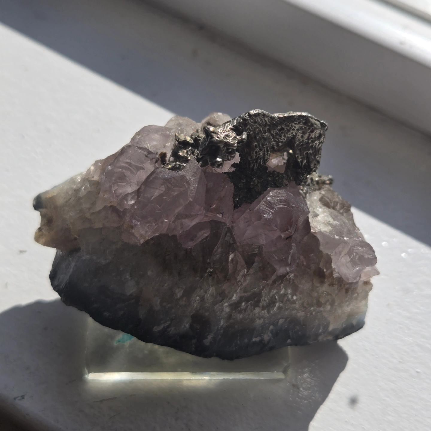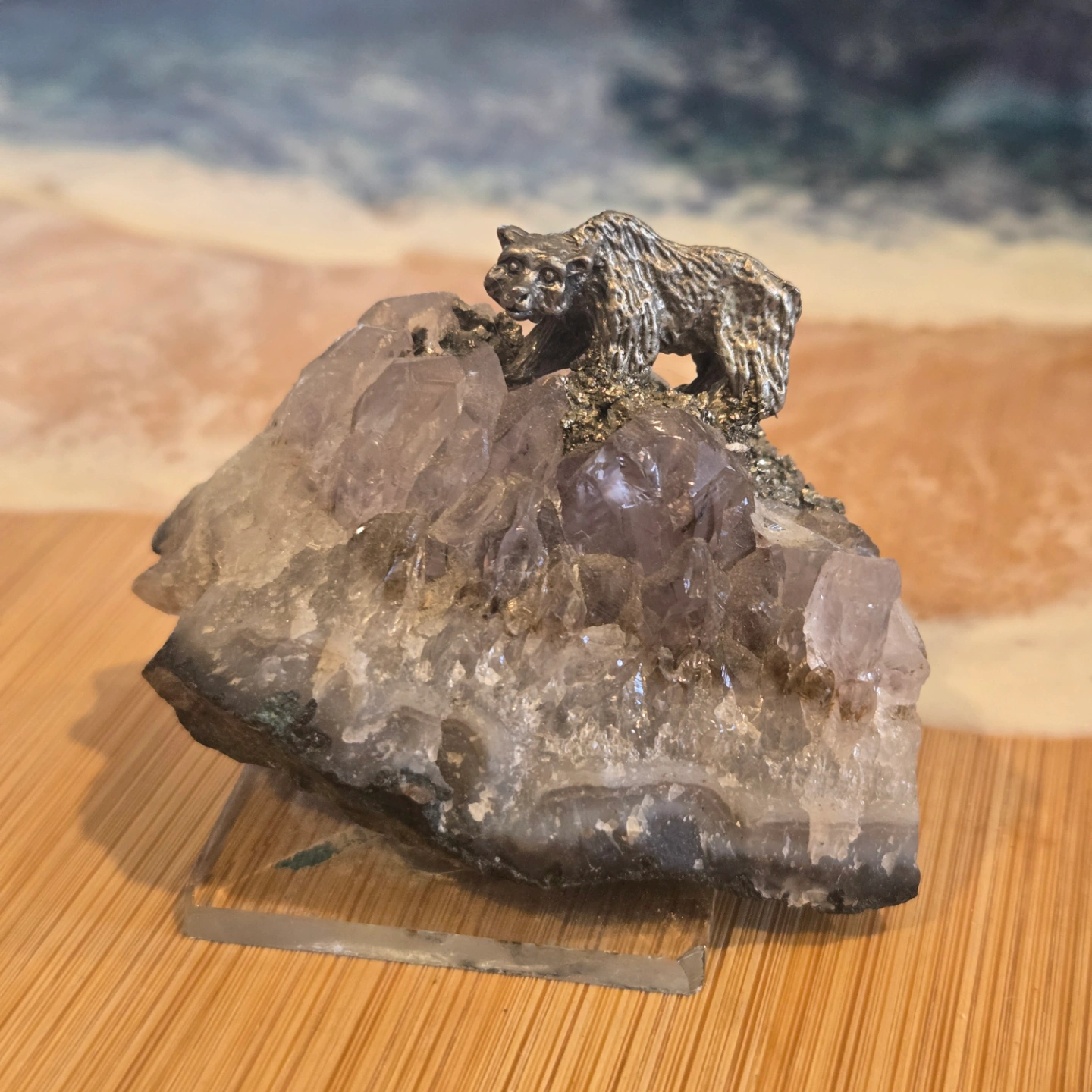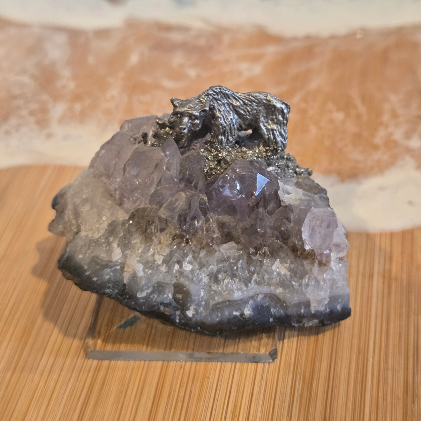 Unique amethyst geode featuring a small Pewter Bear figurine. Beautiful purple crystals.