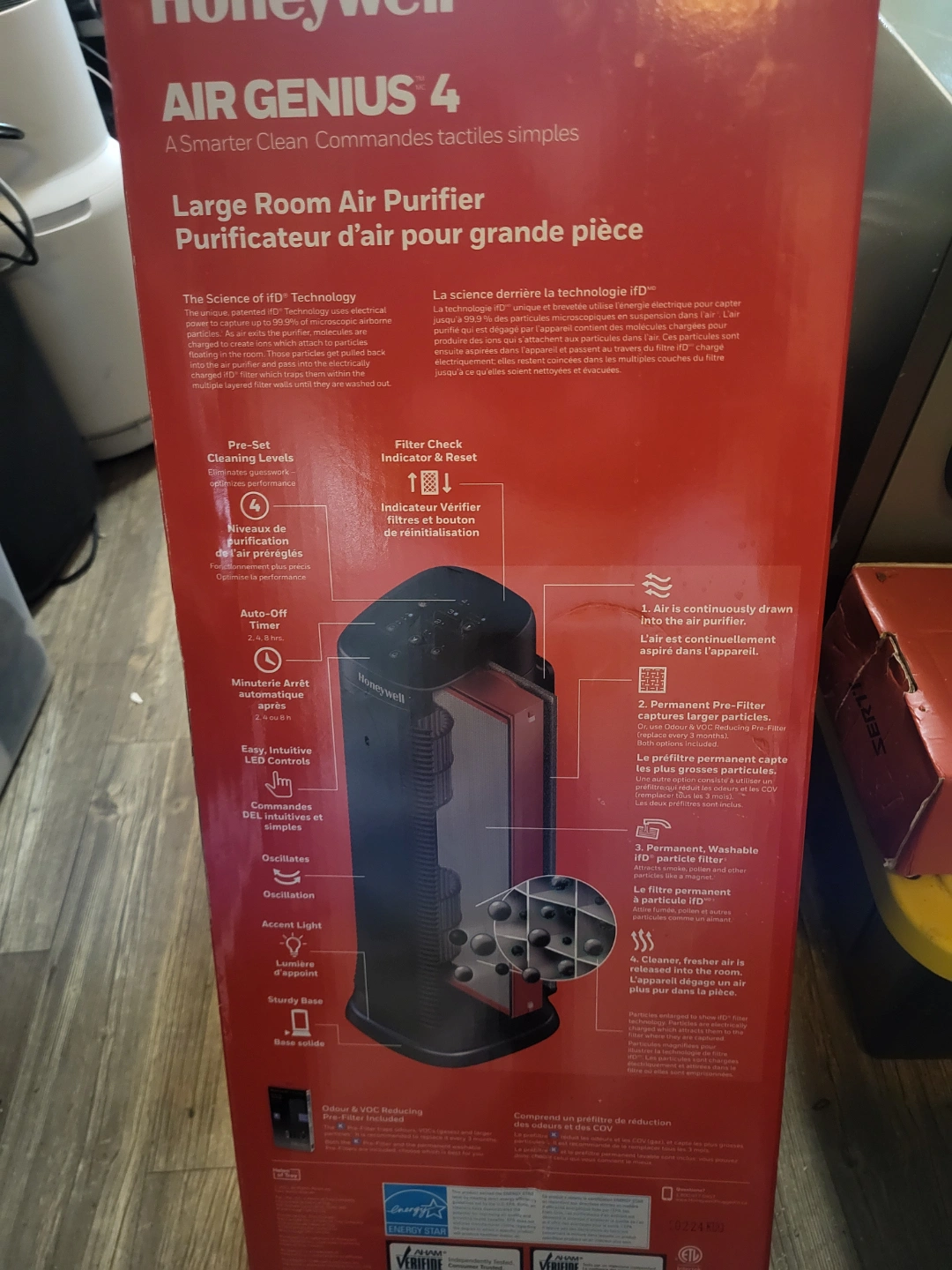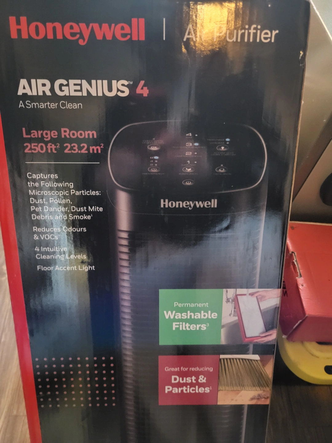 Large room air purifier. Captures microscopic particles: dust, pollen, pet dander, dust mite debris, smoke & odours. Reduces VOCs. Four intuitive cleaning levels. Floor accent light. Permanent washable filters. 250 sq ft.
