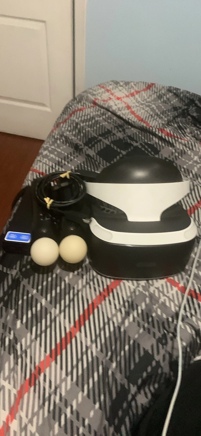 PlayStation VR headset, two controllers, and processing unit. Great for immersive gaming experiences.