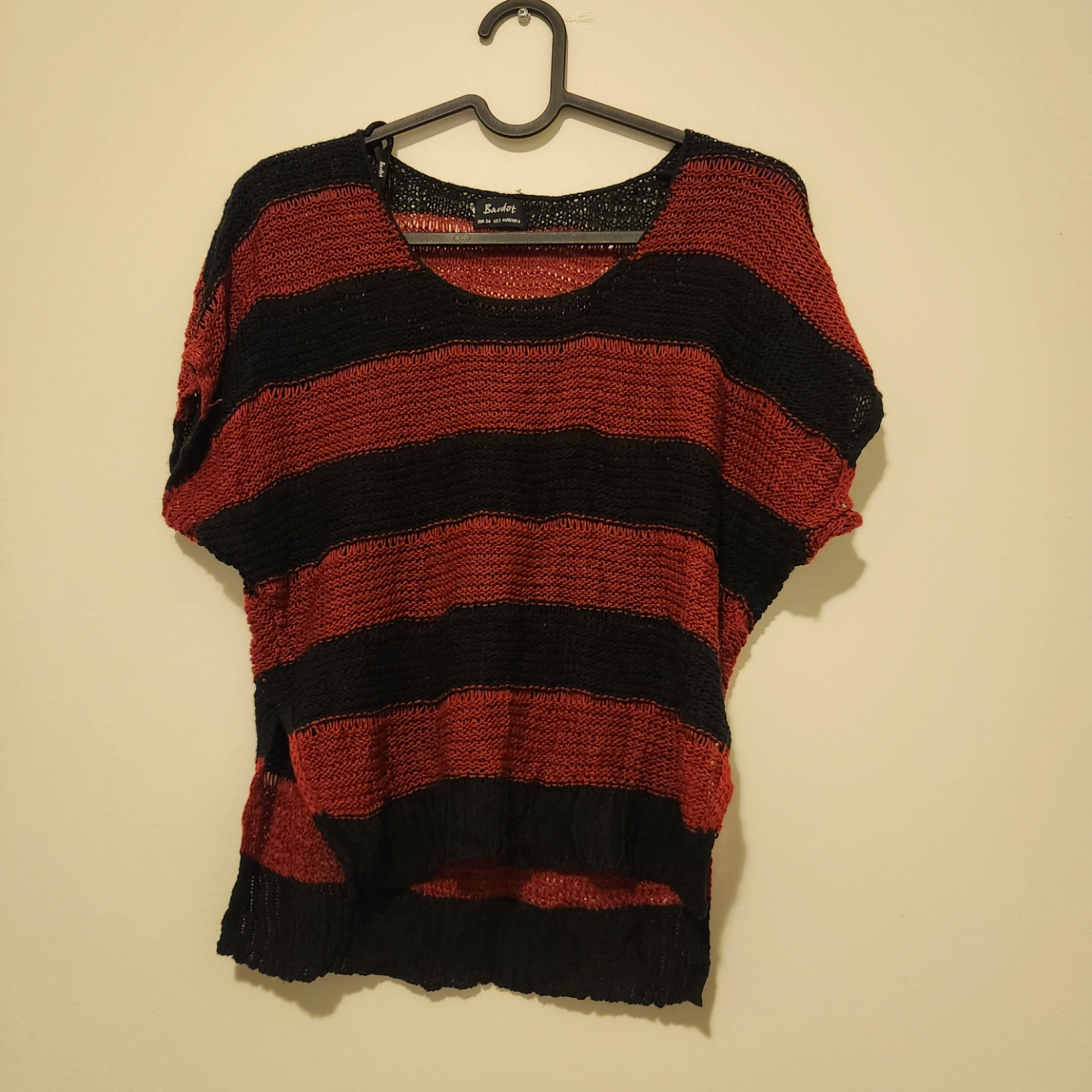 Women's red and black striped knit sweater. Short sleeves. Relaxed fit. Lightweight knit material. Slightly cropped length. Both sides have a cute slit.
