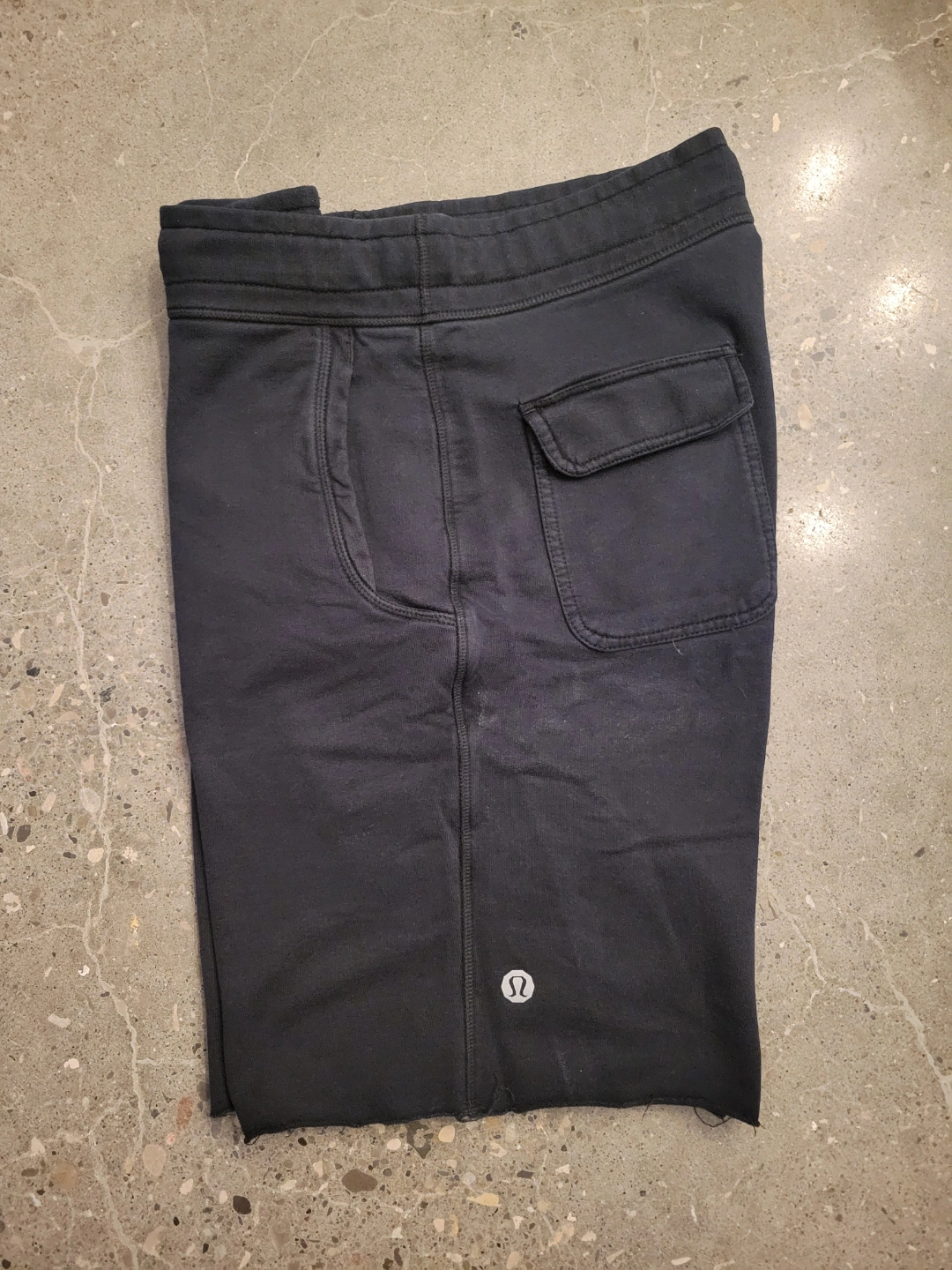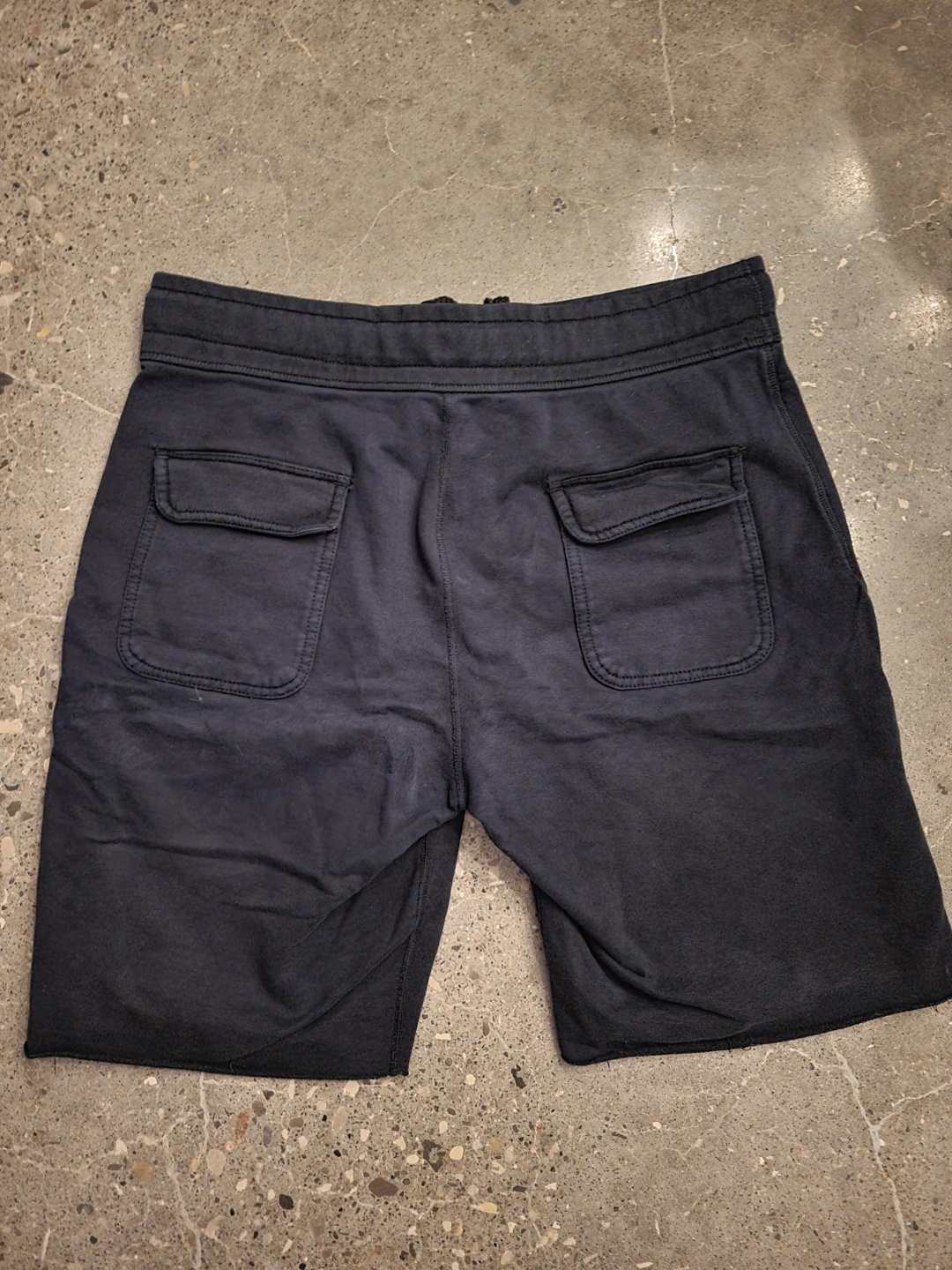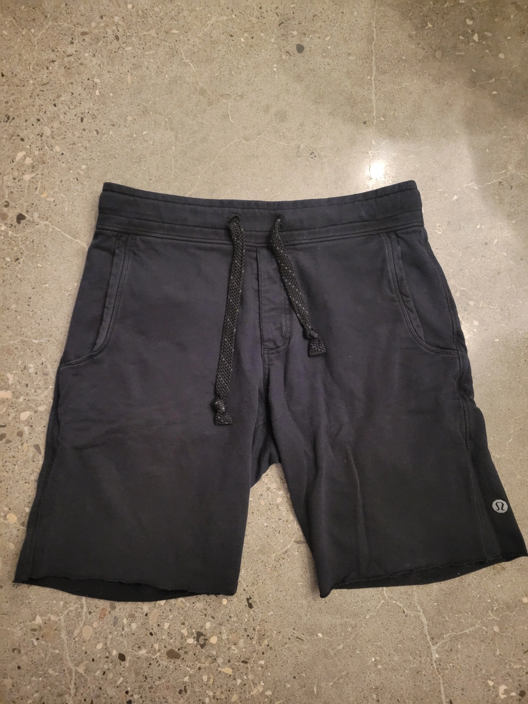 Mens Black shorts. Drawstring waist. Two front pockets and two back pockets. Raw hem. Great for lounging or working out.
