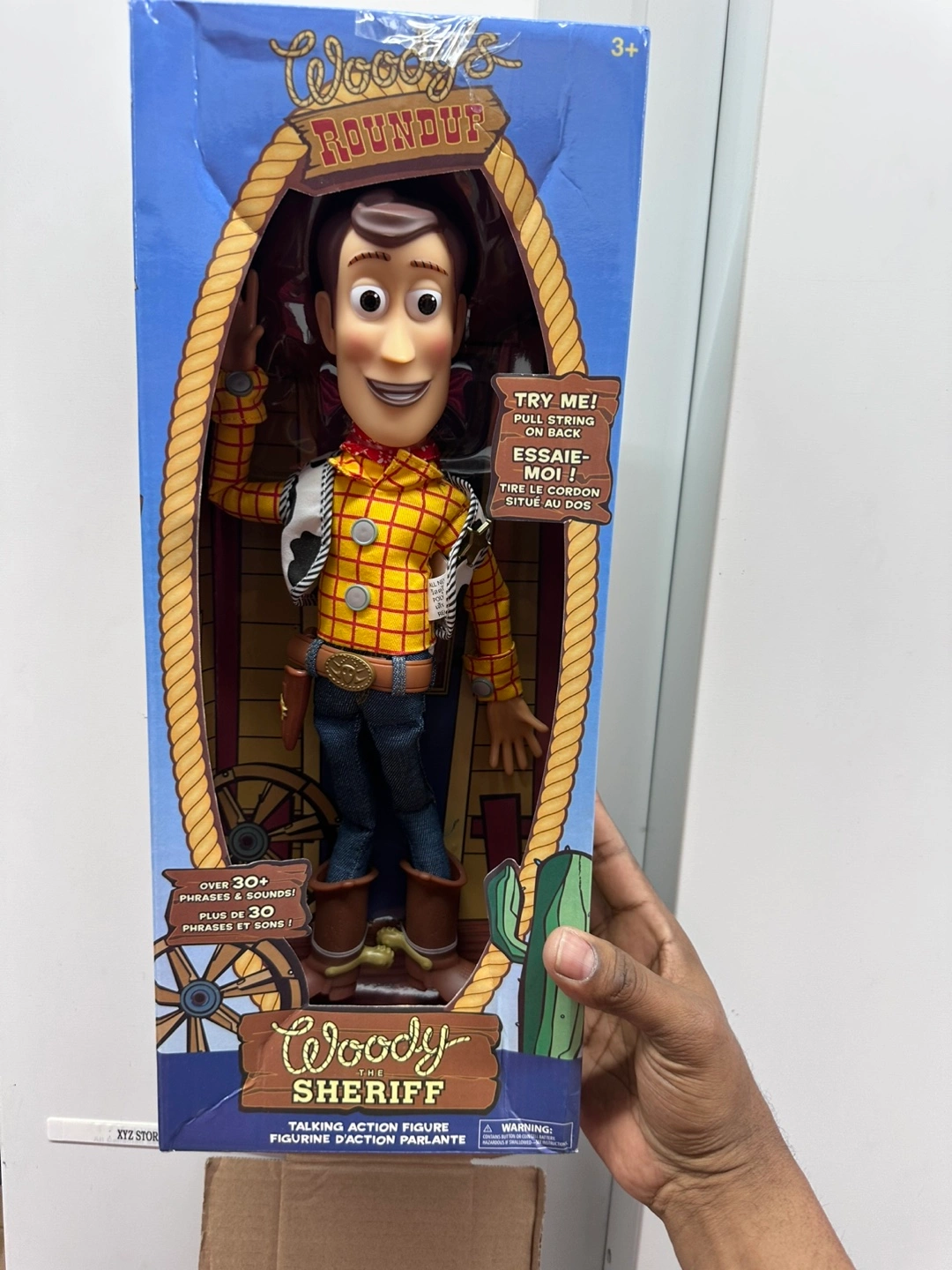 Talking Woody action figure. Pull string on back. Over 30 phrases and sounds. Box shows some wear.