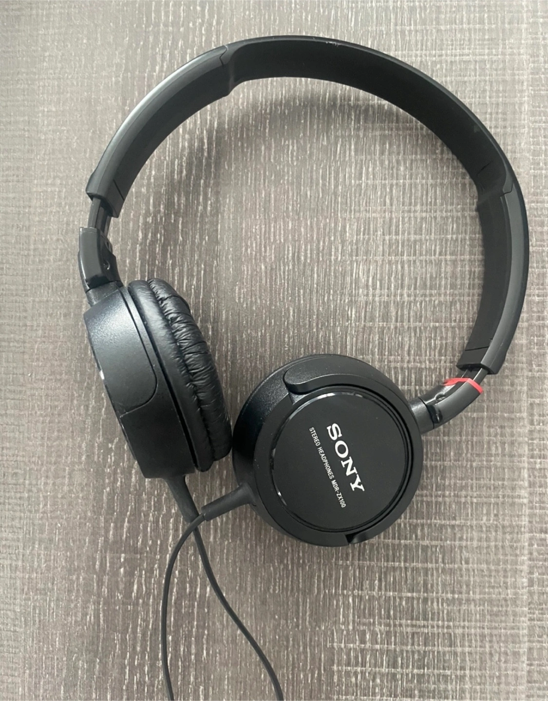 Black wired headphones. Good for listening to music. Compact and foldable design.
