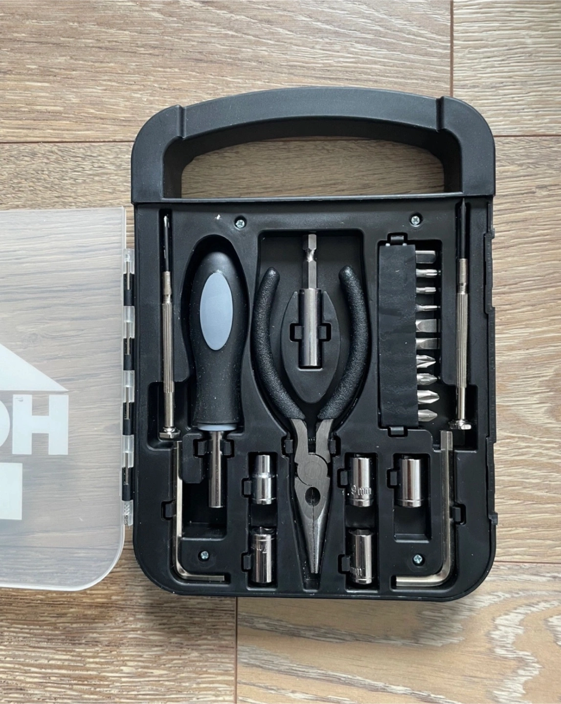 Compact tool kit. Includes screwdriver, pliers, various bits and sockets. Convenient carrying case.