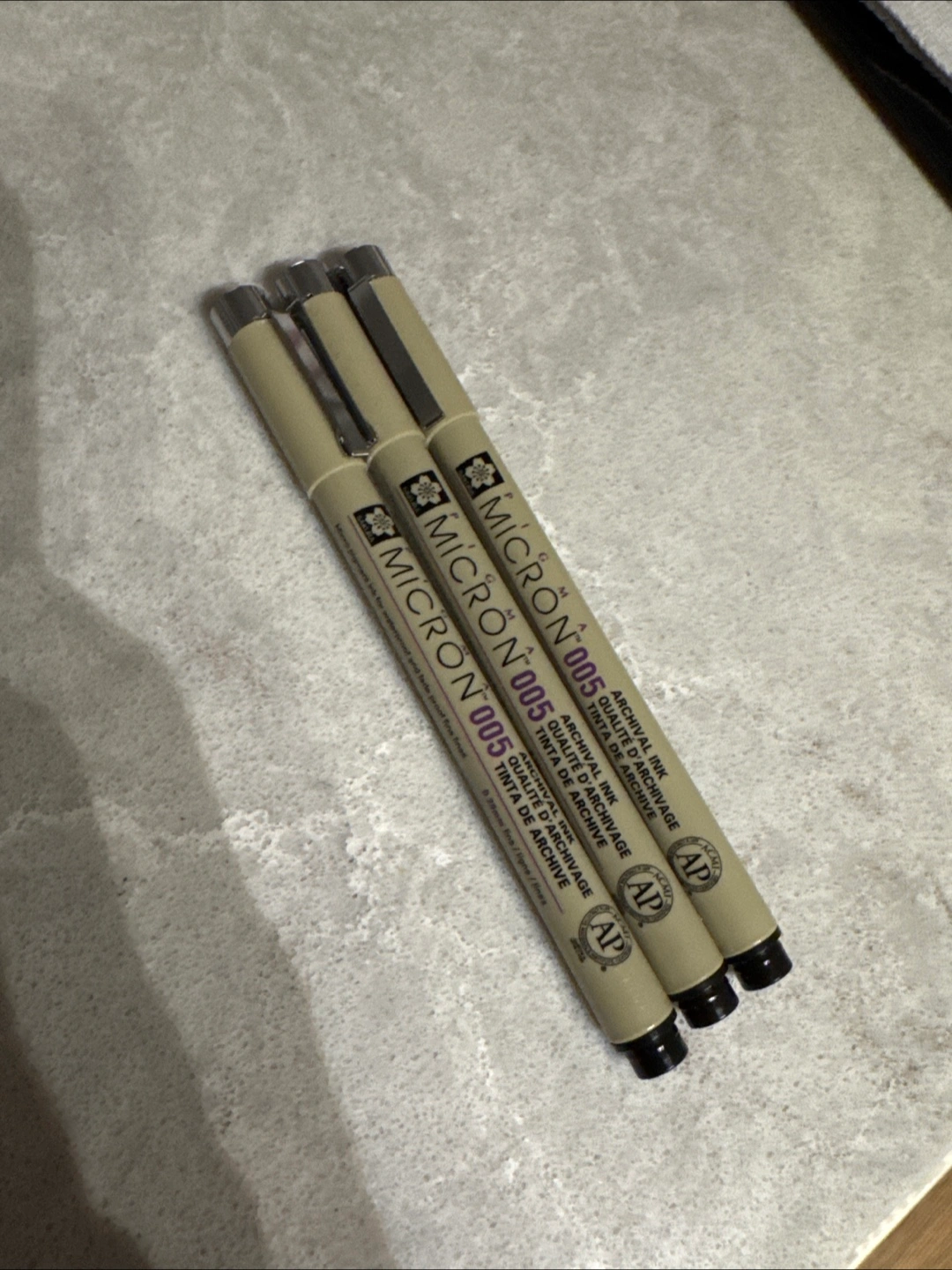 Three Sakura Pigma Micron 005 pens. Archival ink. Fine line.