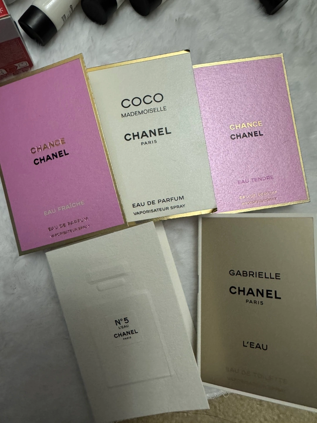 Set of Chanel perfume samples. Includes Coco Mademoiselle, Chance Eau Fraiche, Chance Eau Tendre, and Gabrielle L'Eau. All samples are Eau de Parfum or Eau de Toilette.Any 4 together for $10.