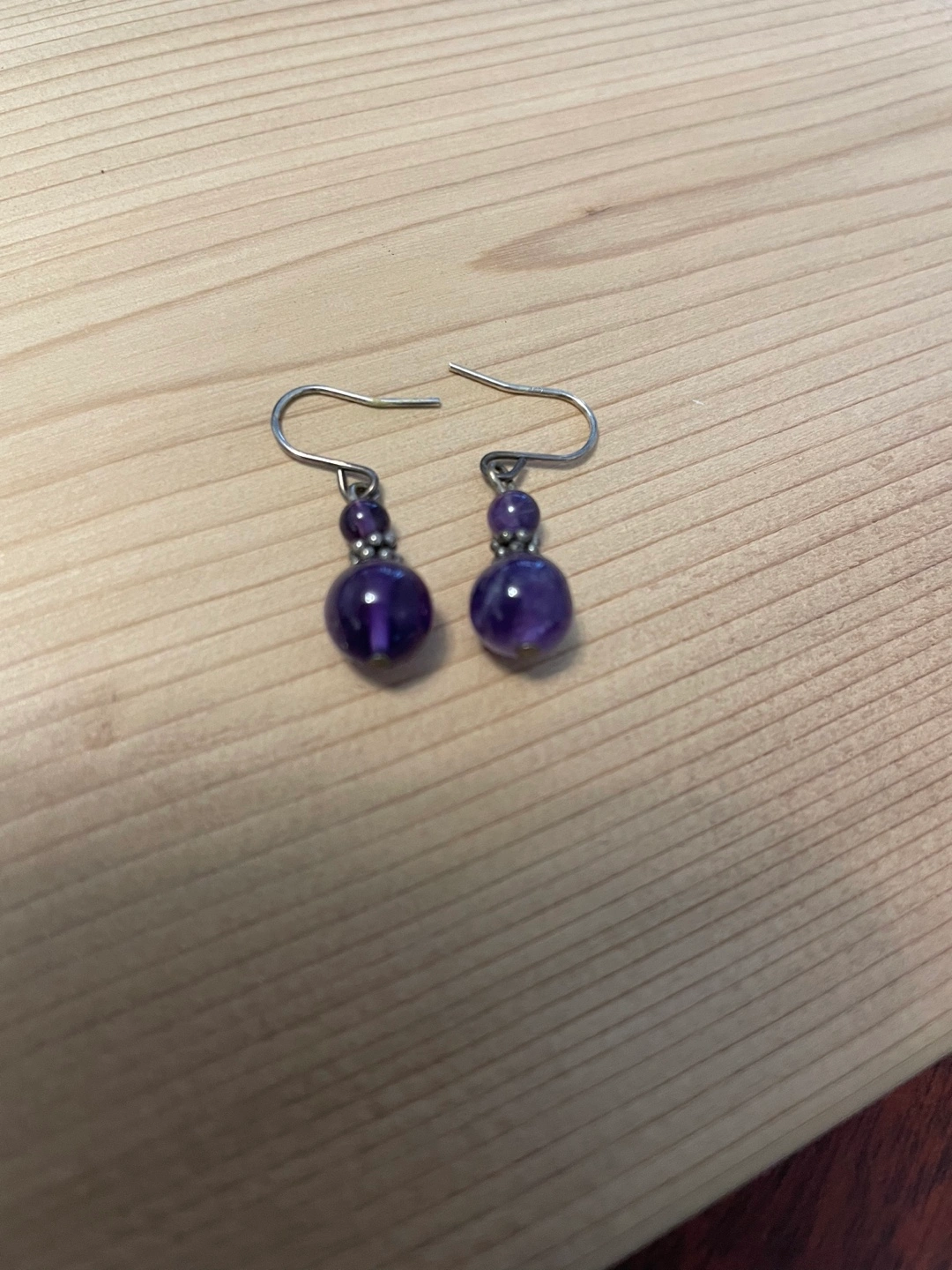 Purple amethyst dangle earrings. Silver tone metal. Simple design. Perfect for everyday wear.