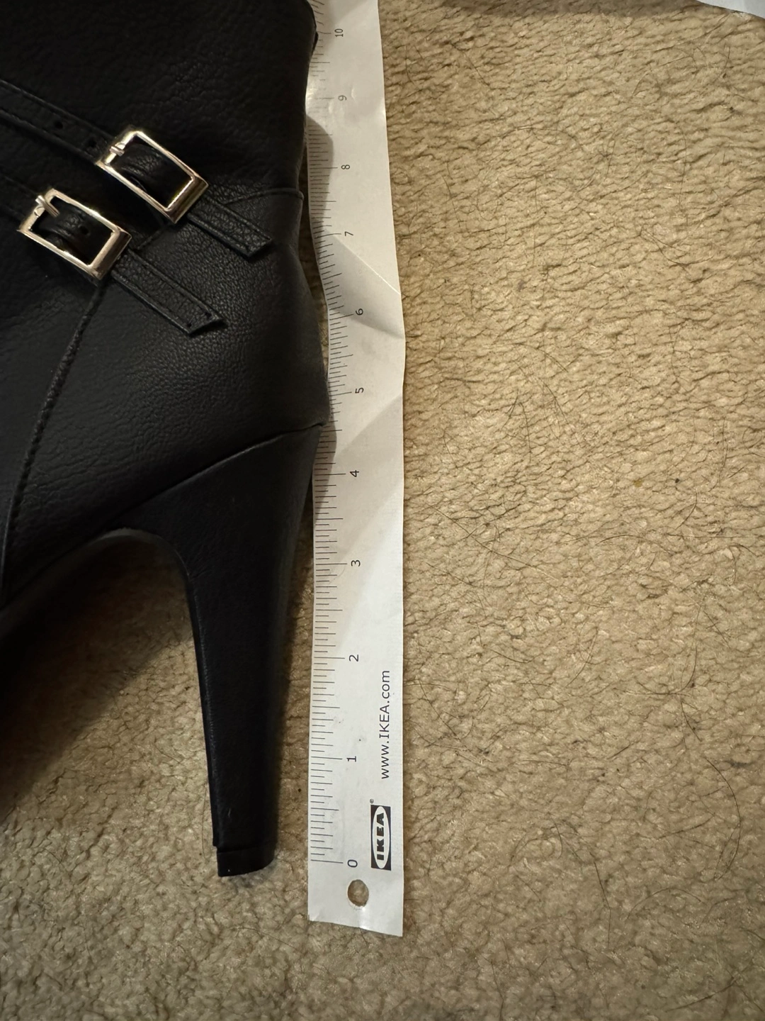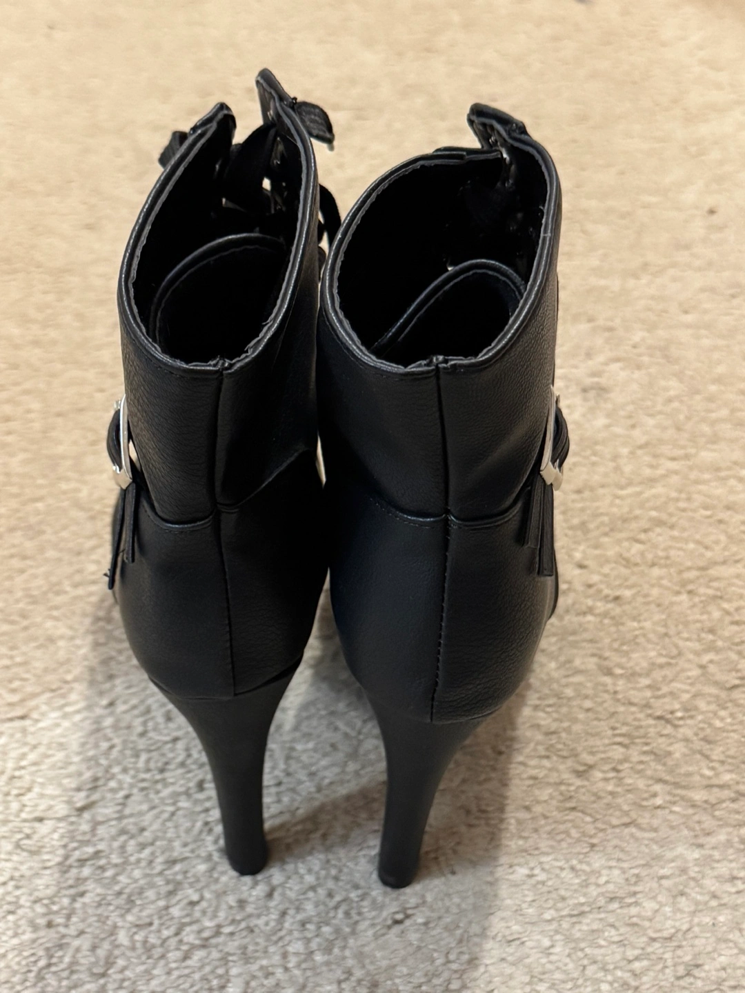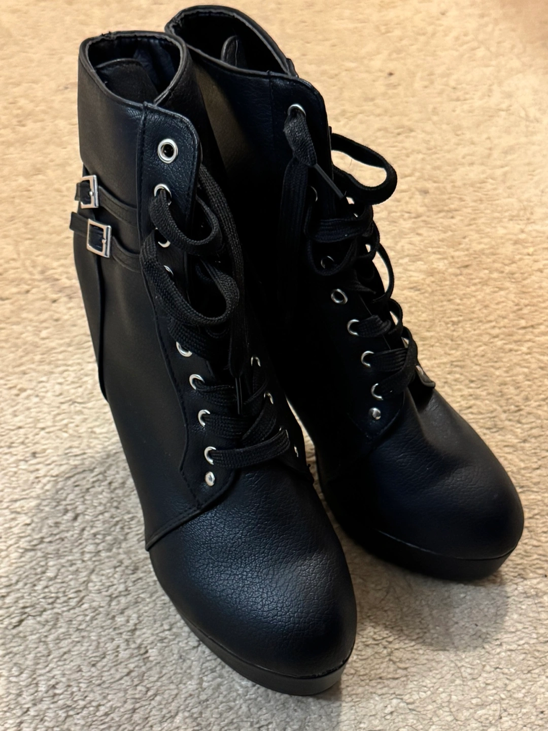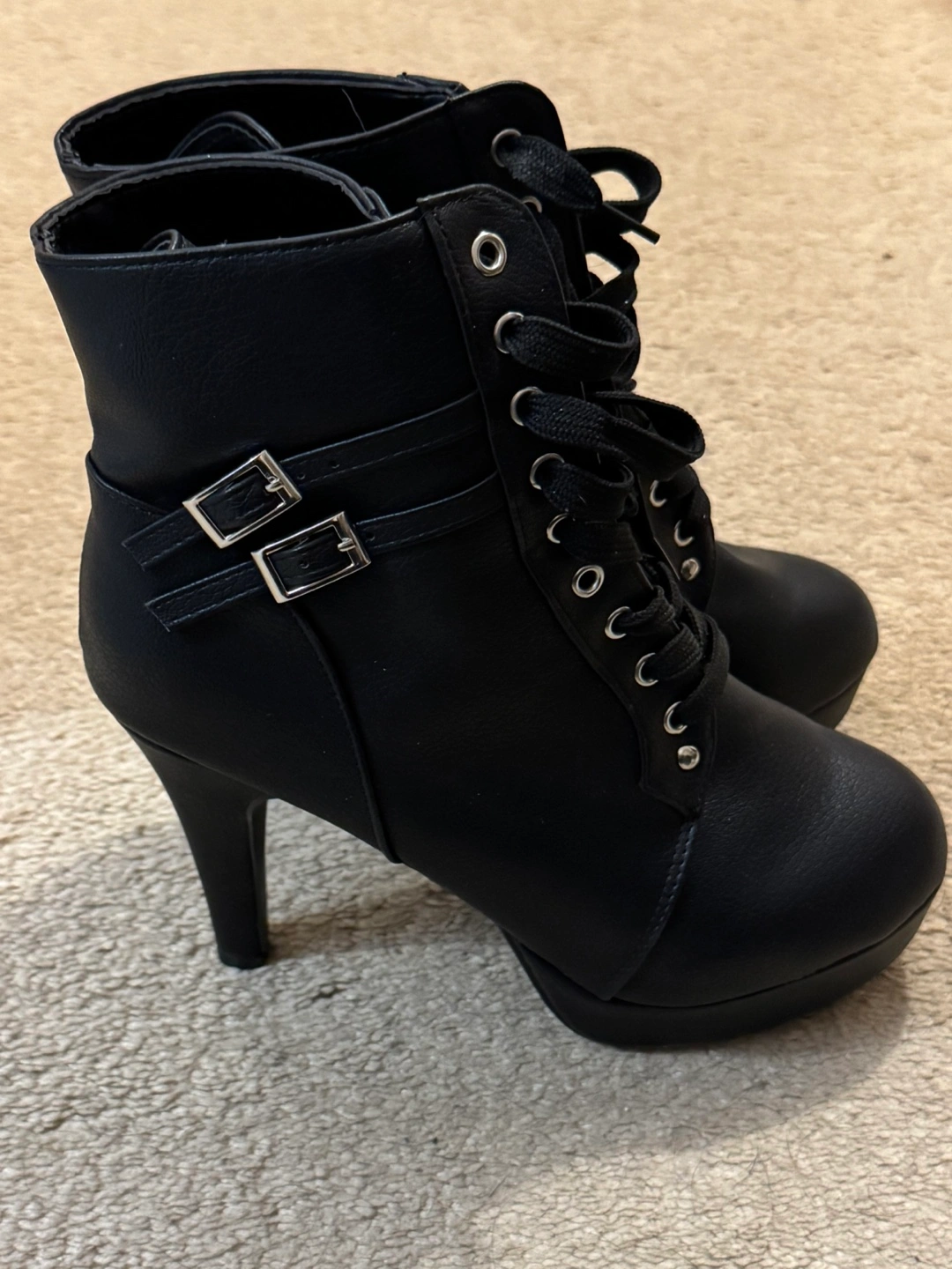 Women's black ankle boots. Features lace-up front and double buckles. High heels. Faux leather. States size 11 but closer to a 9.