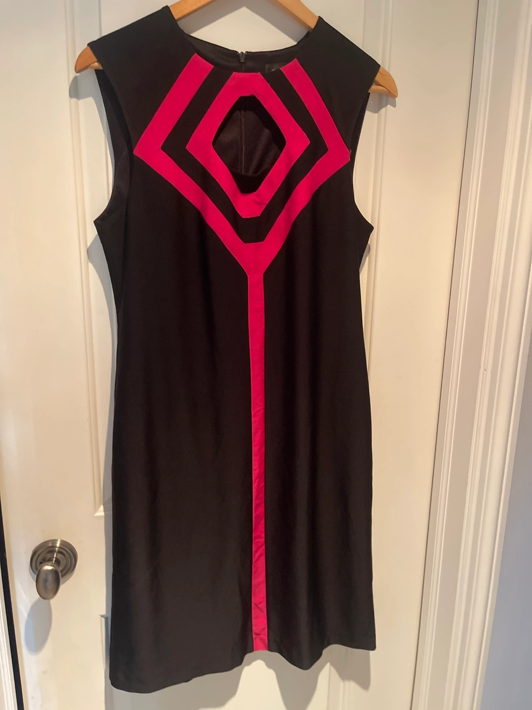 Stylish sleeveless dress. Black with hot pink geometric design. Keyhole neckline. Size 10. In great shape Pick up keele and Bloor