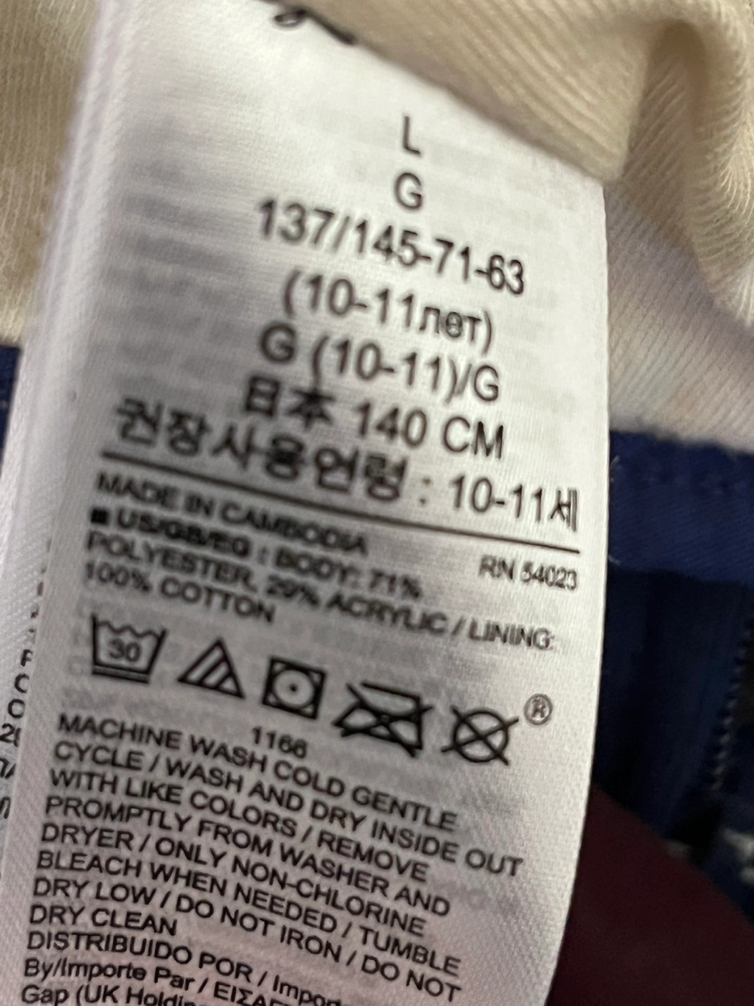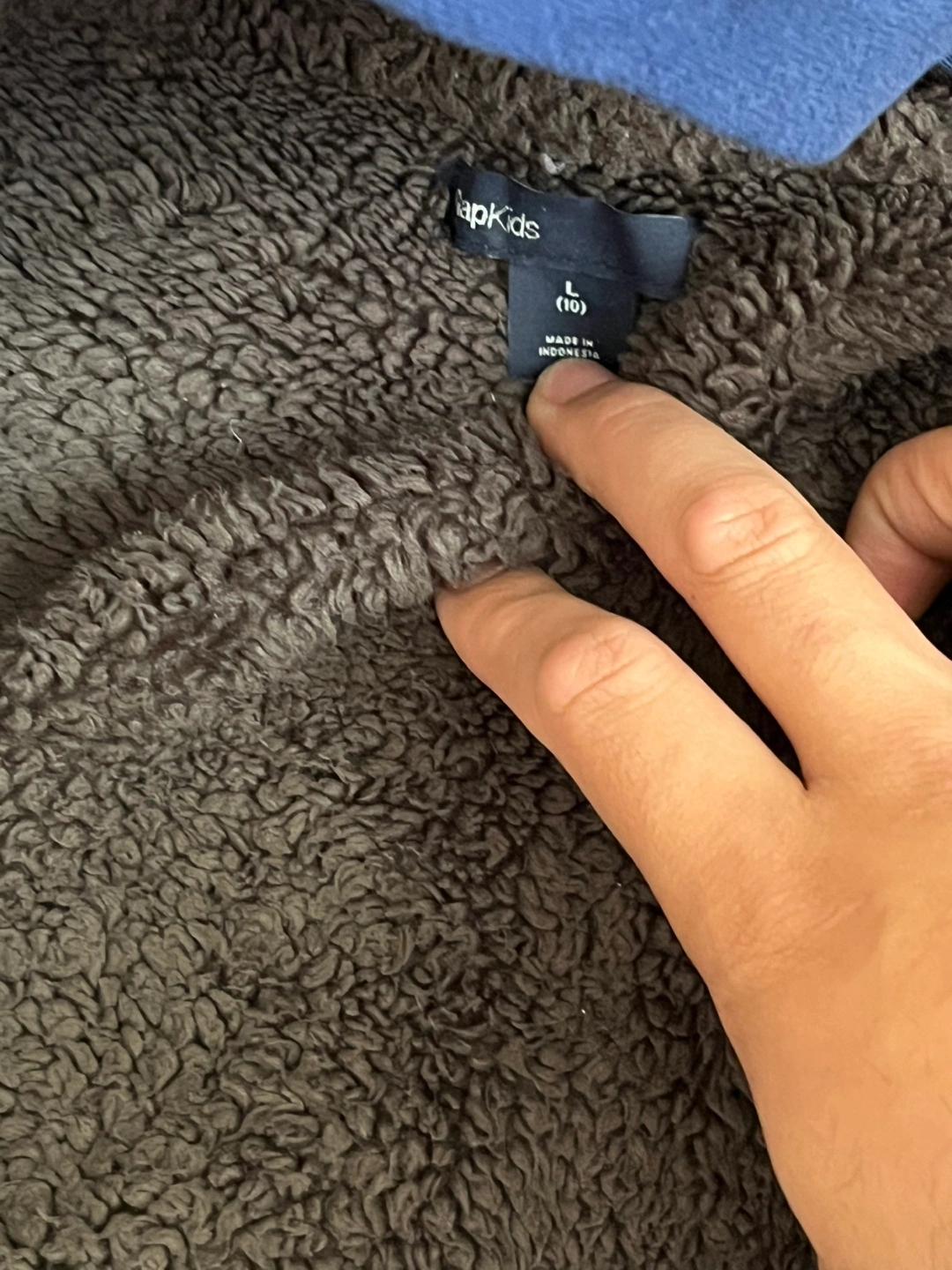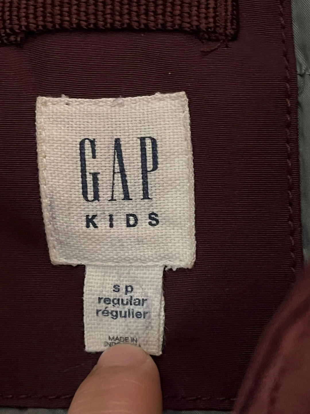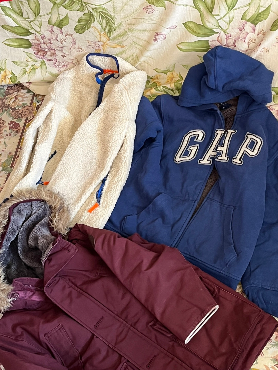 Three pieces of GAP Kids outerwear. A dark maroon winter coat, a navy blue zip-up hoodie, and a cream-coloured fleece jacket. All are in good used condition. Sizes in pictures