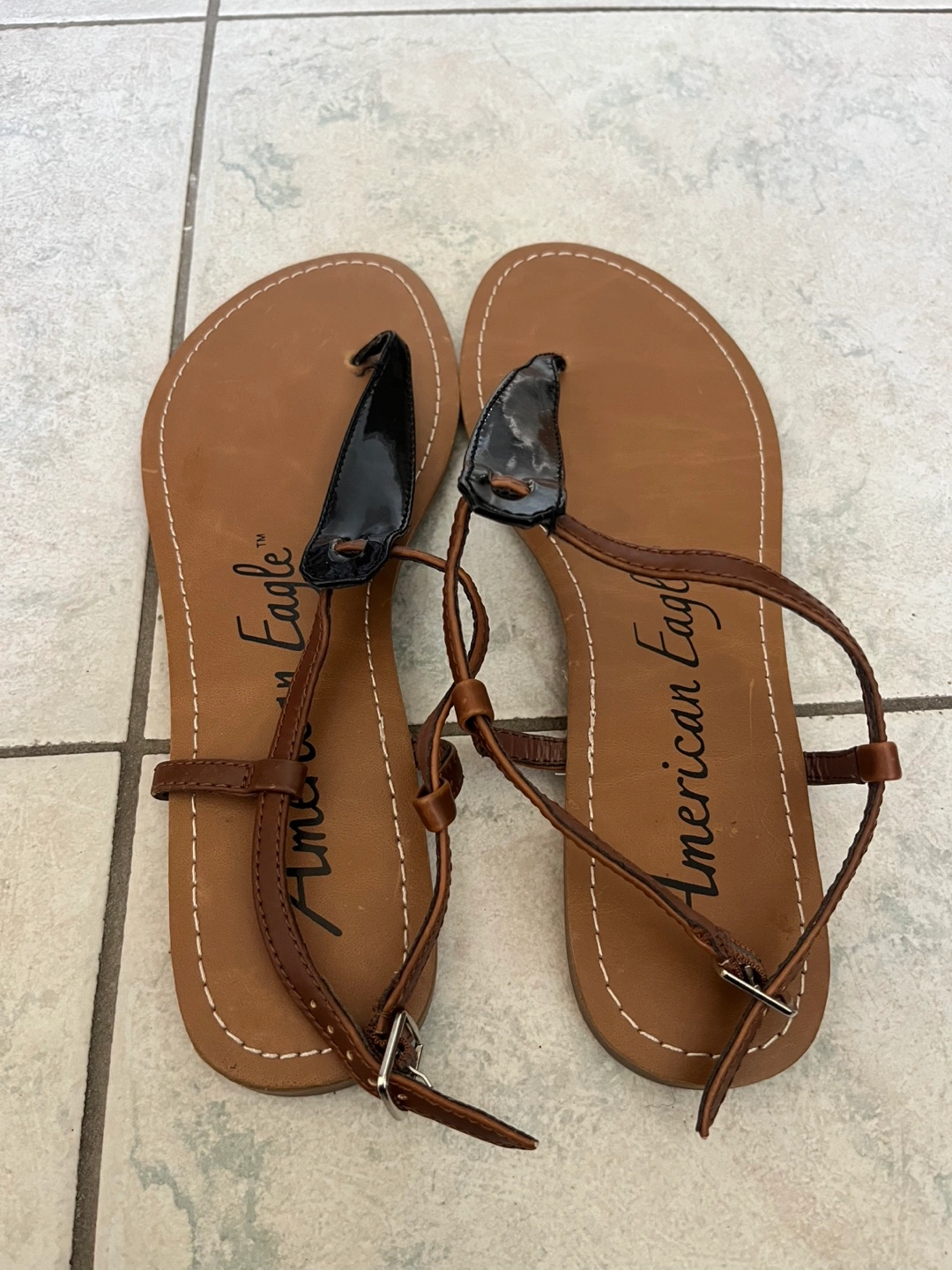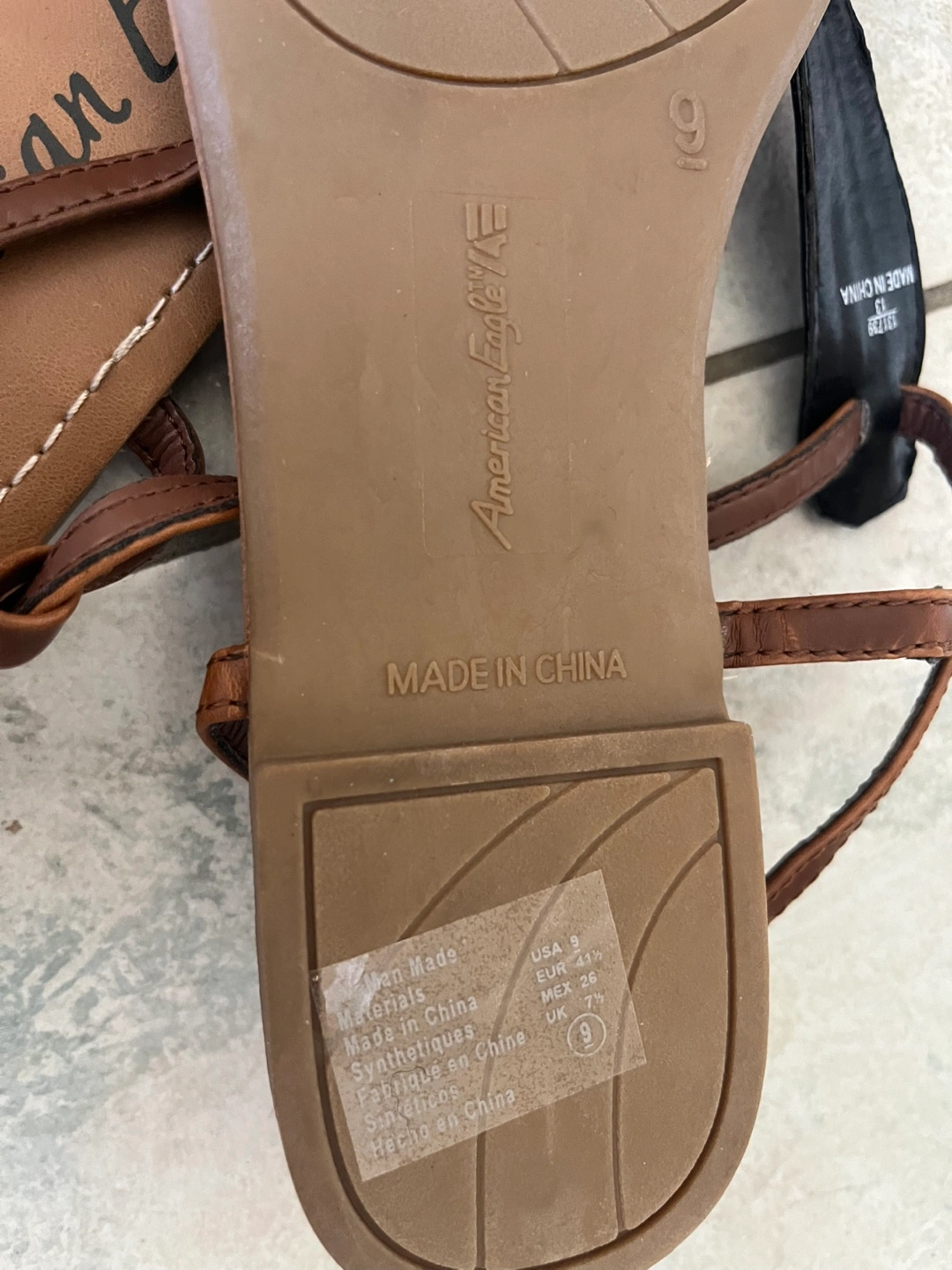 Brown leather flat sandals. Size 9. Ankle strap. Made in China.