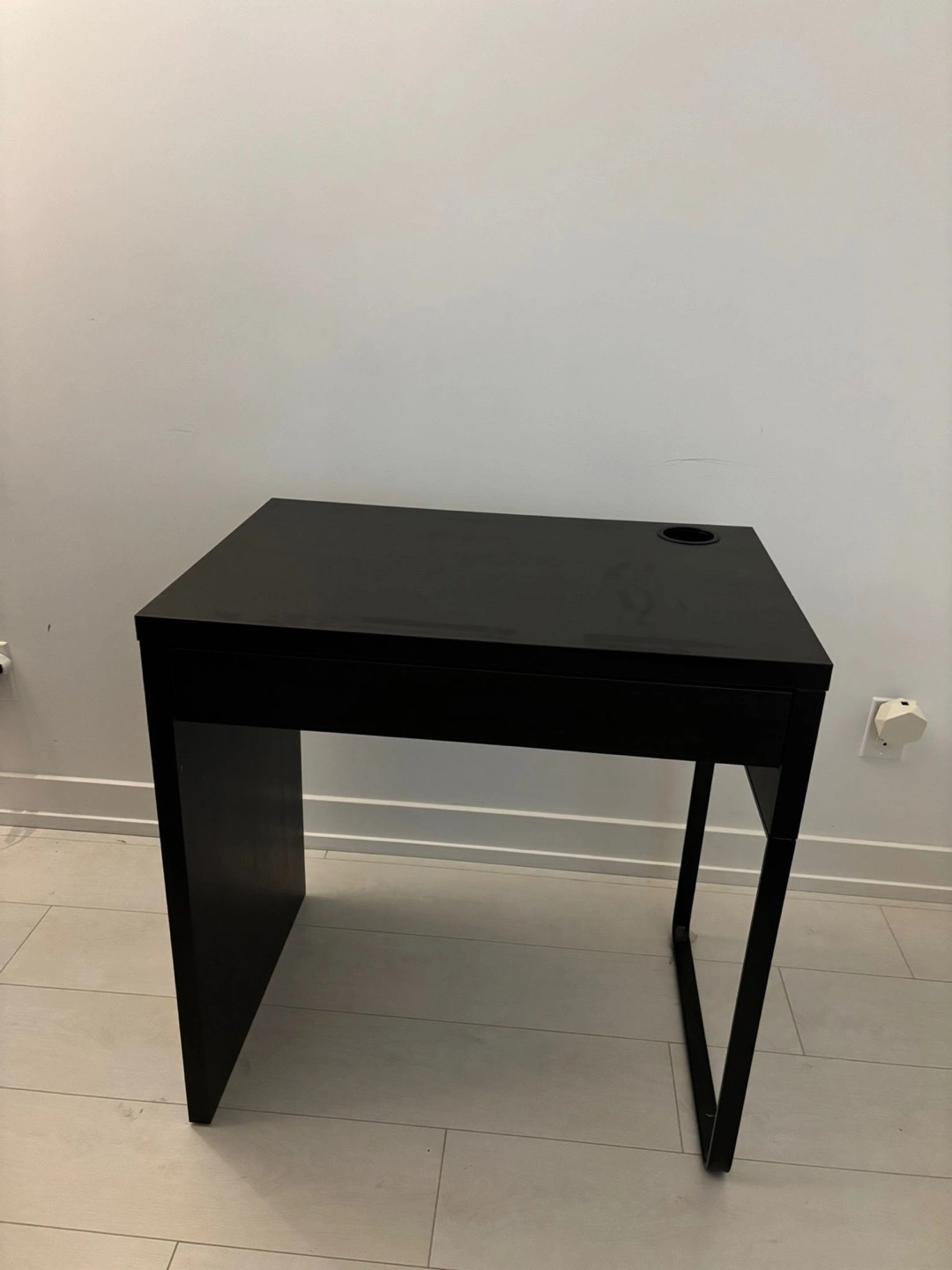 MICKE Desk, white, 73x50 cm (28 3/4x19 5/8 ") Small black desk. One drawer. Cup holder. Minimalist style. Good for small spaces. Pick up only near Altea Active Club, Liberty Village Cash Only