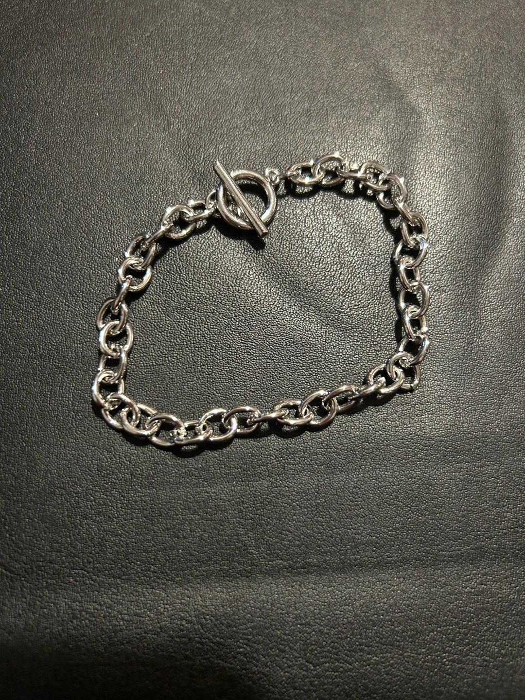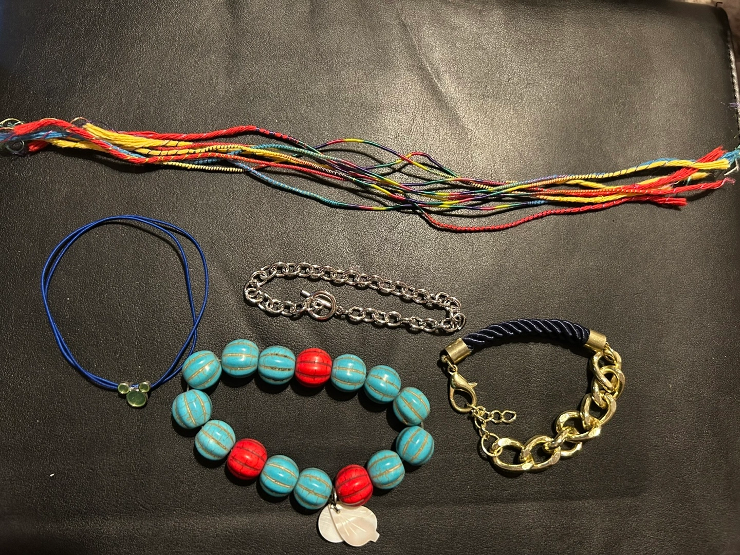 1. Turquoise and red bead stretch bracelet with seashell charm 2. Blue and gold chain and rope bracelet 3. Mickey Mouse stretch bracelet with charm 4. Silver chain bracelet 5. 8 friendship string bracelets (bought in Italy)