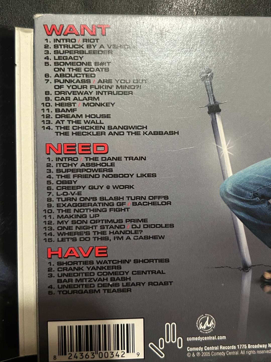 Dane Cook stand-up comedy. Includes CD and DVD. CD features many tracks. DVD includes Comedy Central Presents and full-length uncut versions. Pre-owned.
