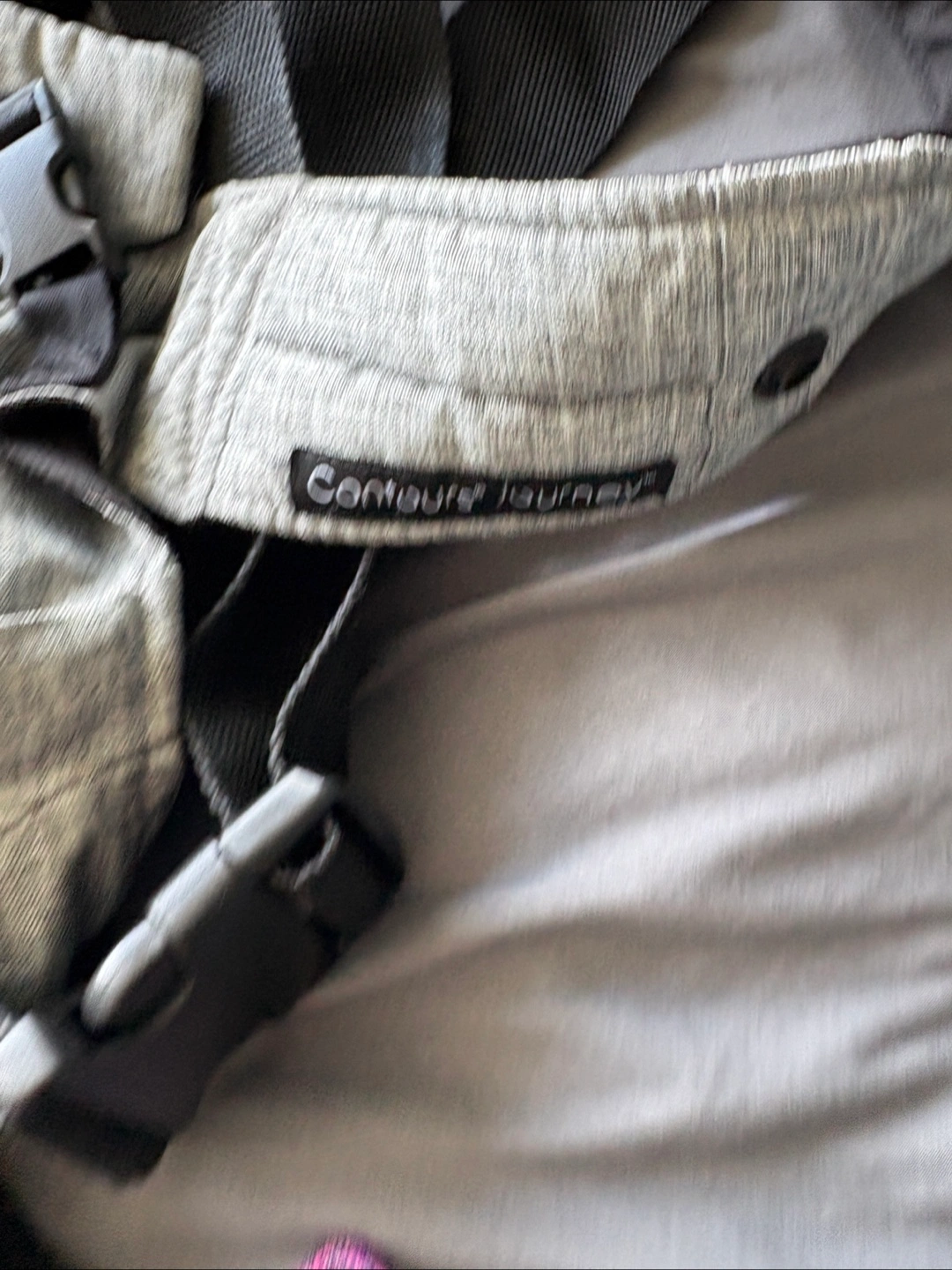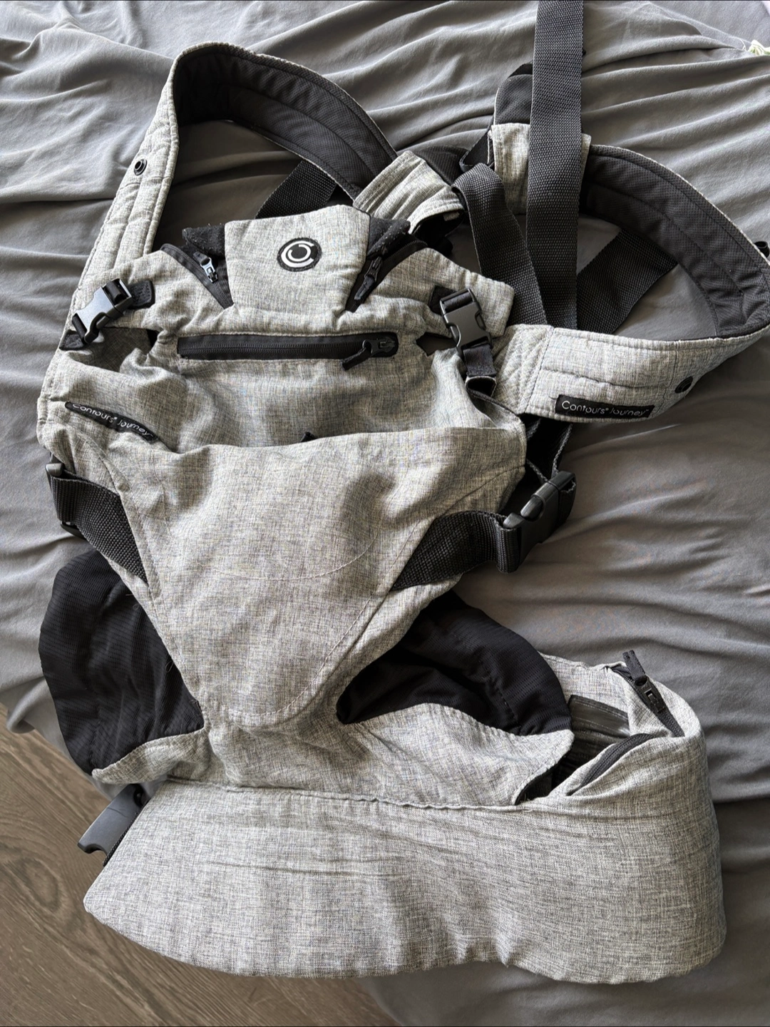 Grey baby carrier. Multiple carrying positions. Adjustable straps. Good condition.