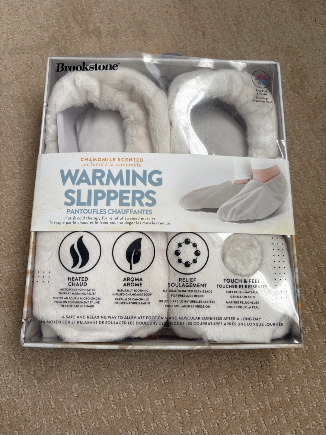 Chamomile scented warming slippers. Hot & cold therapy for strained muscles. Reduces inflammation and pain. Soft plush material. Micromassaging beads. Use for aromatherapy.