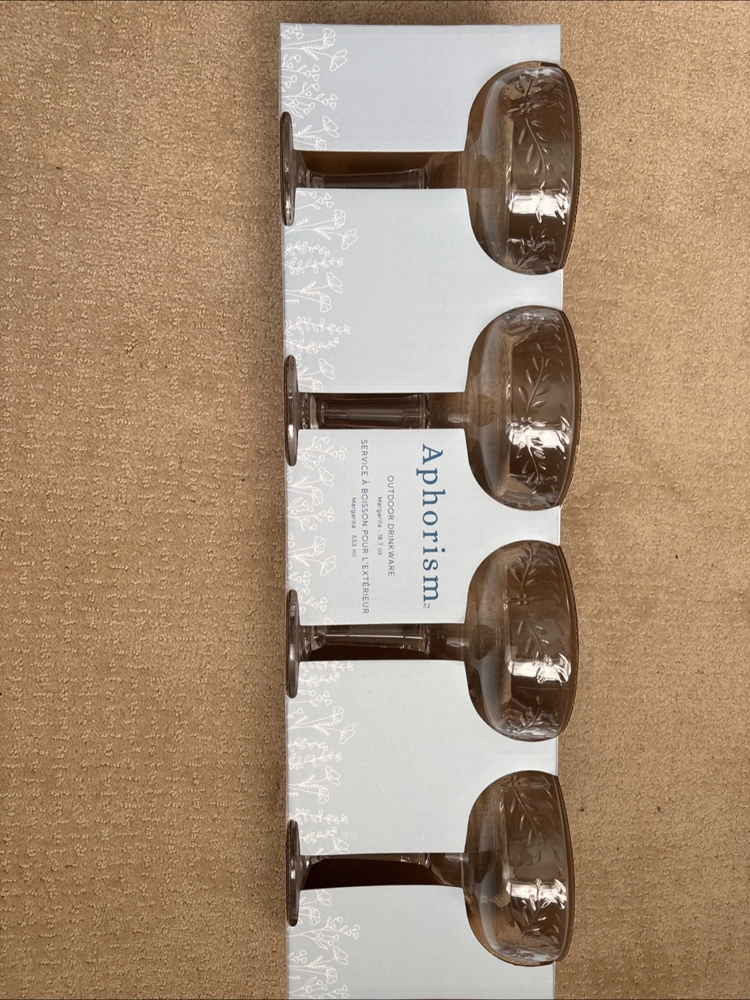 Set of four Aphorism outdoor margarita glasses. 18.7 oz capacity. Etched floral design. New in box.